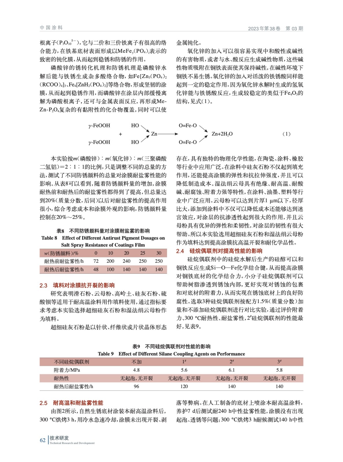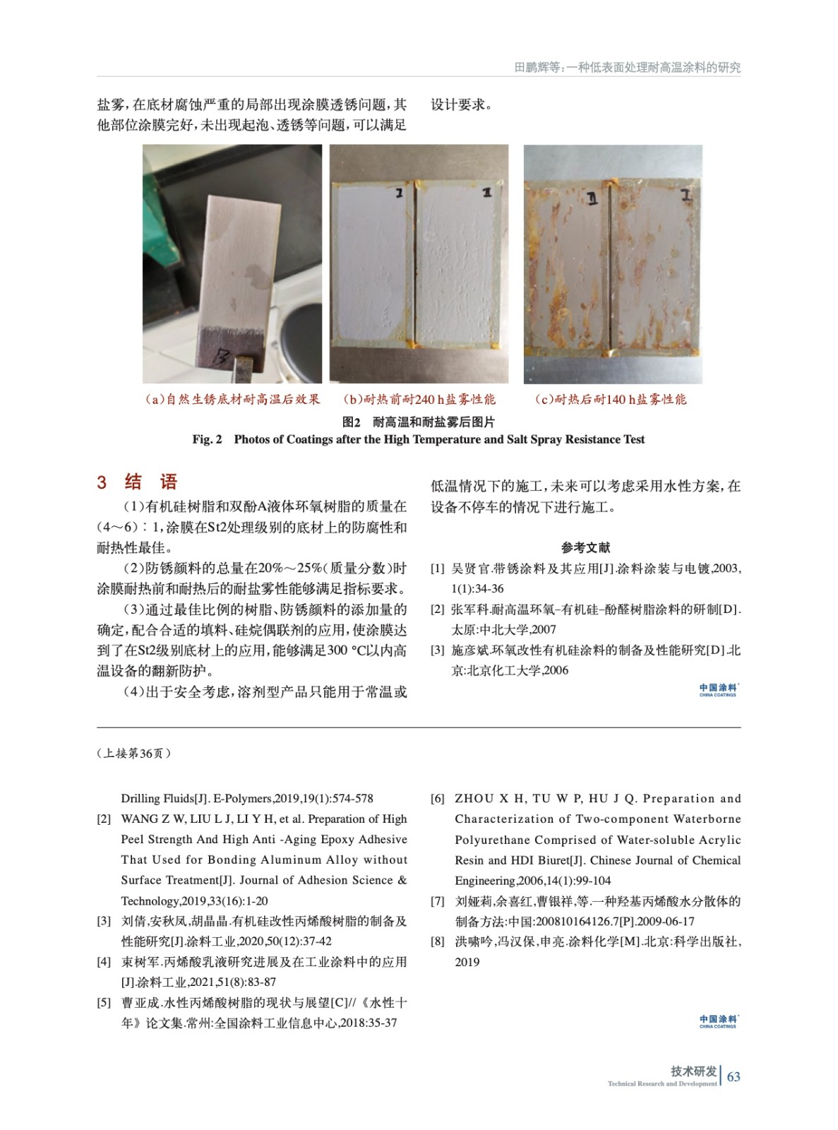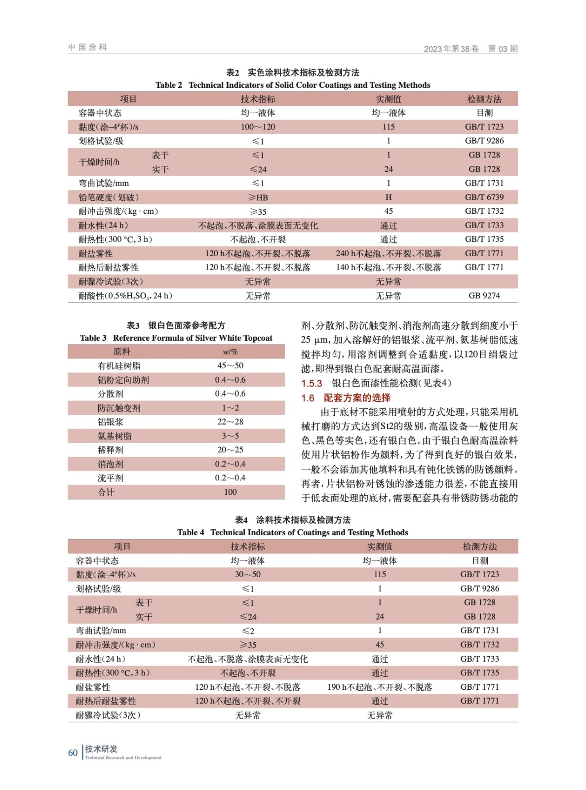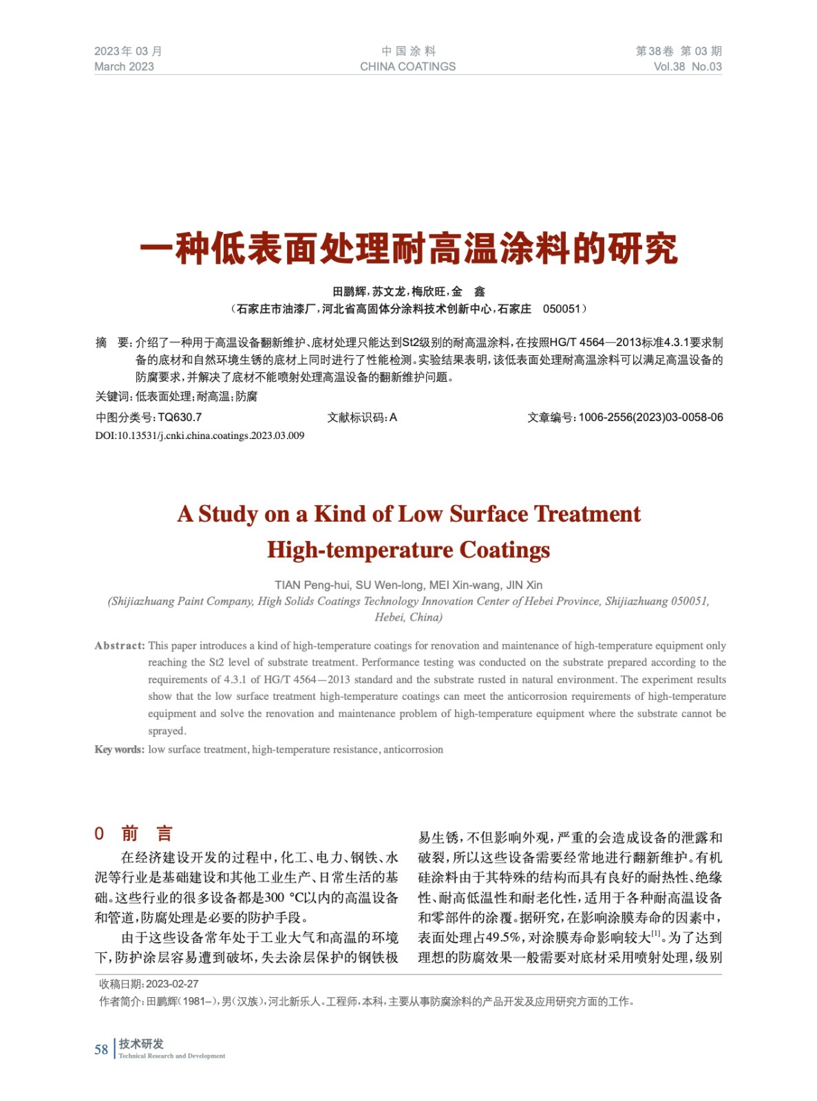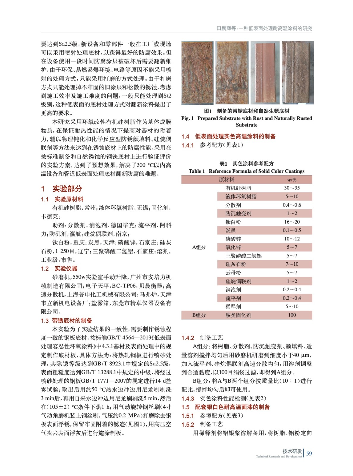 介紹了一種用于高溫設備翻新維護、底材處理只能達到St2級別的耐高溫涂料,在按照HG/T 4564—2013標準4.3.1要求制備的底材和自然環境生銹的底材上同時進行了性能檢測。實驗結果表明,該低表面處理耐高溫涂料可以滿足高溫設備的防腐要求,并解決了底材不能噴射處理高溫設備的翻新維護問題。