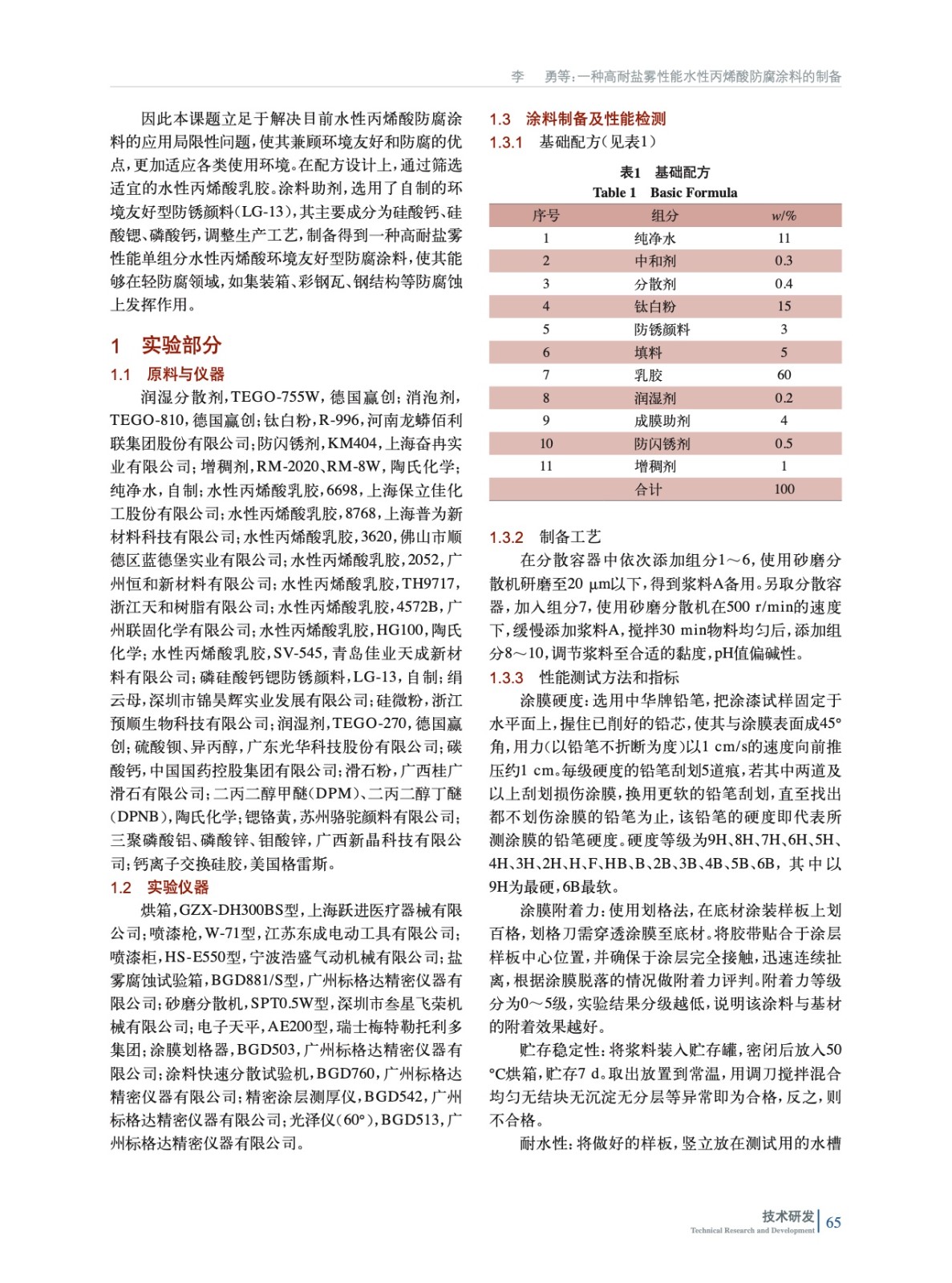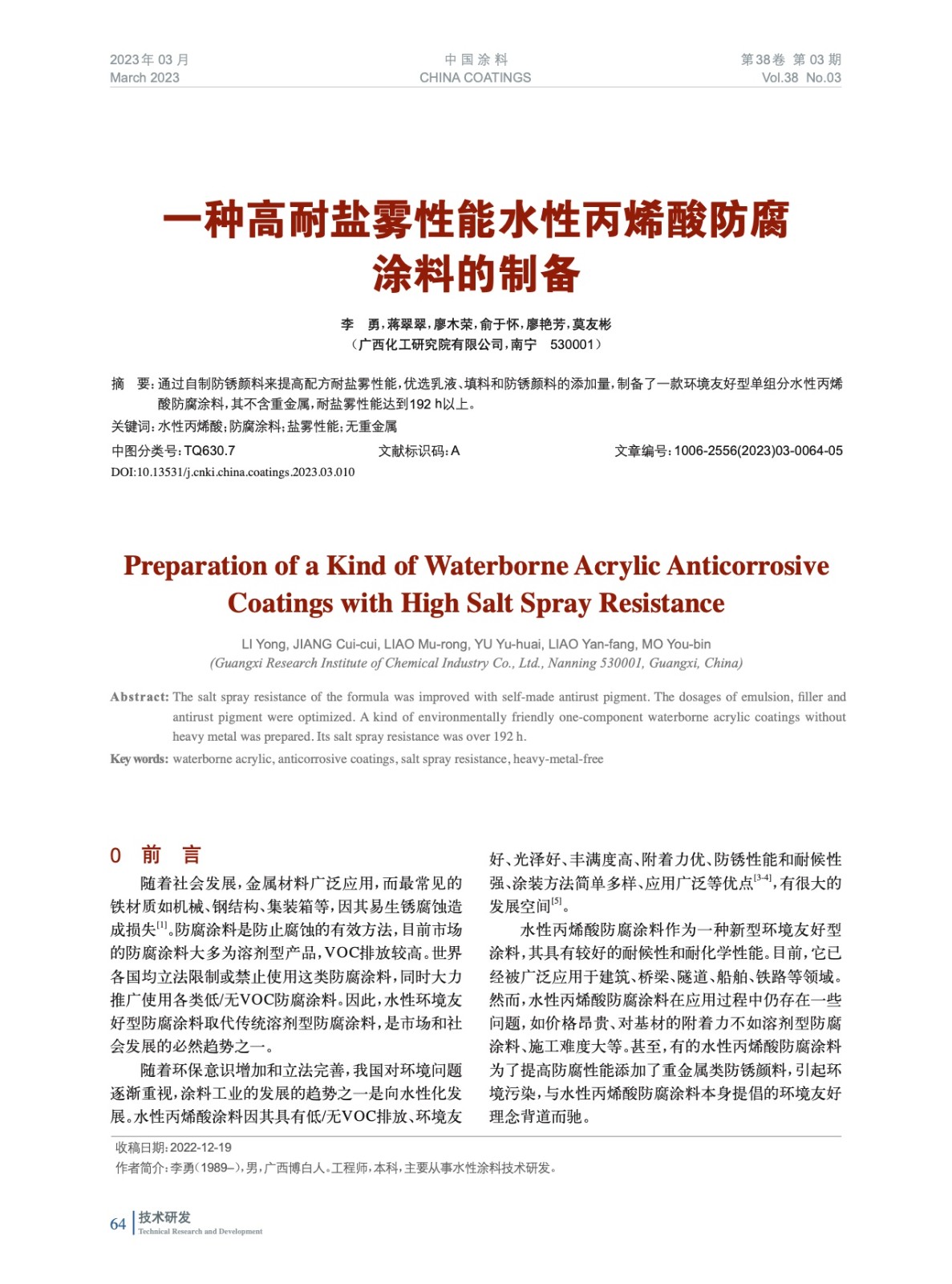 通過自制防銹顏料來提高配方耐鹽霧性能,優選乳液、填料和防銹顏料的添加量,制備了一款環境友好型單組分水性丙烯酸防腐涂料,其不含重金屬,耐鹽霧性能達到192 h以上。