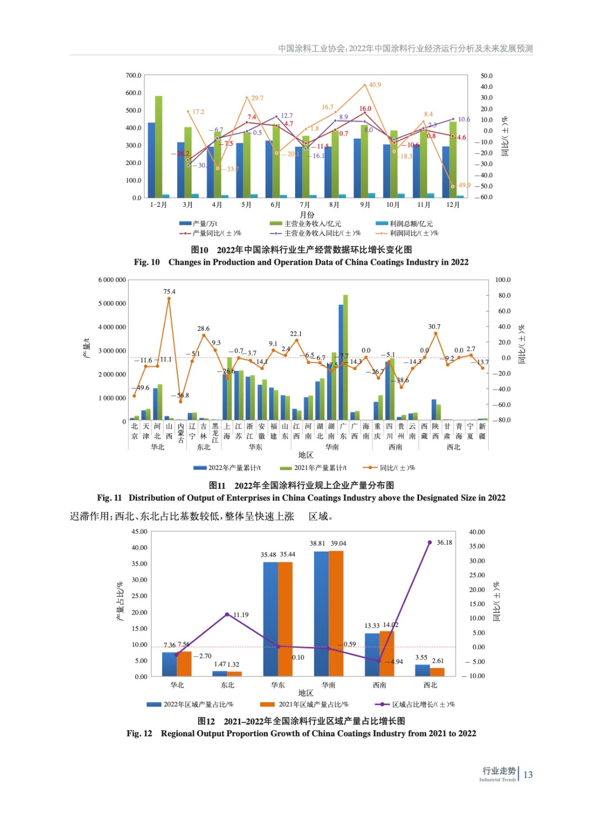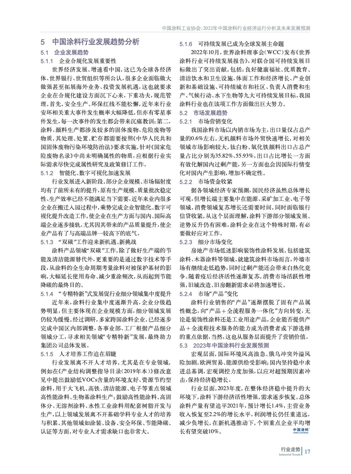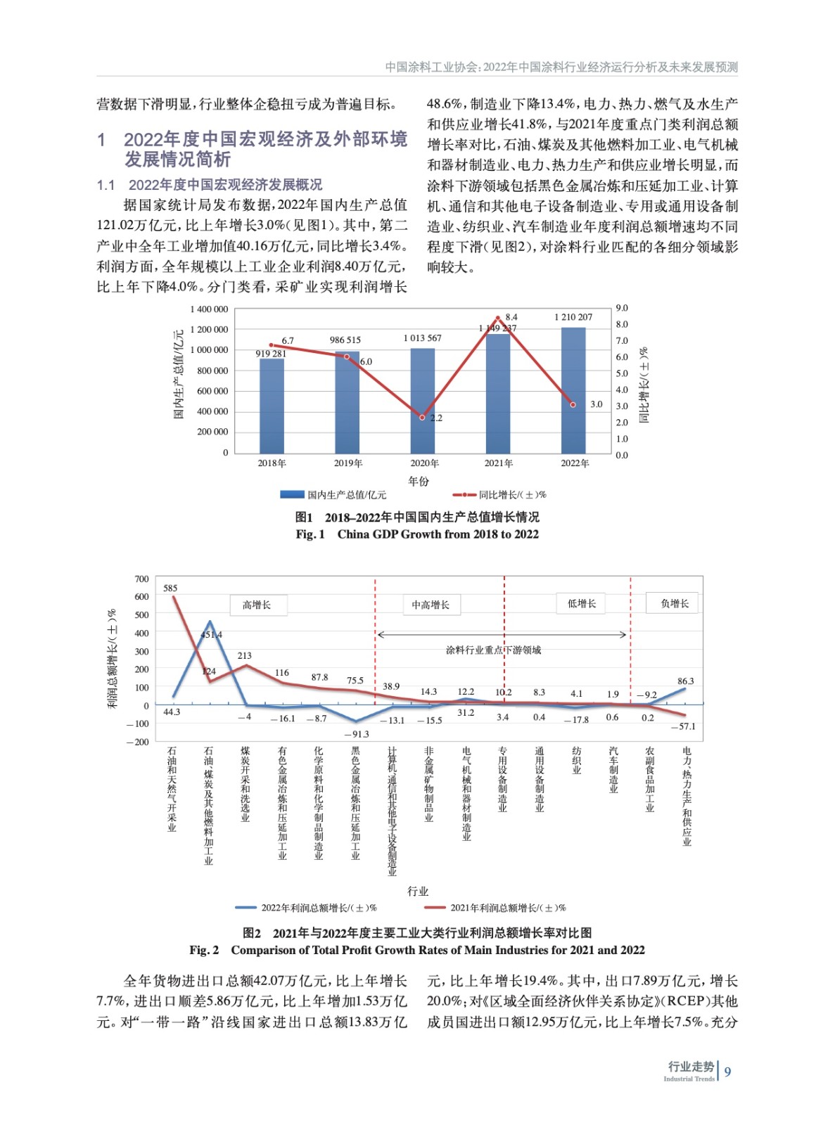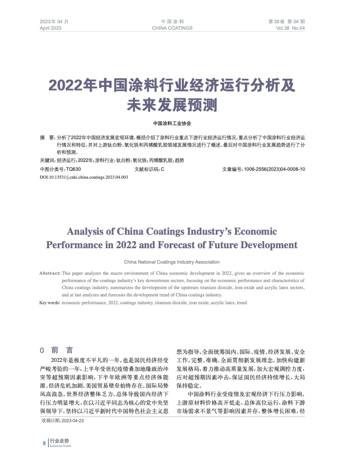 摘要:分析了2022年中國(guó)經(jīng)濟(jì)發(fā)展宏觀環(huán)境,概括介紹了涂料行業(yè)重點(diǎn)下游行業(yè)經(jīng)濟(jì)運(yùn)行情況,重點(diǎn)分析了中國(guó)涂料行業(yè)經(jīng)濟(jì)運(yùn)行情況和特征,并對(duì)上游鈦白粉、氧化鐵和丙烯酸乳膠領(lǐng)域發(fā)展情況進(jìn)行了概述。最后對(duì)中國(guó)涂料行業(yè)發(fā)展趨勢(shì)進(jìn)行了分析和預(yù)測(cè)。