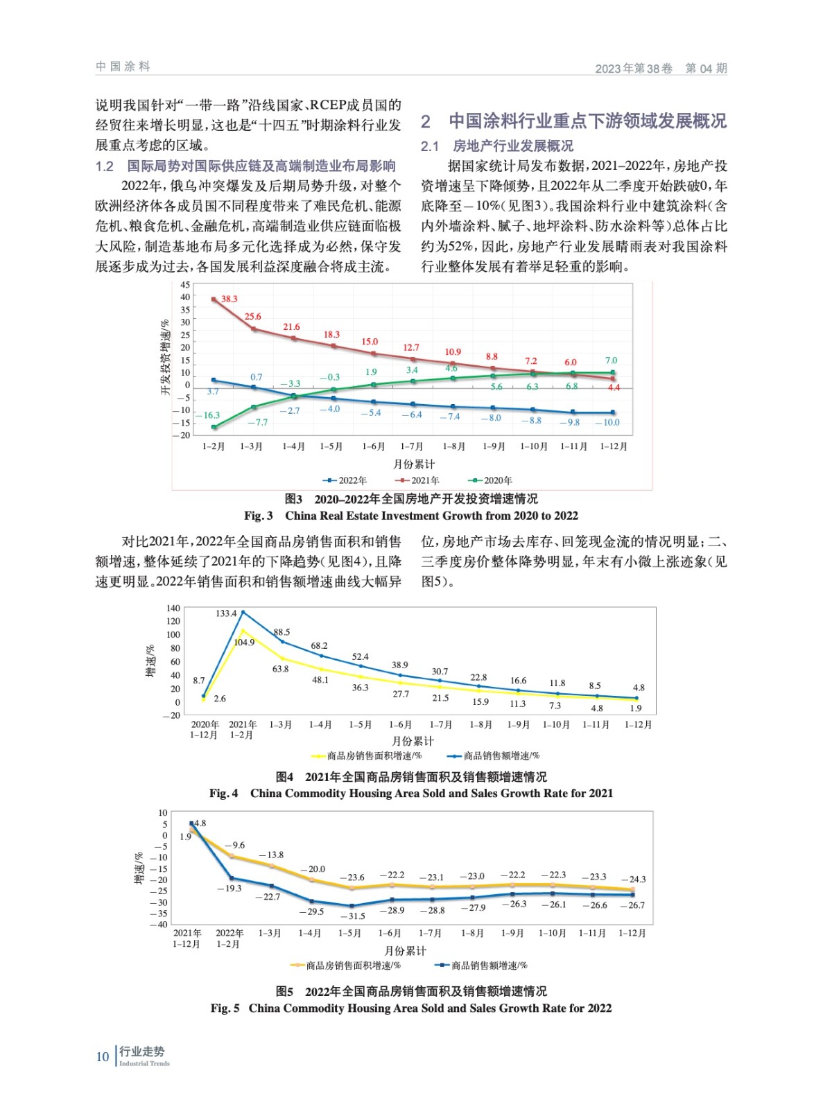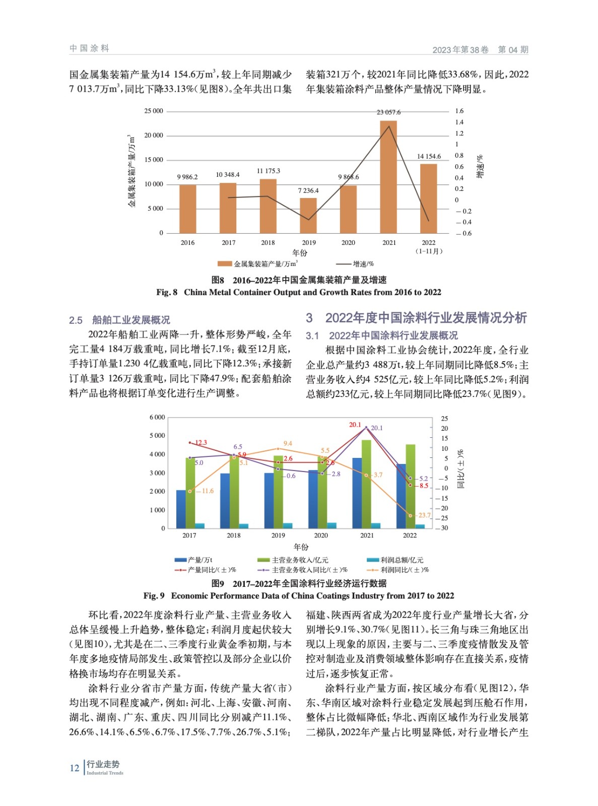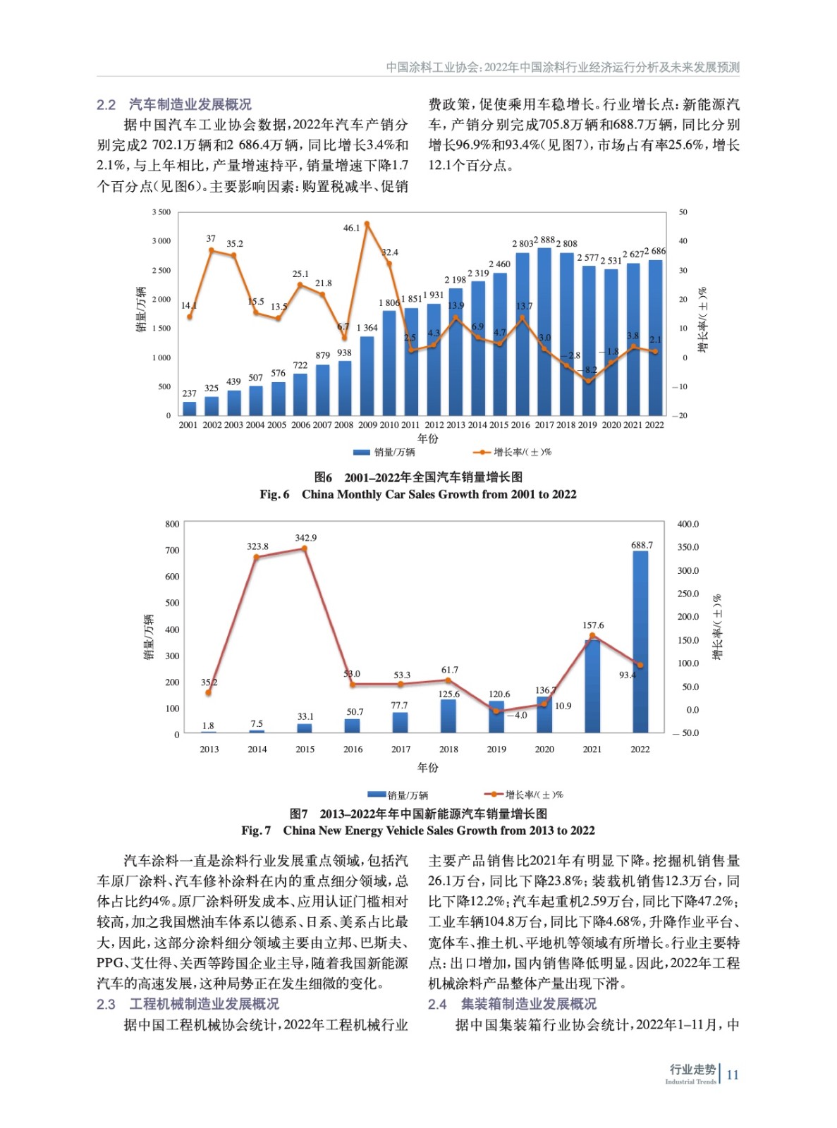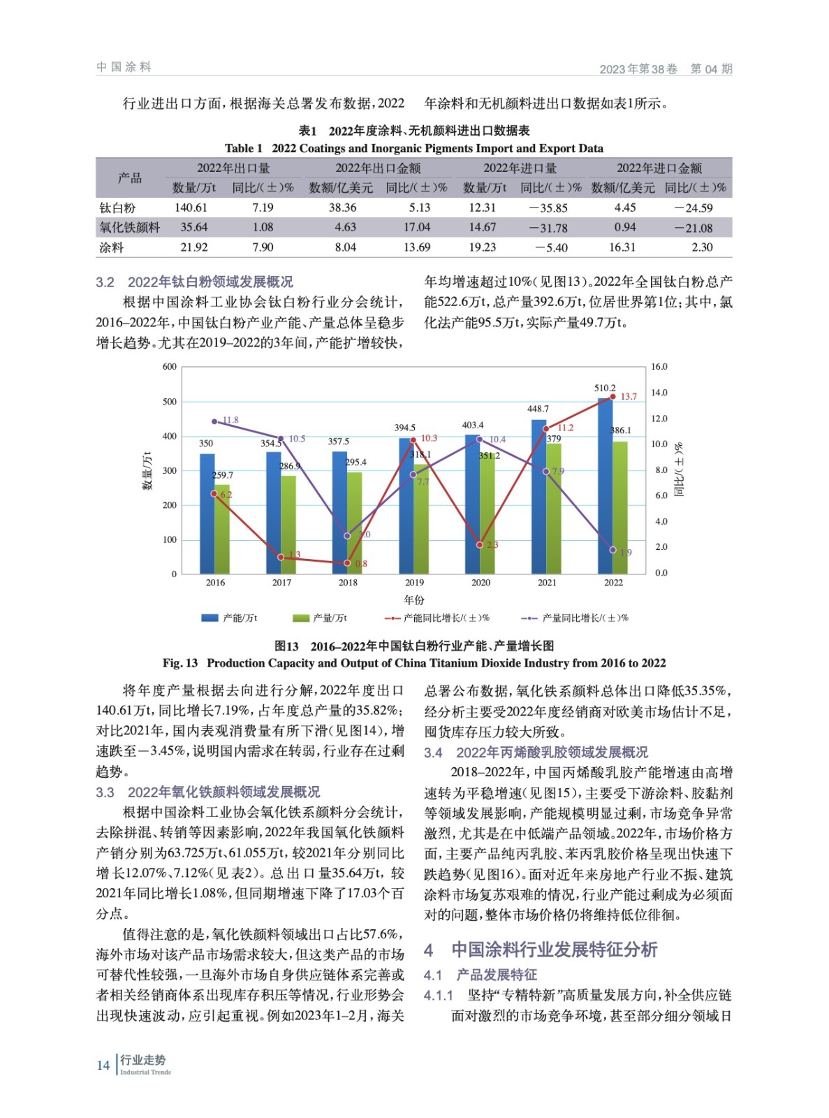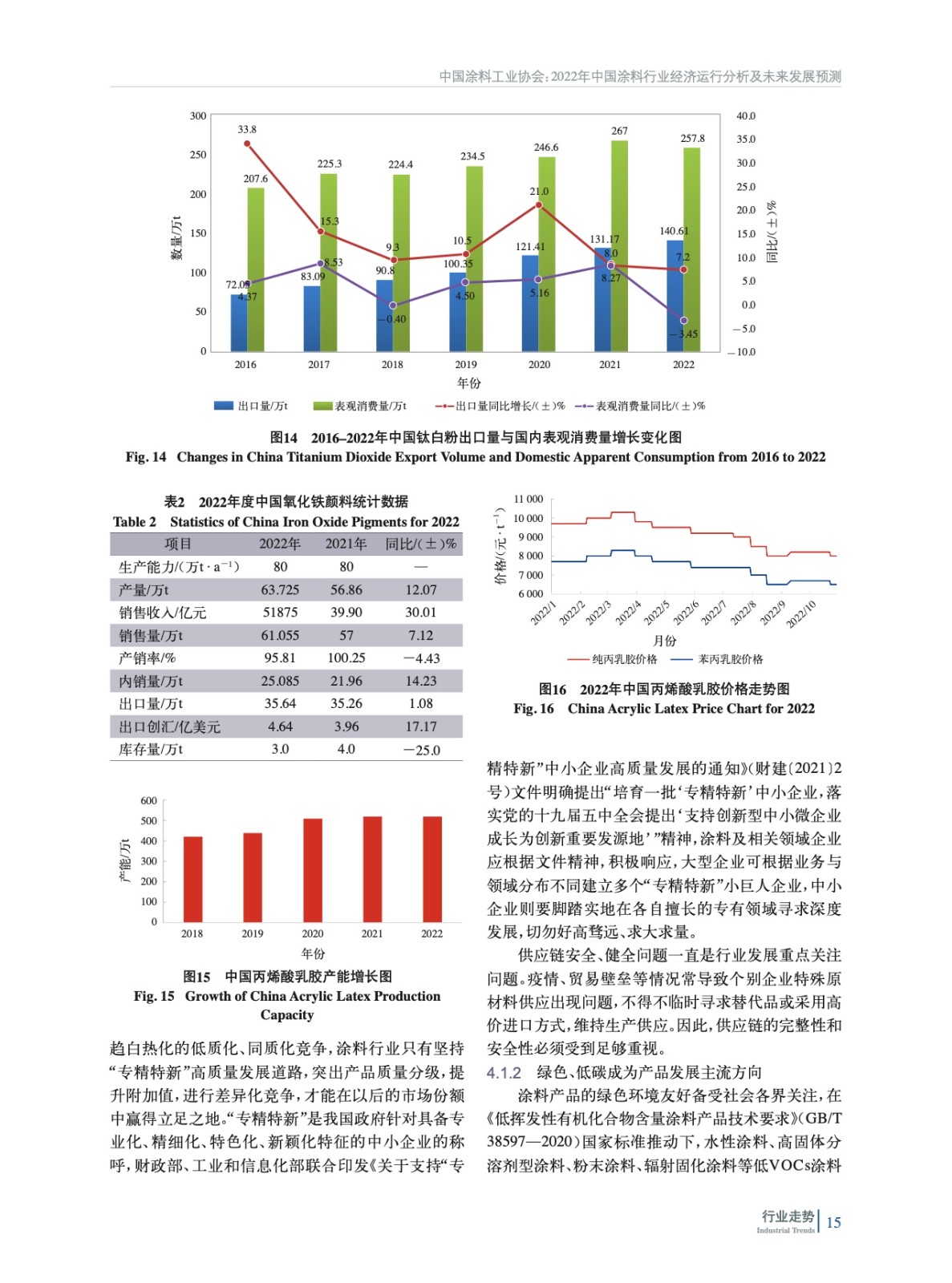 摘要:分析了2022年中國(guó)經(jīng)濟(jì)發(fā)展宏觀環(huán)境,概括介紹了涂料行業(yè)重點(diǎn)下游行業(yè)經(jīng)濟(jì)運(yùn)行情況,重點(diǎn)分析了中國(guó)涂料行業(yè)經(jīng)濟(jì)運(yùn)行情況和特征,并對(duì)上游鈦白粉、氧化鐵和丙烯酸乳膠領(lǐng)域發(fā)展情況進(jìn)行了概述。最后對(duì)中國(guó)涂料行業(yè)發(fā)展趨勢(shì)進(jìn)行了分析和預(yù)測(cè)。