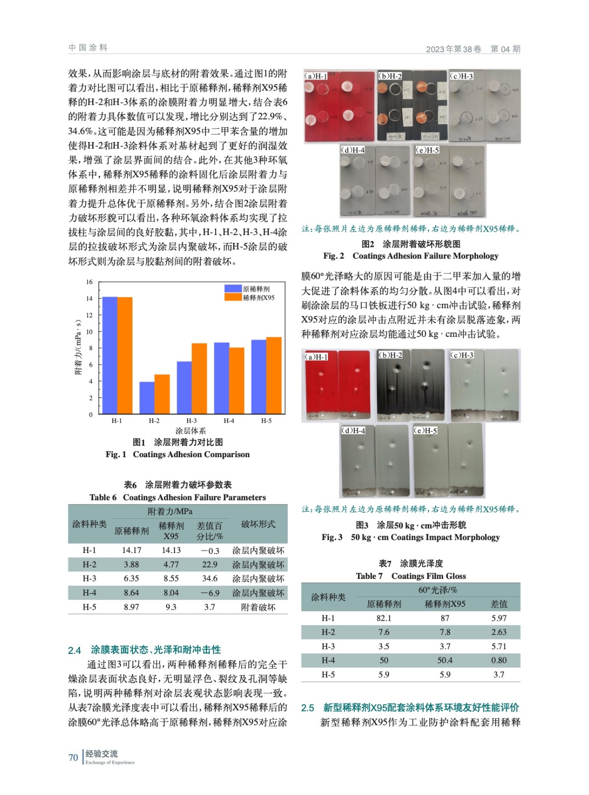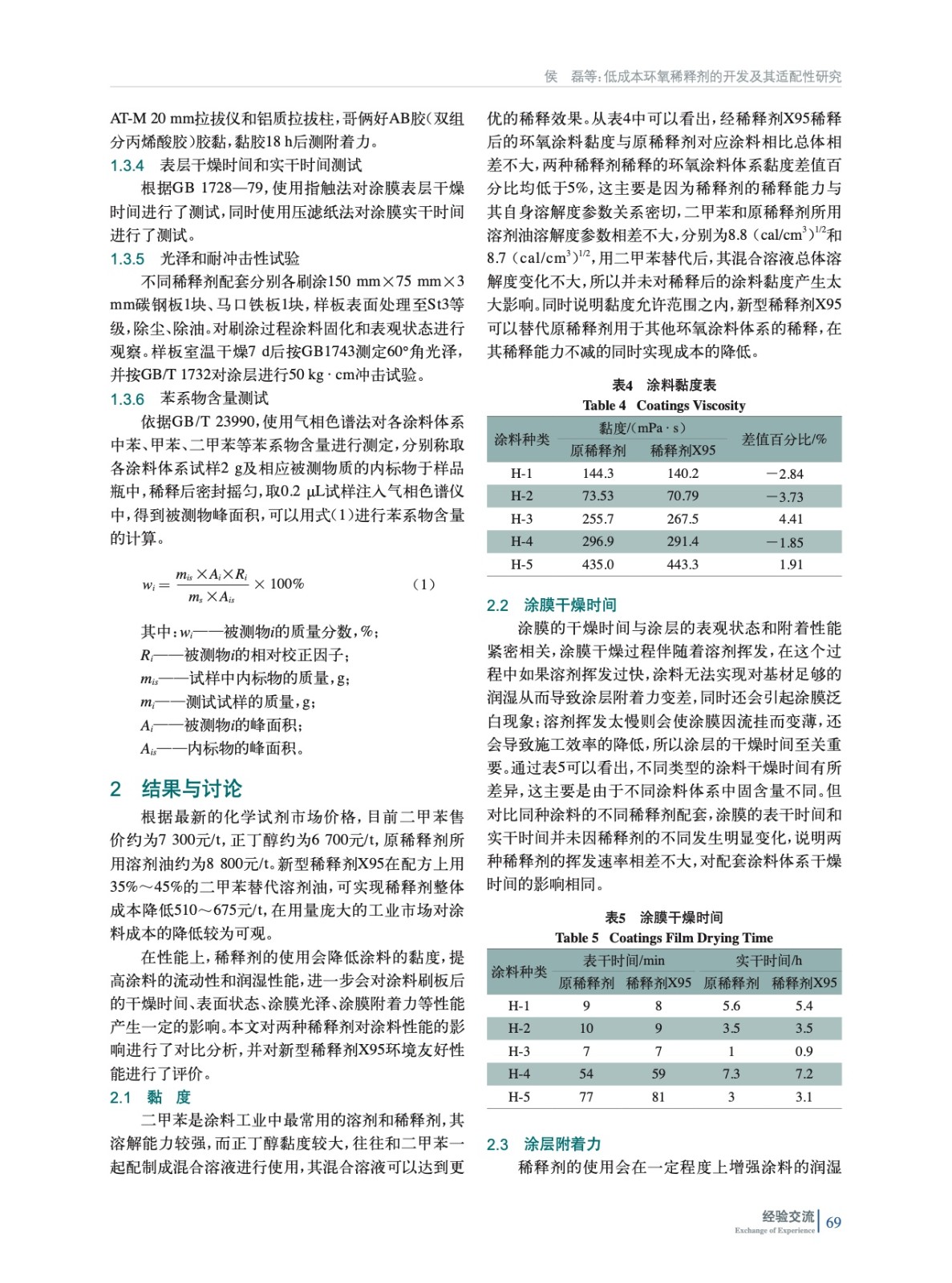 摘要:為降低涂料用稀釋劑成本,滿足工業(yè)涂料發(fā)展的需要,實驗開發(fā)出一種低成本的環(huán)氧稀釋劑(X95),并對其稀釋后涂料的黏度及涂層的表觀狀態(tài)、附著力、耐沖擊等性能進行了研究。研究發(fā)現(xiàn),相比于原稀釋劑,稀釋劑X95對應(yīng)涂層附著力和60°光澤相對較高,涂層表面無明顯缺陷,50 kg·cm沖擊試驗后涂層無脫落,總體表現(xiàn)出比原稀釋劑更低的成本和更優(yōu)的適配性。