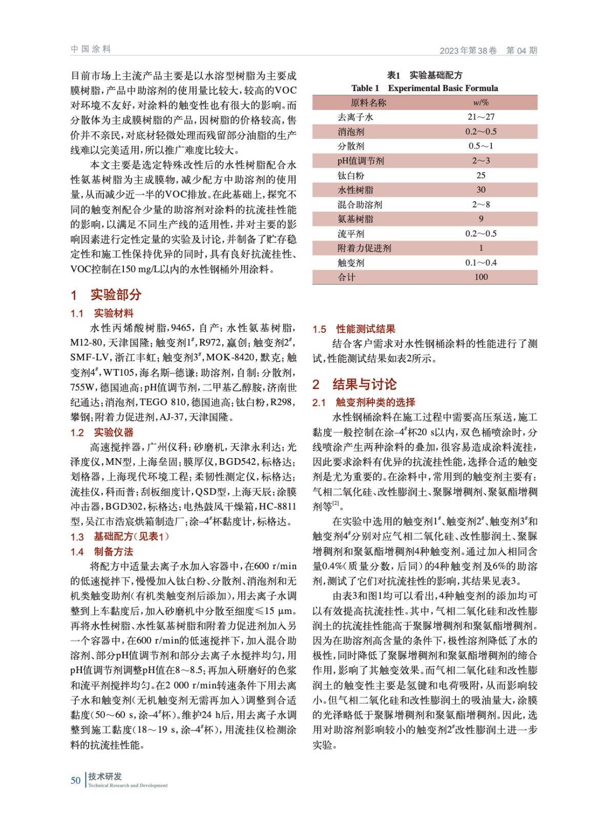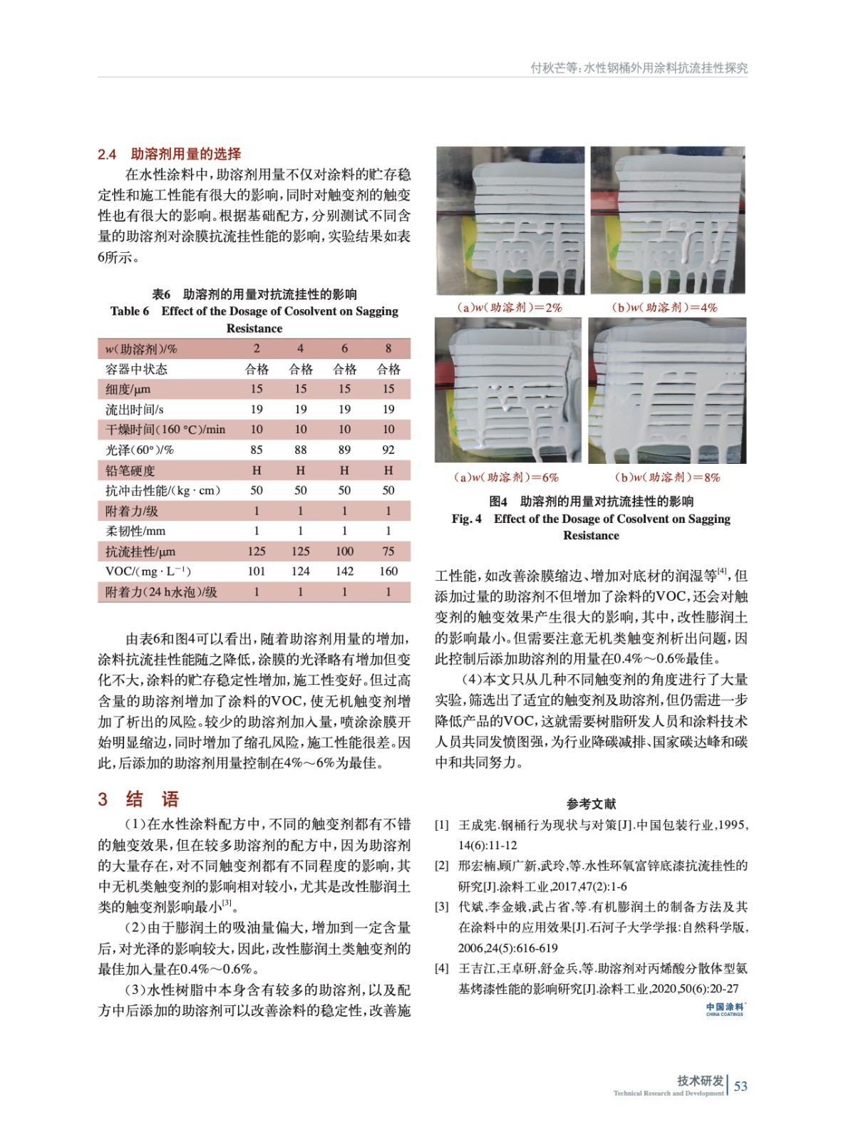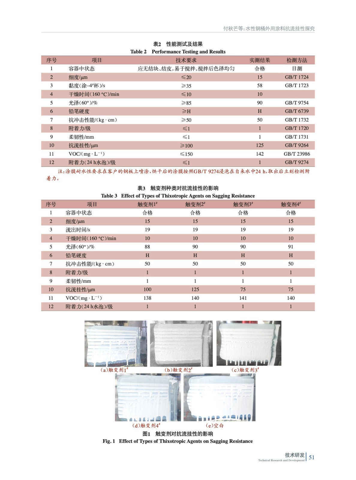 摘要:以水性樹脂和水性氨基樹脂為主要成膜物,搭配觸變劑并通過控制體系的pH值,制備了抗流掛性能良好的水性鋼桶用涂料。考察了觸變劑種類和用量以及不同含量的助溶劑對水性鋼桶用涂料抗流掛性能的影響。結(jié)果表明:在水性樹脂和水性氨基樹脂作為成膜物時,搭配改性膨潤土類的觸變劑,控制后添加助溶劑的質(zhì)量分數(shù)在8%~12%時,涂膜的抗流掛性能達到100 μm以上。