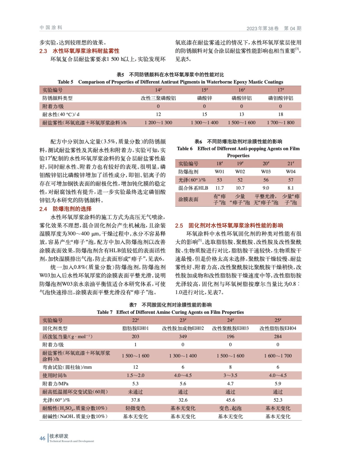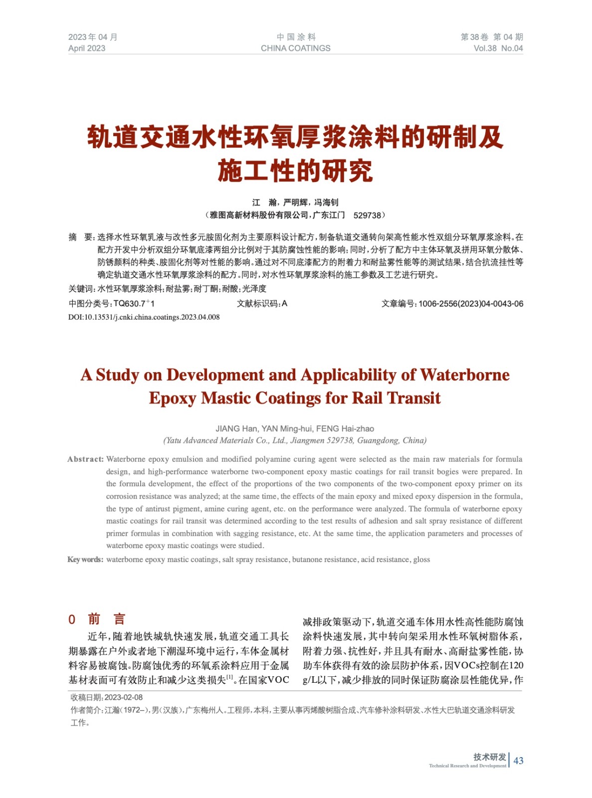 摘要:選擇水性環(huán)氧乳液與改性多元胺固化劑為主要原料設(shè)計(jì)配方,制備軌道交通轉(zhuǎn)向架高性能水性雙組分環(huán)氧厚漿涂料。在配方開發(fā)中分析雙組分環(huán)氧底漆兩組分比例對(duì)于其防腐蝕性能的影響;同時(shí),分析了配方中主體環(huán)氧及拼用環(huán)氧分散體、防銹顏料的種類、胺固化劑等對(duì)性能的影響。通過(guò)對(duì)不同底漆配方的附著力和耐鹽霧性能等的測(cè)試結(jié)果,結(jié)合抗流掛性等確定軌道交通水性環(huán)氧厚漿涂料的配方。同時(shí),對(duì)水性環(huán)氧厚漿涂料的施工參數(shù)及工藝進(jìn)行研究。