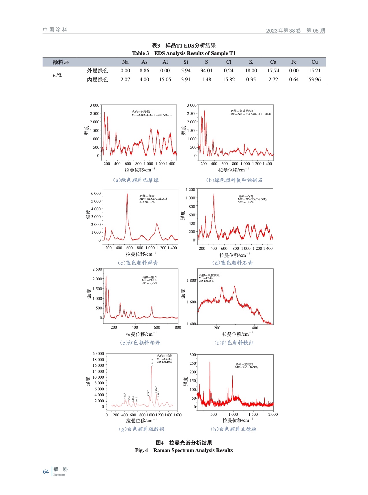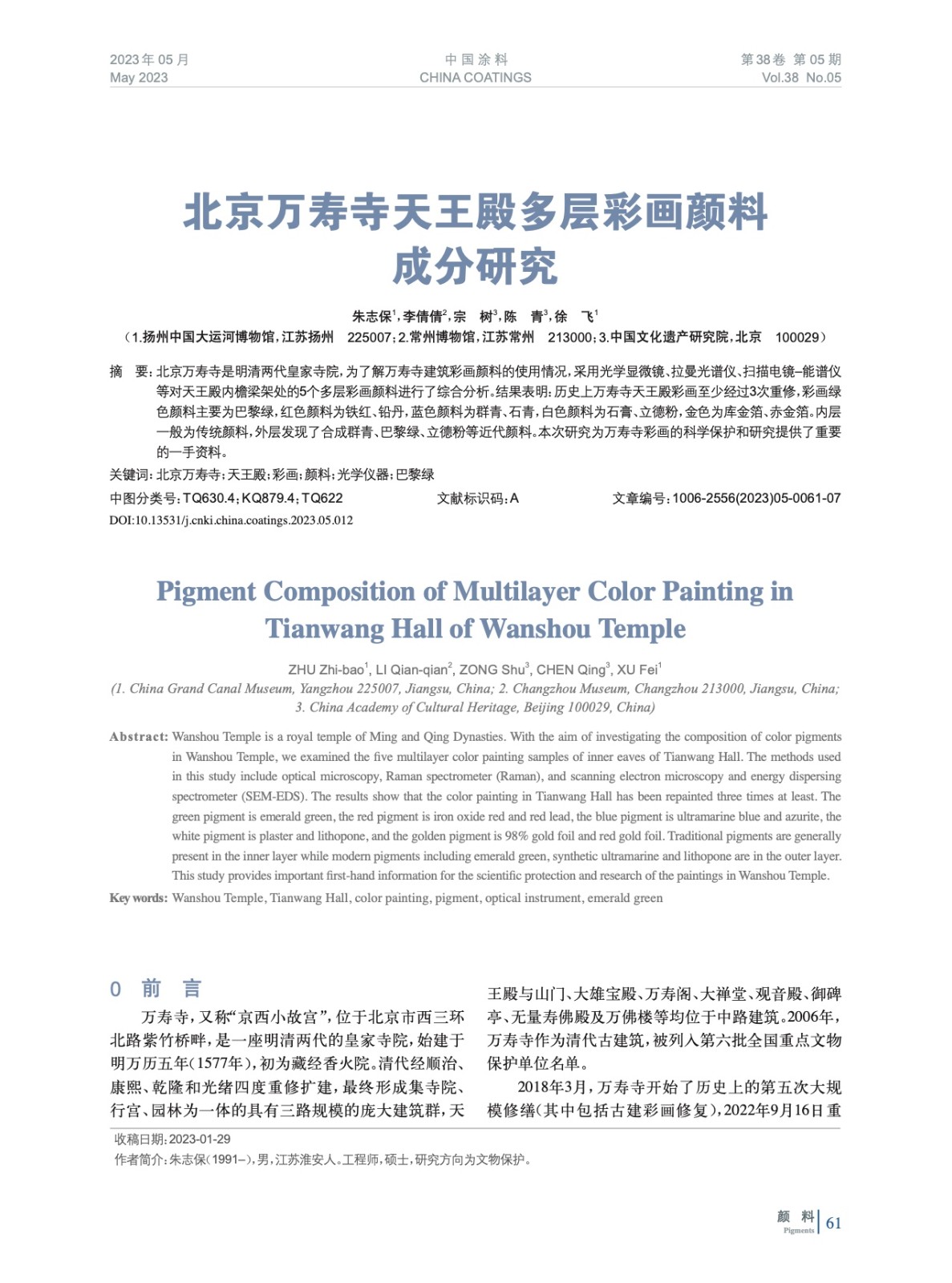 摘要:北京萬壽寺是明清兩代皇家寺院,為了解萬壽寺建筑彩畫顏料的使用情況,采用光學(xué)顯微鏡、拉曼光譜儀、掃描電鏡–能譜儀等對天王殿內(nèi)檐梁架處的5個(gè)多層彩畫顏料進(jìn)行了綜合分析。結(jié)果表明:歷史上萬壽寺天王殿彩畫至少經(jīng)過3次重修,彩畫綠色顏料主要為巴黎綠,紅色顏料為鐵紅、鉛丹,藍(lán)色顏料為群青、石青,白色顏料為石膏、立德粉,金色為庫金箔、赤金箔。內(nèi)層一般為傳統(tǒng)顏料,外層發(fā)現(xiàn)了合成群青、巴黎綠、立德粉等近代顏料。本次研究為萬壽寺彩畫的科學(xué)保護(hù)和研究提供了重要的一手資料。