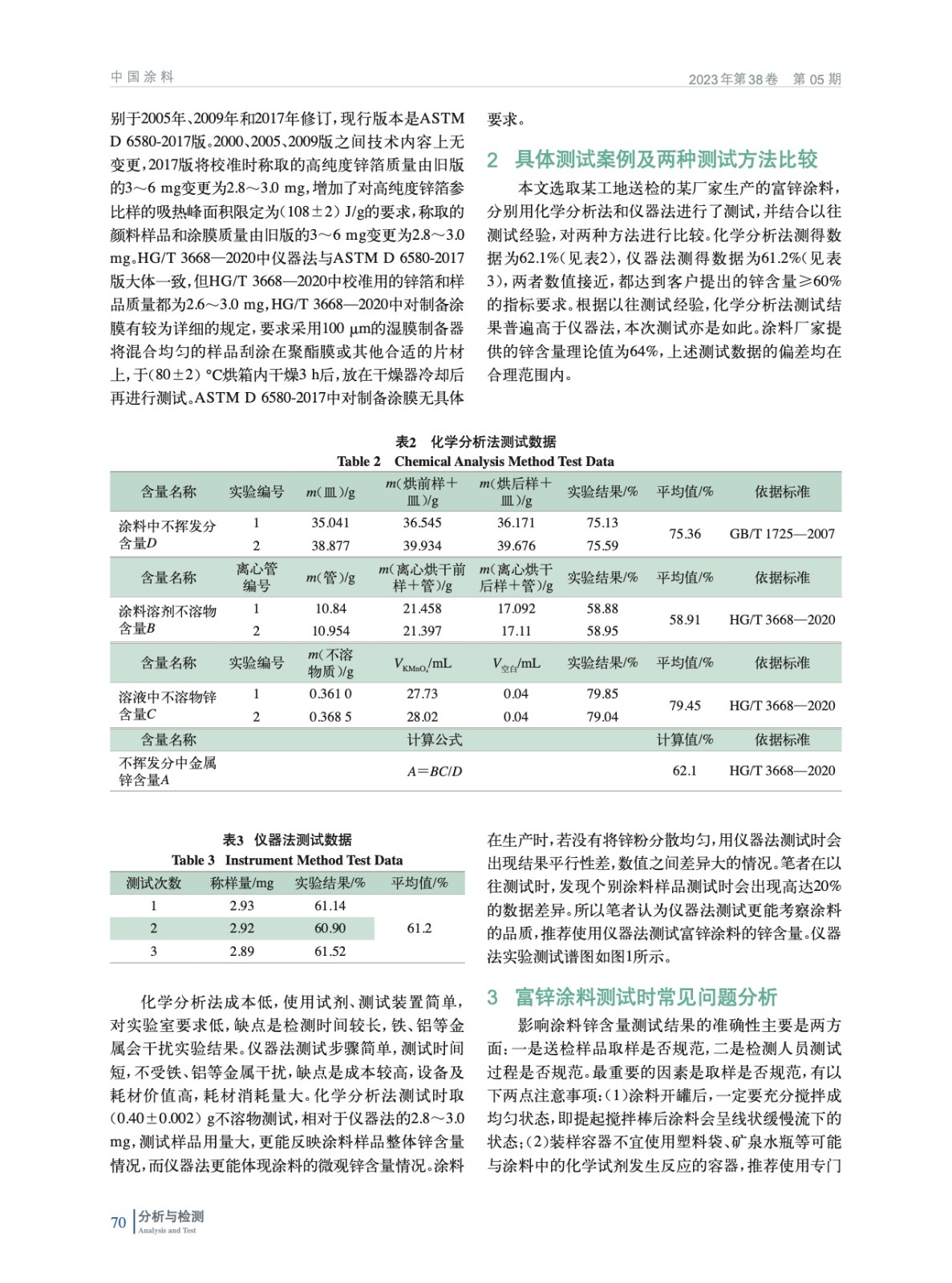 介紹了富鋅底漆測試時常用的檢測方法及測試依據標準,并介紹了HG/T 3668—2020和ASTM D 6580-2017兩個標準近來關于鋅含量測試部分的修訂變更情況。針對涂料中鋅含量檢測出現的問題,指出了規范的做法,并通過實例測試和結合以往經驗,對比了兩種測試方法的優缺點。