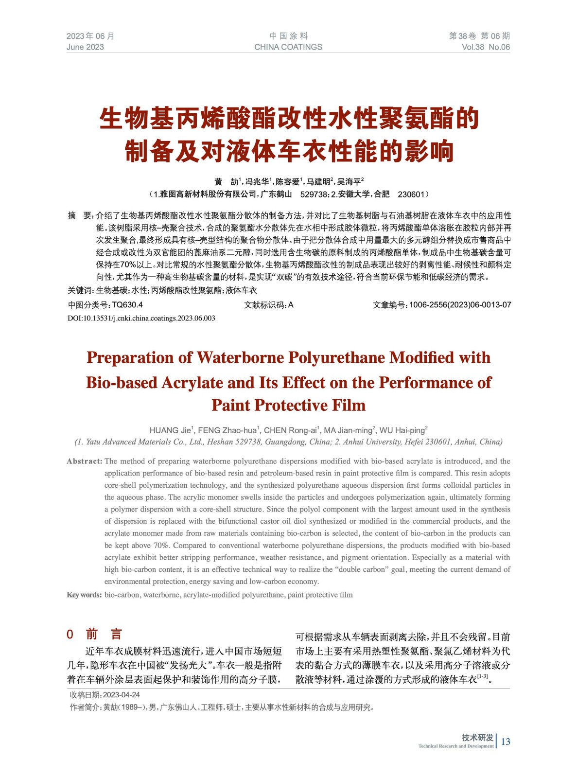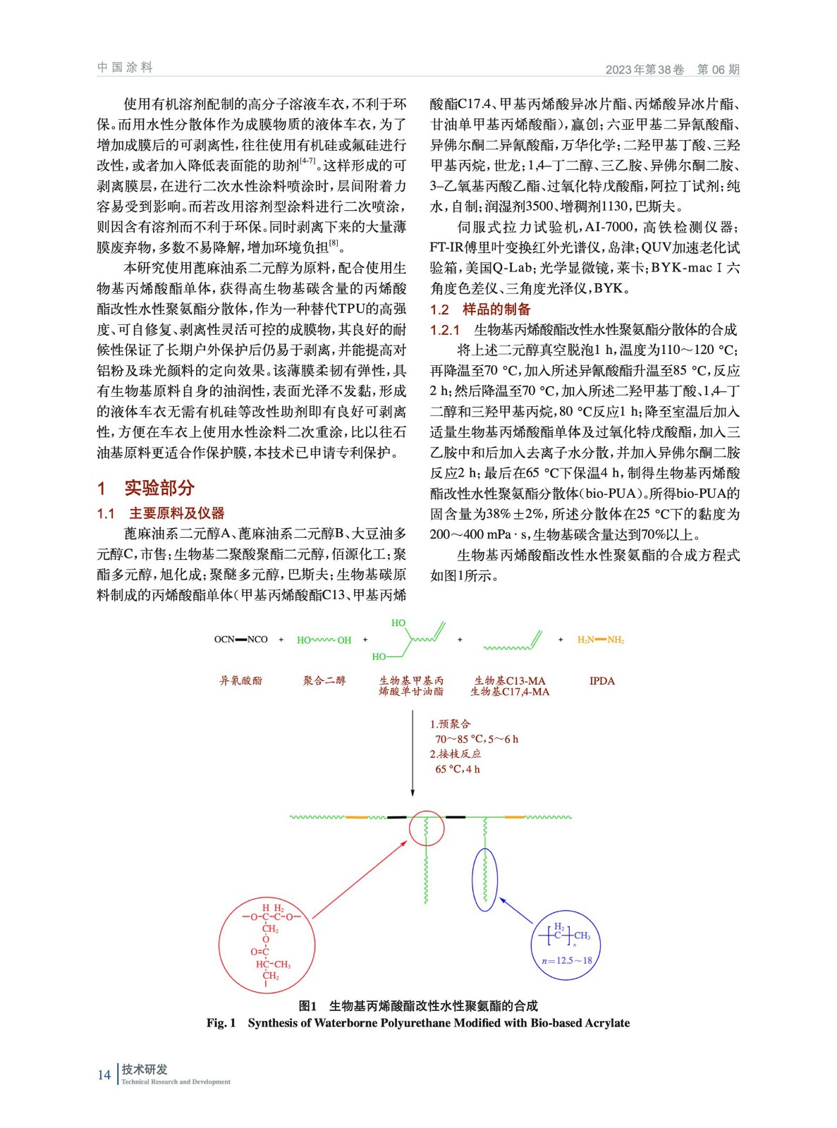 生物基丙烯酸酯改性水性聚氨酯的制備及對液體車衣性能的影響