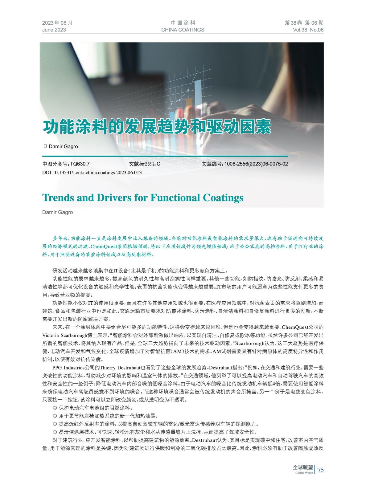 多年來,功能涂料一直是涂料發展中讓人振奮的領域。當前對功能涂料或智能涂料的需求量很大,這有助于促進向可持續發展的經濟模式的過渡。ChemQuest集團根據預測,將以下應用領域作為領先增值領域:用于辦公家具的高檔涂料、用于IT行業的涂料、用于照明設備的某些涂料領域以及高反射材料。