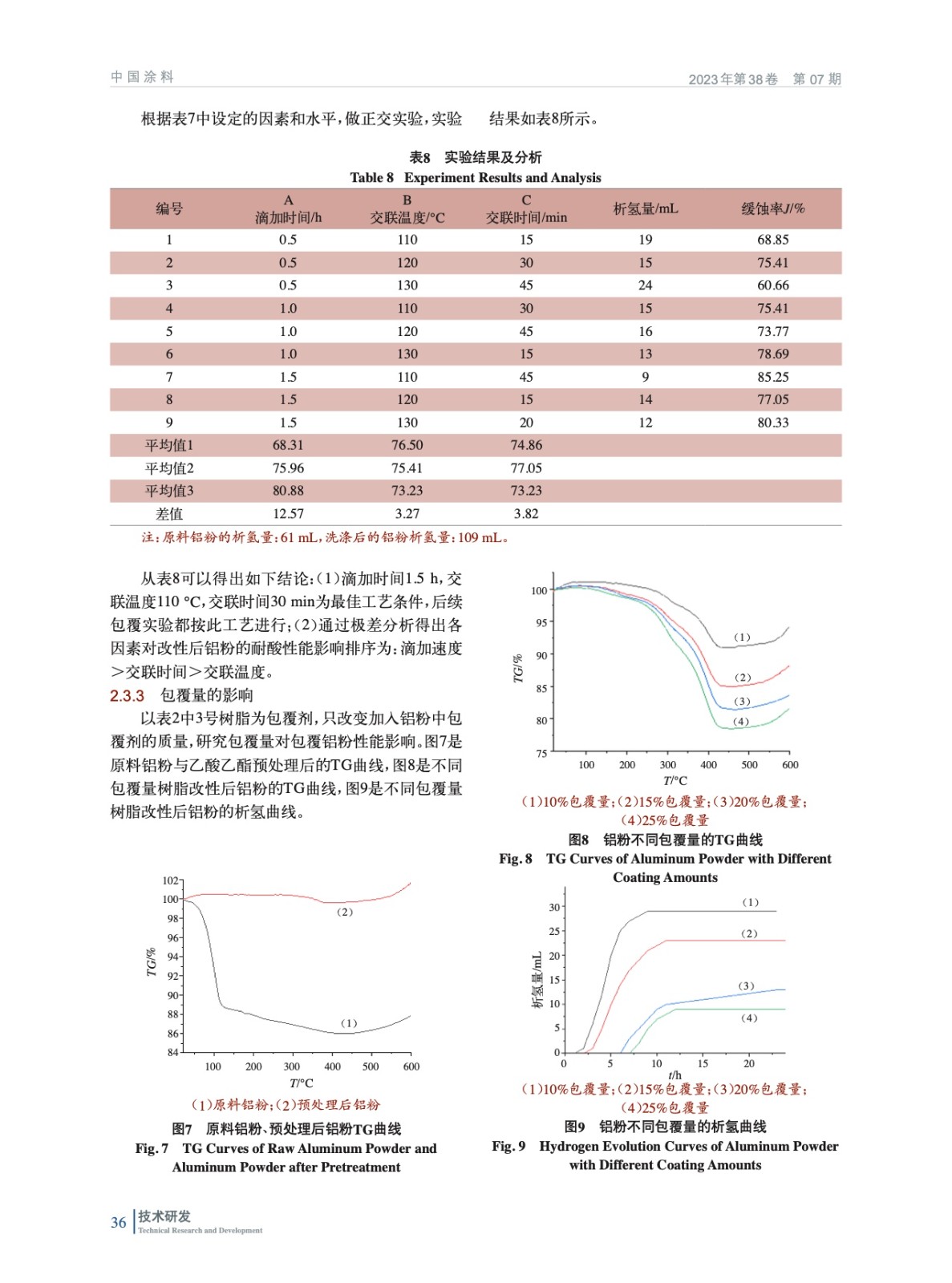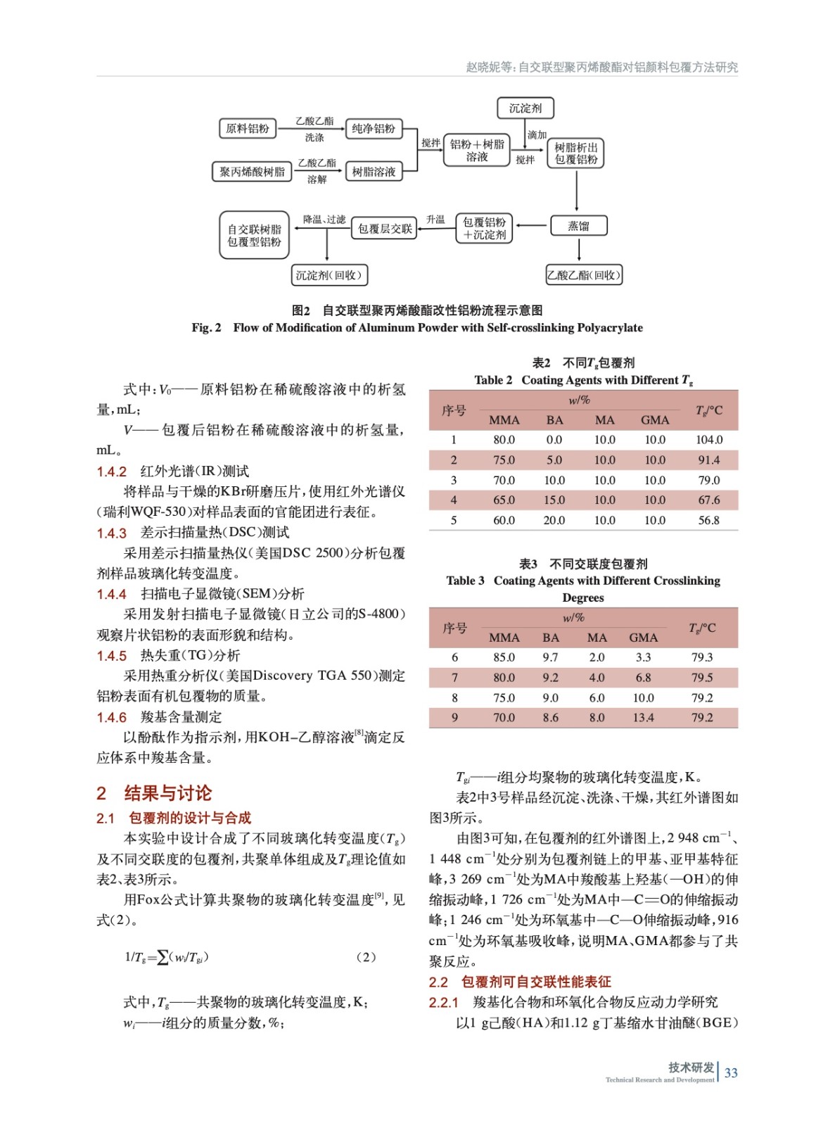 摘要:基于自由基溶液聚合方法合成自交聯型聚丙烯酸樹脂,基于高分子溶液的相分離原理對鋁粉進行包覆改性,系統研究了包覆工藝、包覆量、包覆劑玻璃化轉變溫度和交聯度對改性后鋁粉耐酸性能的影響。利用熱失重(TG)對復合粒子表面包覆量進行表征,利用差示掃描量熱(DSC)對樣品的玻璃化轉變溫度進行表征,利用傅里葉變換紅外(FT-IR)光譜對復合粒子的表面官能團進行表征,利用掃描電鏡(SEM)對復合粒子表面形貌進行表征。實驗研究表明:改性后的鋁粉表面附有一層致密的聚合物膜,與有機小分子包覆的原料鋁粉相比,其在酸液中的緩蝕率達到85%以上。