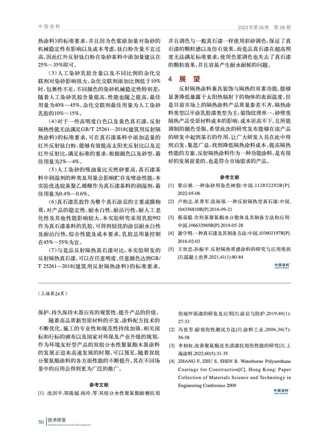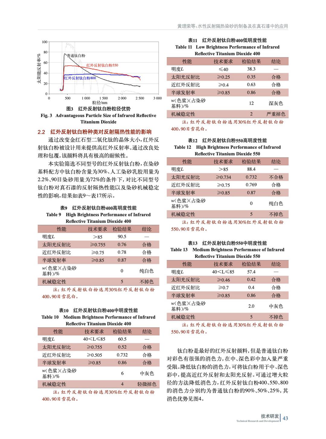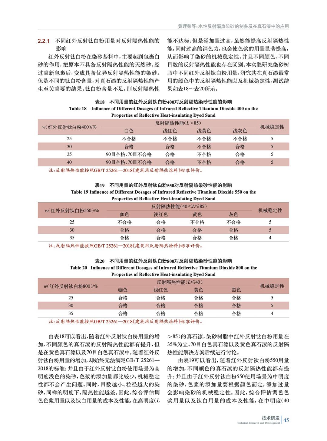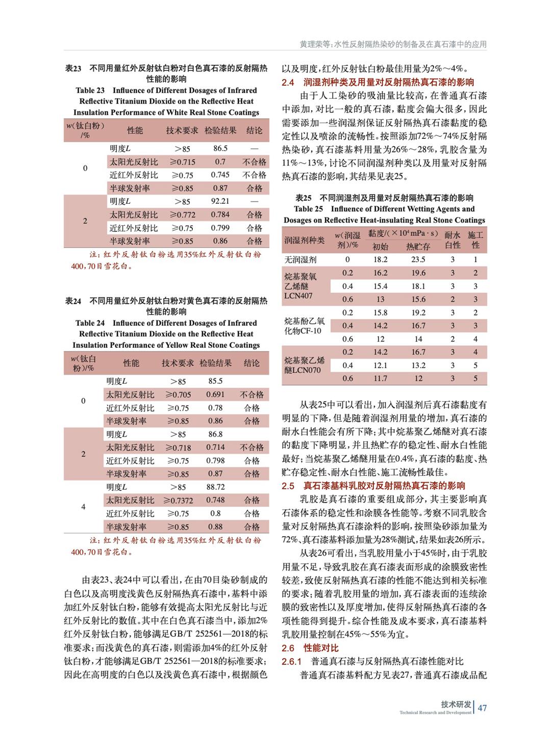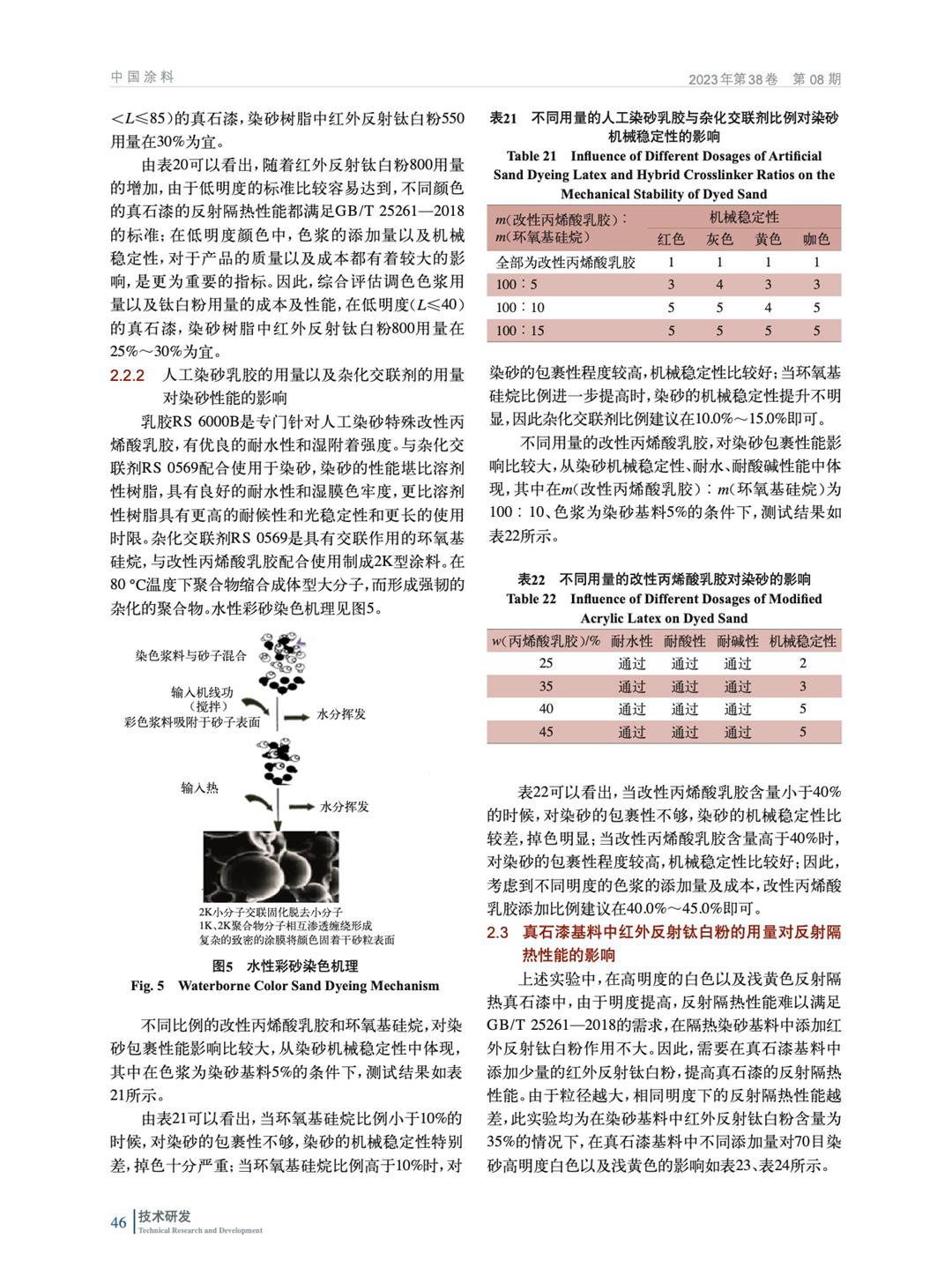 摘要:研究了不同的顏填料種類以及用量對反射隔熱染砂的耐磨性、耐水性、耐溶劑性、耐人工老化性以及反射隔熱性能的影響。結果表明:當紅外反射鈦白粉用量在25%~35%(質量分數,后同),人工染砂乳膠用量在40%~45%,雜化交聯劑用量在0.1%~0.15%,與天然雪花白進行染色處理,其制得的反射隔熱染砂,不僅具有優異的機械穩定性、顏色均勻度,而且具有優異的貯存穩定性、耐水性、耐酸性、耐堿性和耐人工老化性,添加在真石漆中具有優異的反射隔熱性能。