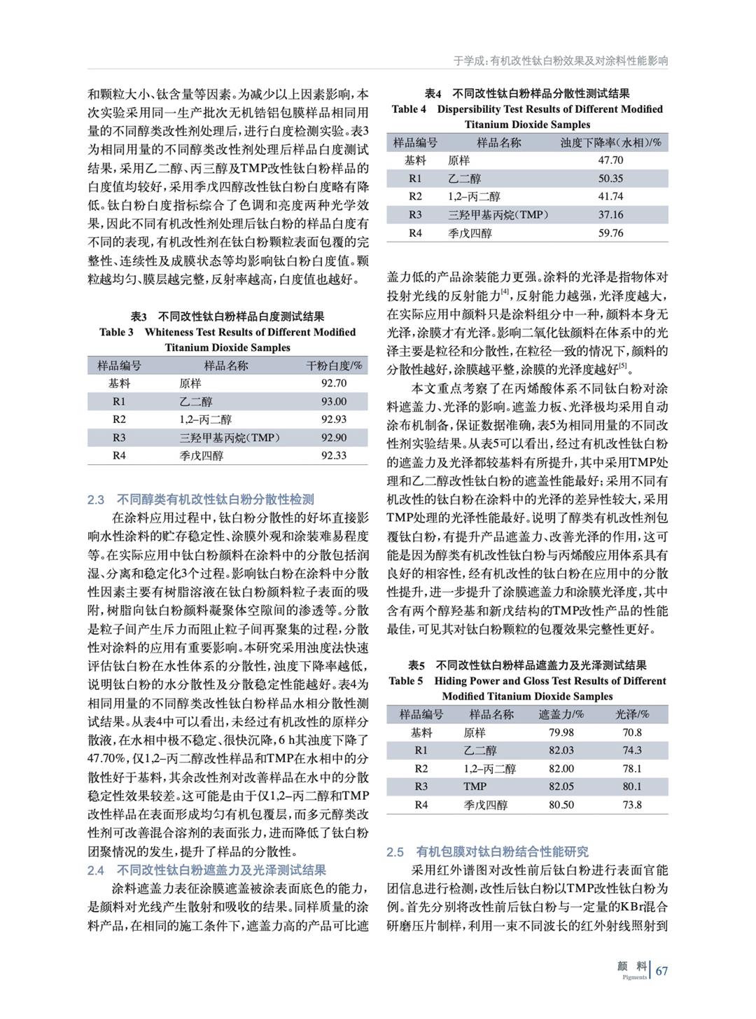 采用醇類有機劑對金紅石型鈦白粉進行有機表面改性,實驗研究不同醇類改性劑對鈦白粉改性效果。并評價改性鈦白粉在涂料體系中分散性、遮蓋力、光澤等影響。實驗結果表明:采用改性鈦白粉R3產品粉體指標、分散穩定性及涂料體系性能均較好。通過紅外光譜表征,有機改性劑在鈦白粉表面形成包覆。