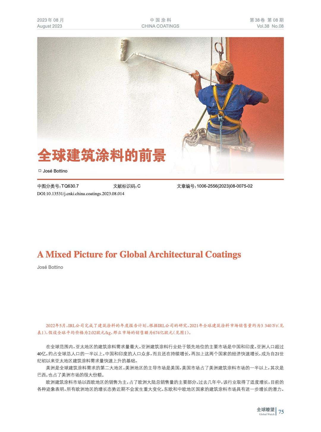 2022年5月,IRL公司完成了建筑涂料的年度報告計劃。根據IRL公司的研究,2021年全球建筑涂料市場銷售量約為3 340萬,假設全球平均價格為2.02歐元/kg,那么市場的銷售額為674億歐元。