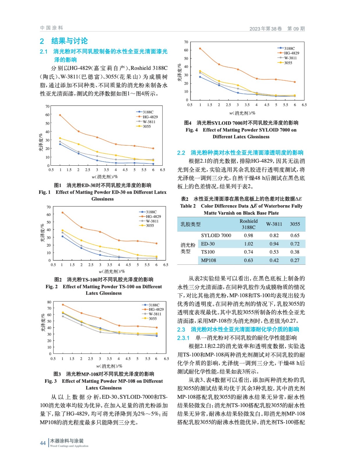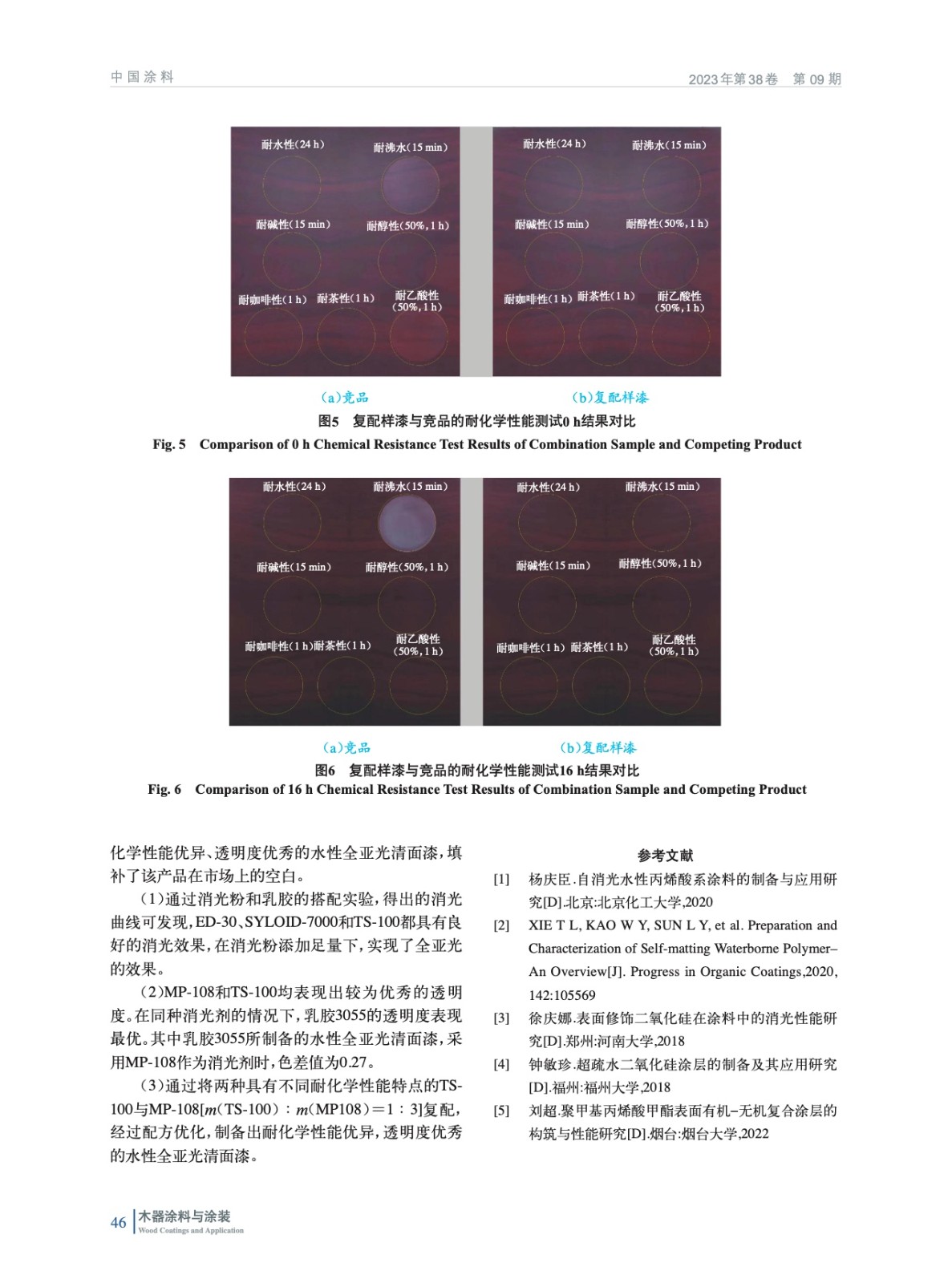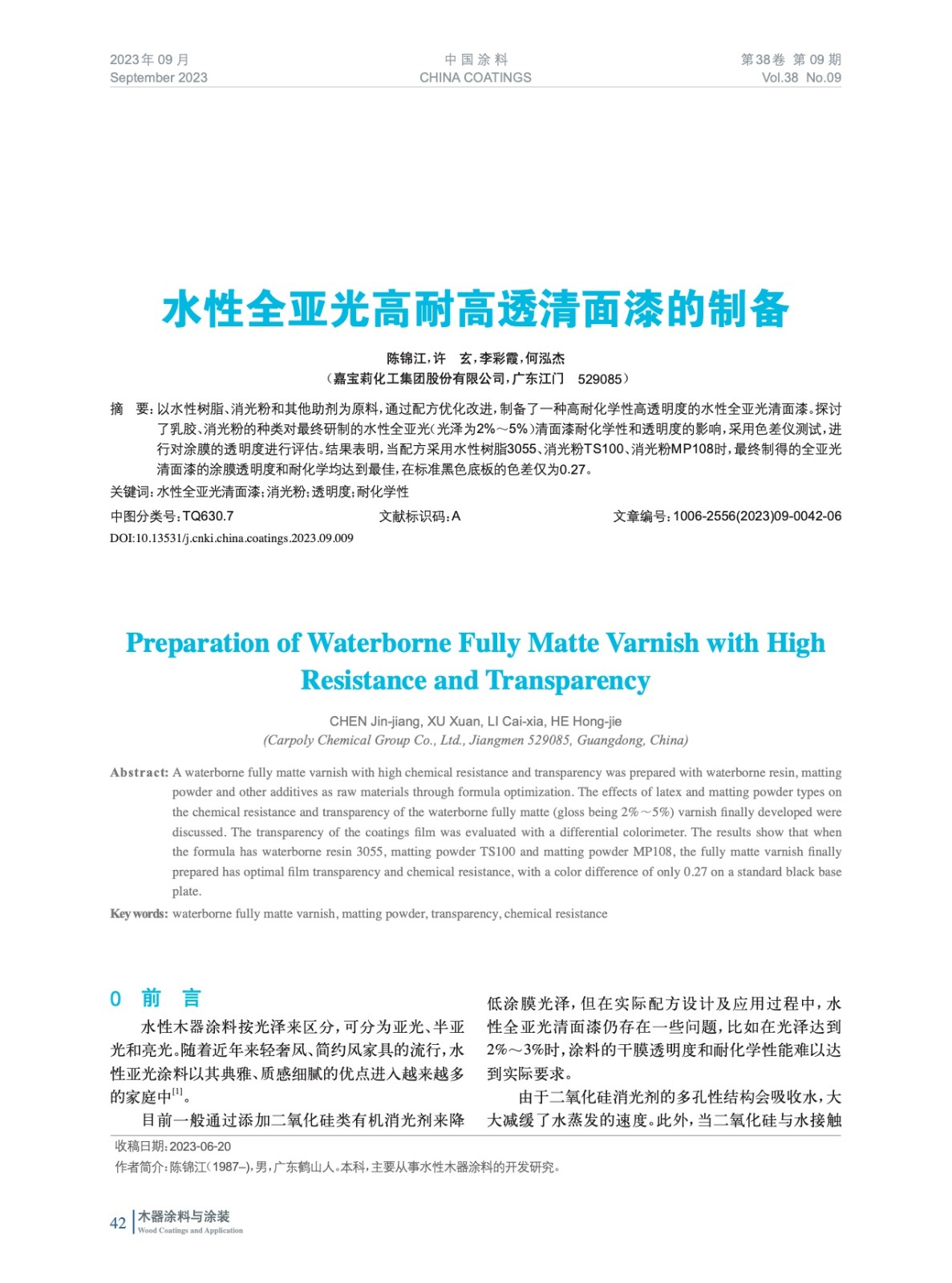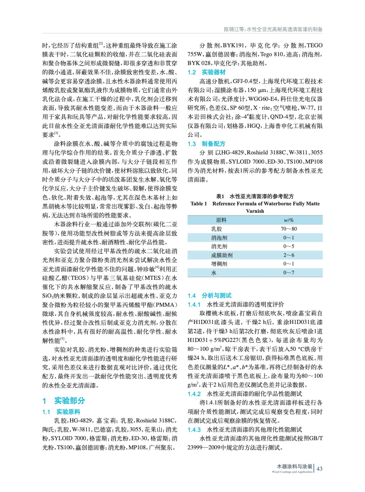 摘要:以水性樹脂、消光粉和其他助劑為原料,通過配方優(yōu)化改進,制備了一種高耐化學性高透明度的水性全亞光清面漆。探討了乳膠、消光粉的種類對最終研制的水性全亞光(光澤為2%~5%)清面漆耐化學性和透明度的影響,采用色差儀測試,進行對涂膜的透明度進行評估。結(jié)果表明,當配方采用水性樹脂3055、消光粉TS100、消光粉MP108時,最終制得的全亞光清面漆的涂膜透明度和耐化學均達到最佳,在標準黑色底板的色差僅為0.27。