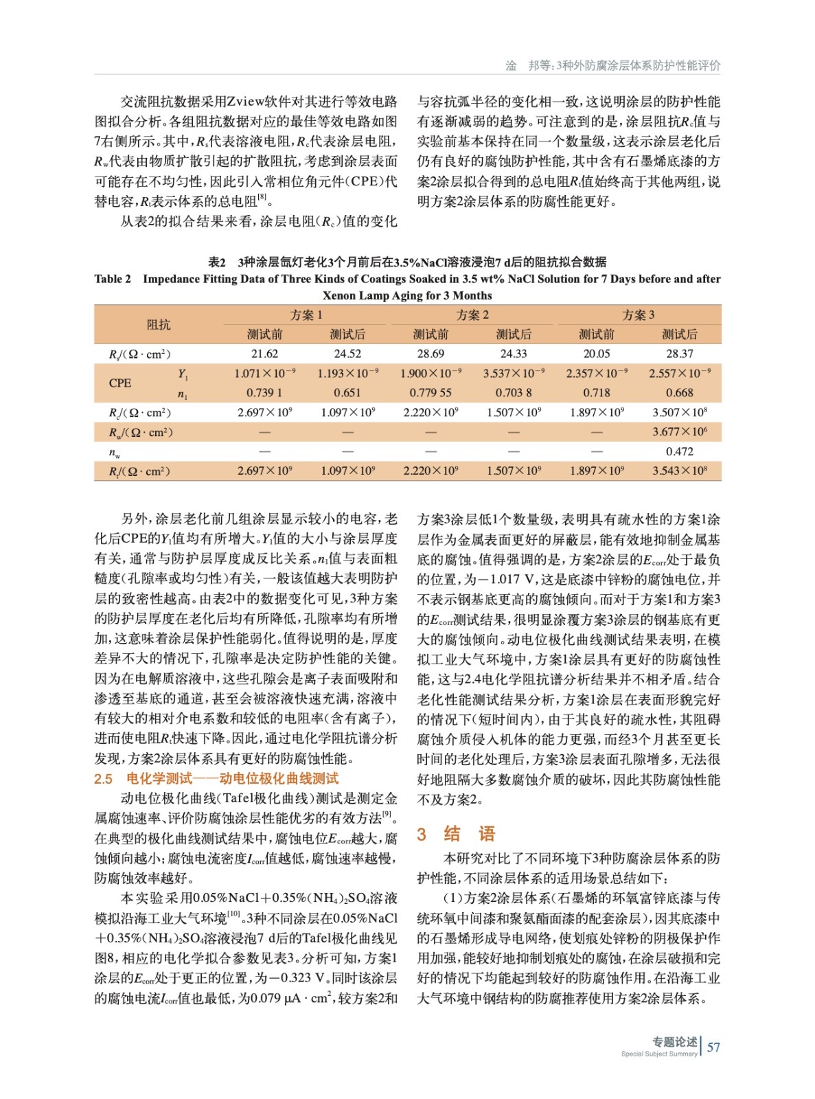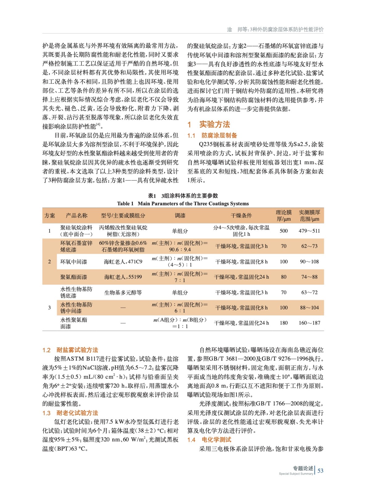 摘要:研究了3種外防腐涂層體系的防腐蝕性和耐老化性,評估了其在沿海工業大氣環境中用于鋼結構防腐的可行性。結果表明,在沿海工業大氣環境中,由含石墨烯的環氧富鋅底漆、傳統環氧中涂漆和聚氨酯面漆組成的配套體系在涂層破損和完好的情況下均能起到較好的防腐蝕作用。聚硅氧烷涂層具有更好的耐老化性能,在沒有破損的情況下,表現出良好的防腐性能。