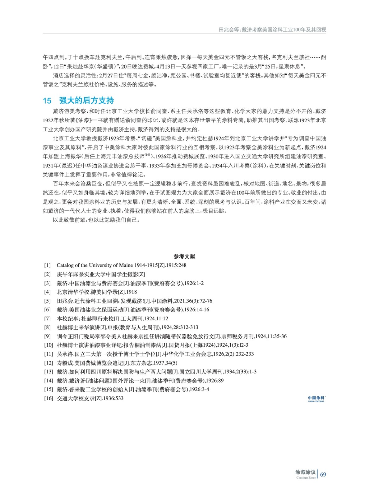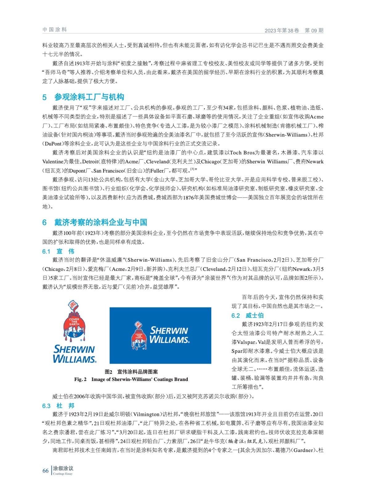 摘要:100年前的1923年,戴濟(字汝楫)考察美國涂料業,時間跨度為1月31日至4月13日,歷時73天,主要沿舊金山–紐約一線,參觀至少34家工廠、13處公共機構,會晤37人,并寫成《游美紀程》一文,收錄在《油漆季刊(費府賽會號)》中,在10月10日于上海總商會商品陳列所第三次展覽會暨化學工藝展覽會(1923年)上,發表題為“美國油漆業之保面運動”的演講,促成杜赫于1924年來華“專為調查中國油漆事業及其原料”,也由此開啟和奠定中美涂料業的相互交流的基礎。當初這第一步走出去之時,正值我國從原始大漆、桐油開始轉型、現代涂料工業起步之際。此行作為中國涂料發展歷程的一個標志性和重大活動,本應是值得紀念的,由此再提和回視百年前的考察,也更應有其價值和意義。