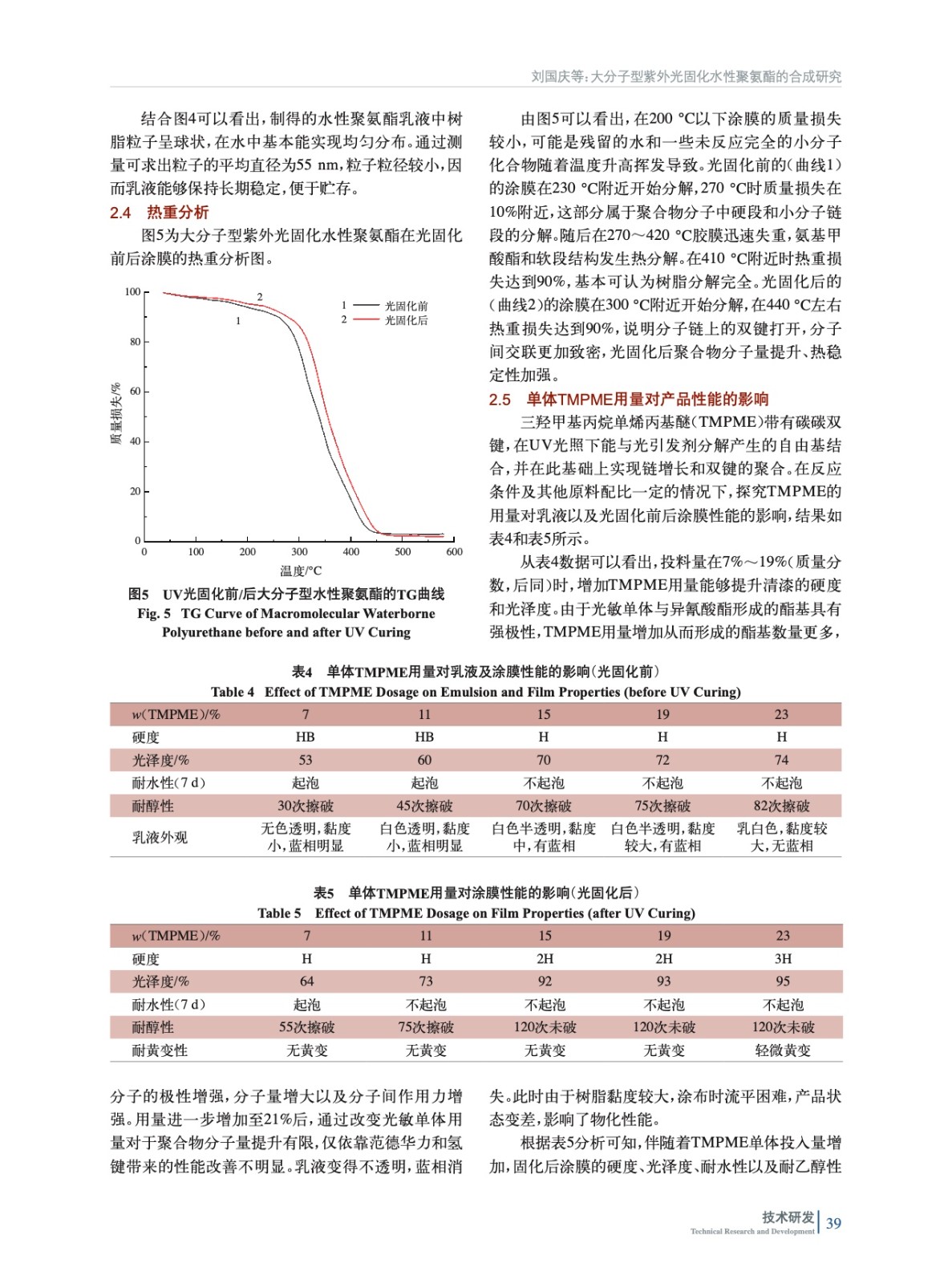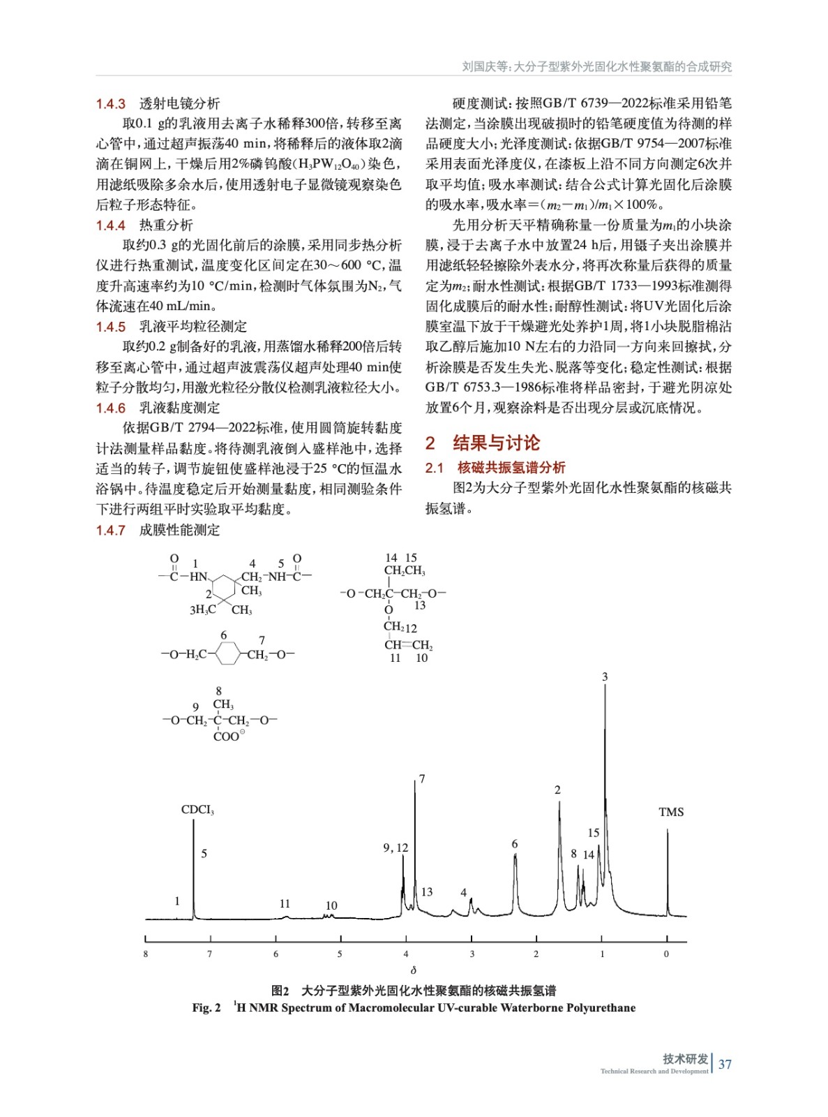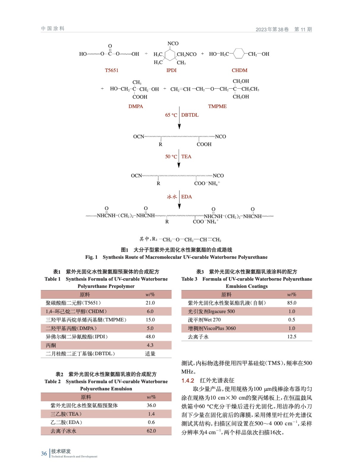 摘要:采用異佛爾酮二異氰酸酯(IPDI)以及1,4–環(huán)己烷二甲醇(CHDM)充當(dāng)硬段,線性聚碳酸酯二元醇(T5651)作為軟段,三羥甲基丙烷單烯丙基醚(TMPME)充當(dāng)光敏單體,二羥甲基丙酸(DMPA)為親水單體,通過擴(kuò)鏈合成了大分子型紫外光固化水性聚氨酯(UV-WPU)。結(jié)合核磁共振波譜(NMR)、傅里葉紅外光譜(FT-IR)、透射電鏡(TEM)、熱重分析(TGA)以及激光粒度分析儀對合成的乳液及涂膜的結(jié)構(gòu)與性能進(jìn)行了表征,探討了TMPME、DMPA、CHDM用量和光固化工藝對于樹脂乳液以及成膜后性能的影響。結(jié)果表明:當(dāng)TMPME質(zhì)量分?jǐn)?shù)為15%,CHDM、DMPA質(zhì)量分?jǐn)?shù)分別為6%、5%時制得的聚氨酯乳液貯存穩(wěn)定、性能優(yōu)異;經(jīng)紫外光固化35 s后涂膜硬度高、不黃變,耐溶劑性好。