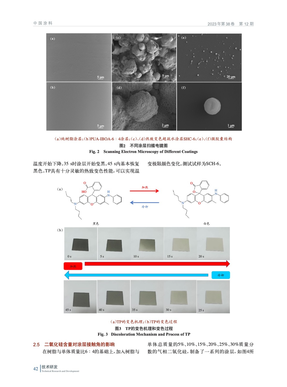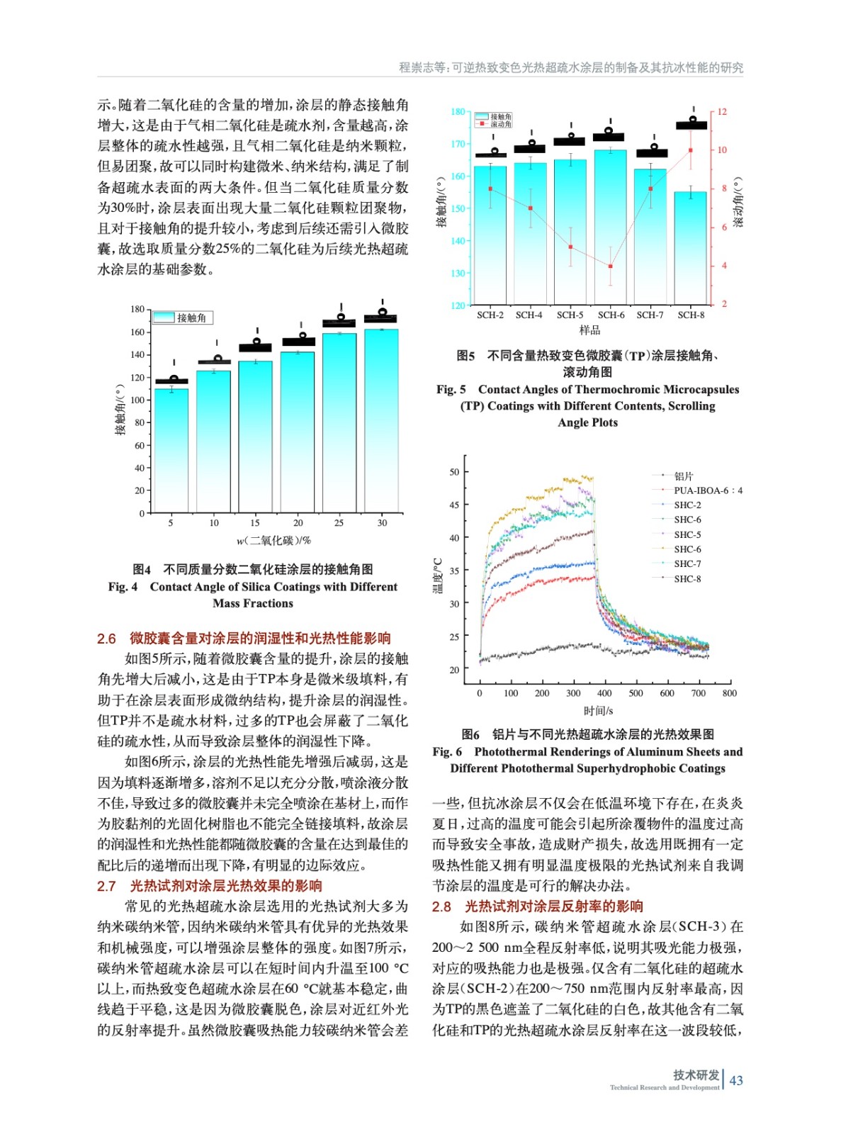 摘要:以脂肪族聚氨酯、丙烯酸異冰片酯混合物為膠黏劑,氣相二氧化硅為疏水劑,可逆熱致變色微膠囊為光熱試劑,制備了一系列可逆熱致變色超疏水涂層。實驗表明,熱致變色光熱超疏水涂層水接觸角達168°,由于微膠囊的引入,涂層具有高溫脫色、低溫黑色的特性,可以智能控制涂層的溫度,同時也具備抗冰性能,較空白鋁片可延遲結冰長達485 s,在近紅外(808 nm)光輻照下70 s內融冰,為拓展超疏水涂層的智能化和多功能化應用提供了切實的方法。