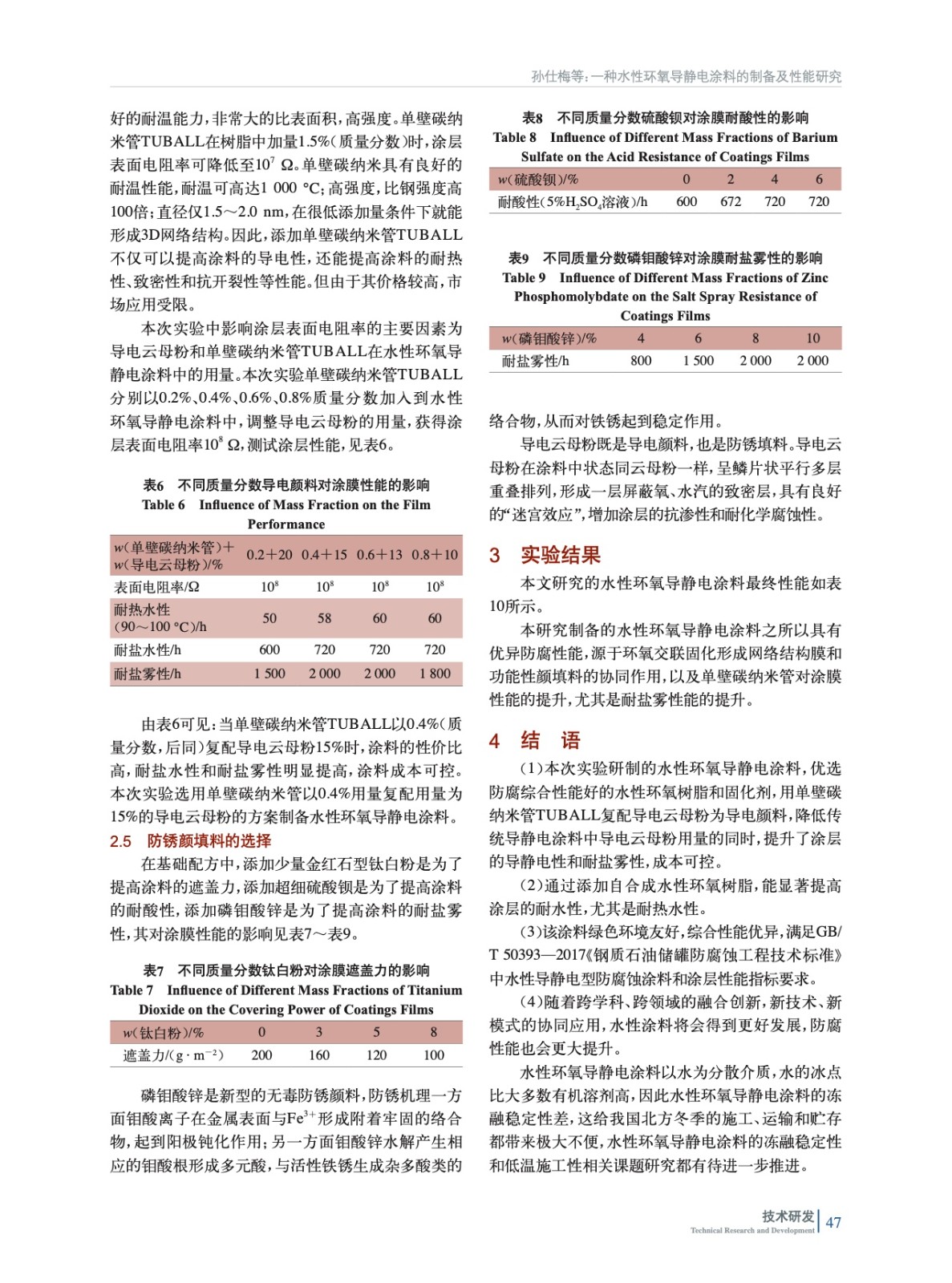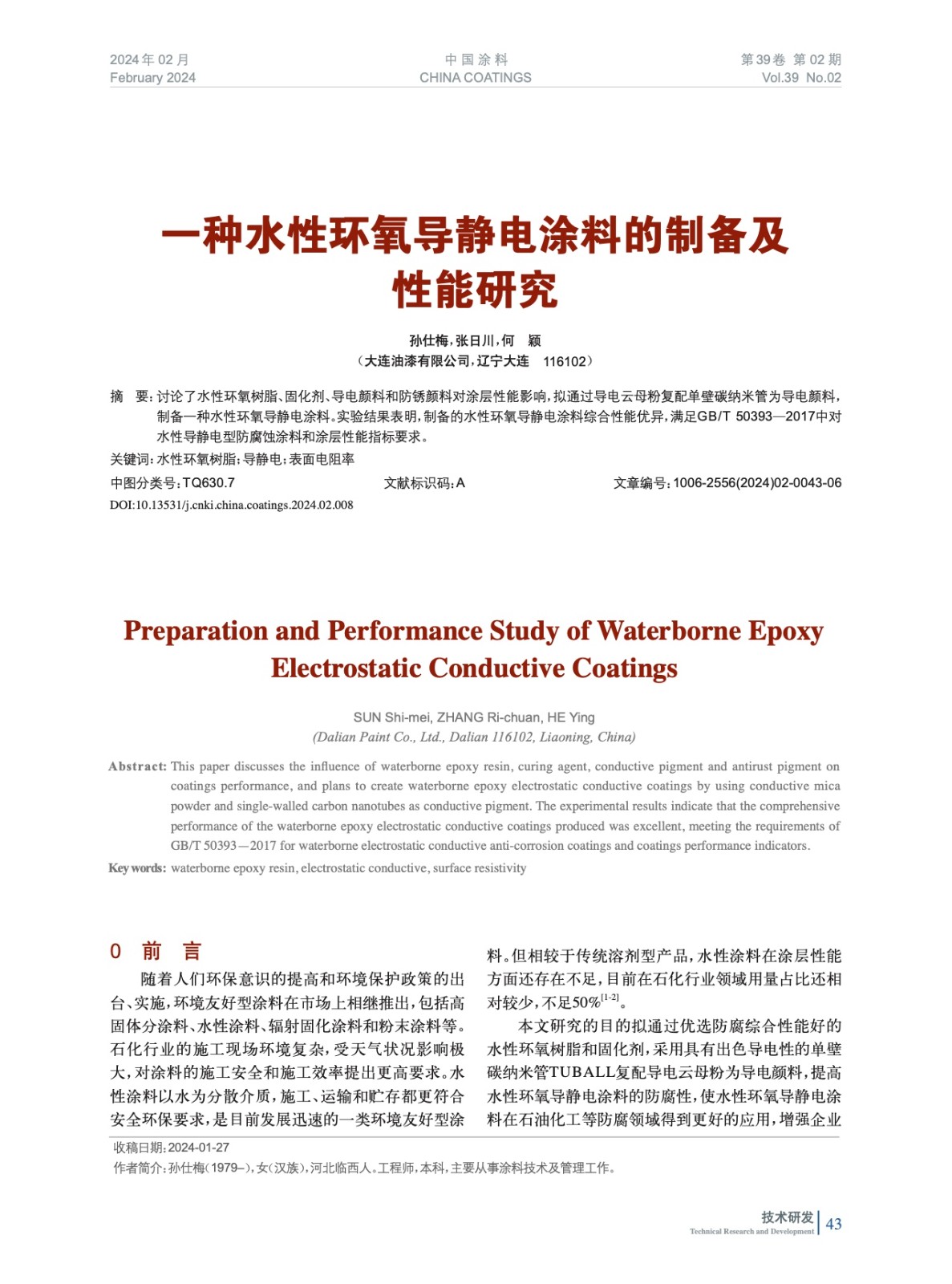 摘要:討論了水性環(huán)氧樹(shù)脂、固化劑、導(dǎo)電顏料和防銹顏料對(duì)涂層性能影響,擬通過(guò)導(dǎo)電云母粉復(fù)配單壁碳納米管為導(dǎo)電顏料,制備一種水性環(huán)氧導(dǎo)靜電涂料。實(shí)驗(yàn)結(jié)果表明,制備的水性環(huán)氧導(dǎo)靜電涂料綜合性能優(yōu)異,滿足GB/T 50393—2017中對(duì)水性導(dǎo)靜電型防腐蝕涂料和涂層性能指標(biāo)要求。