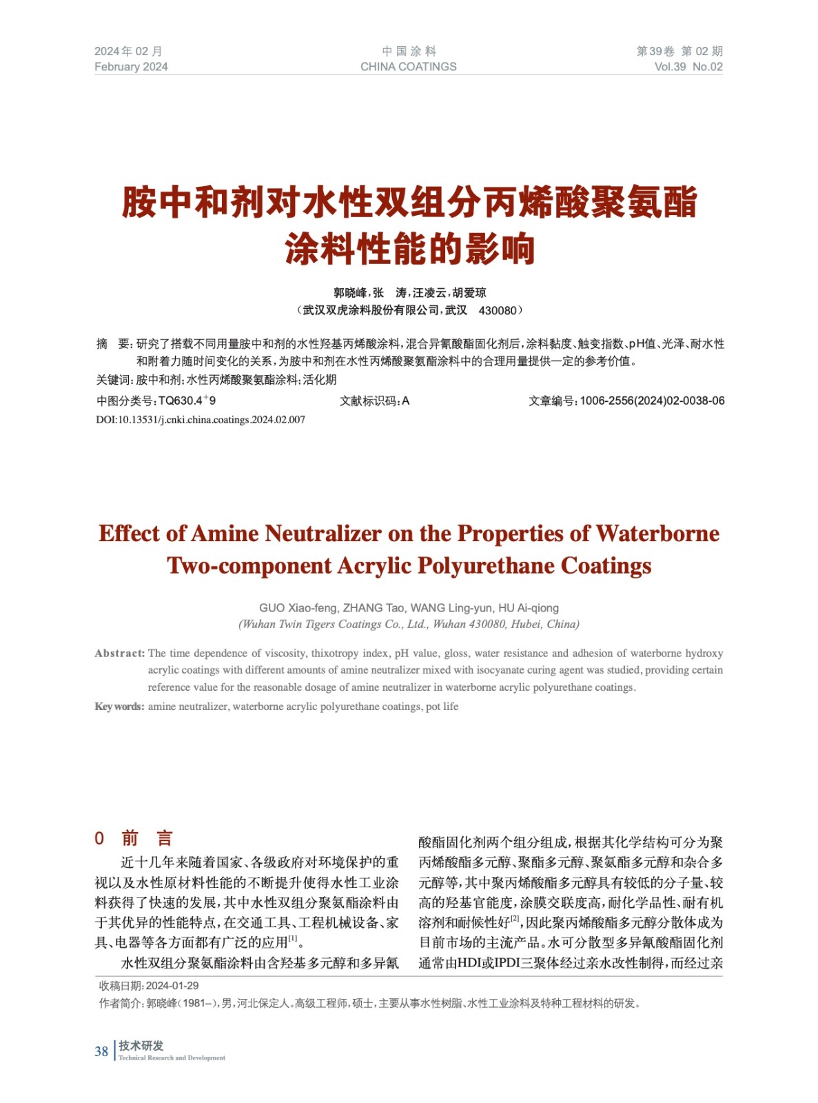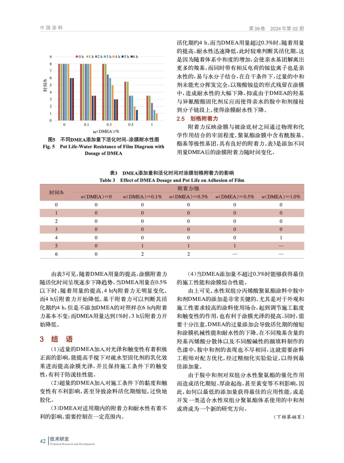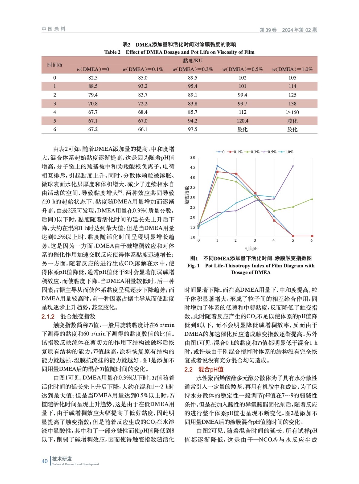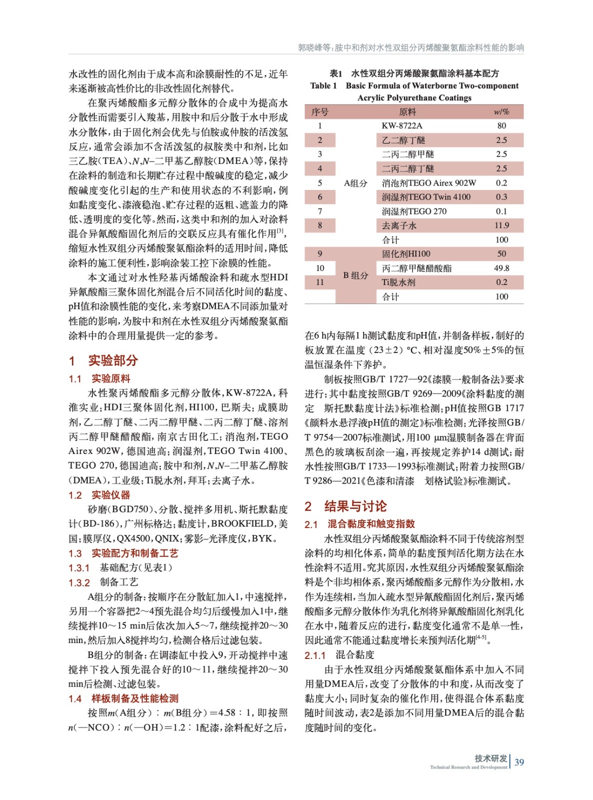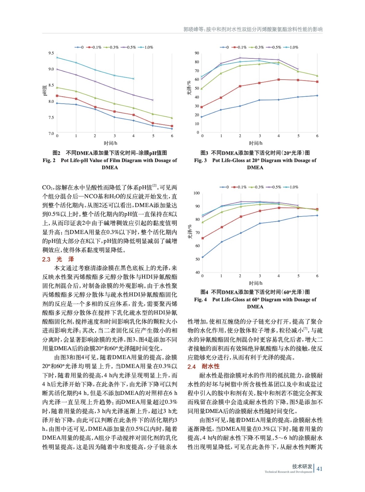 摘要:研究了搭載不同用量胺中和劑的水性羥基丙烯酸涂料,混合異氰酸酯固化劑后,涂料黏度、觸變指數(shù)、pH值、光澤、耐水性和附著力隨時間變化的關(guān)系,為胺中和劑在水性丙烯酸聚氨酯涂料中的合理用量提供一定的參考價值。