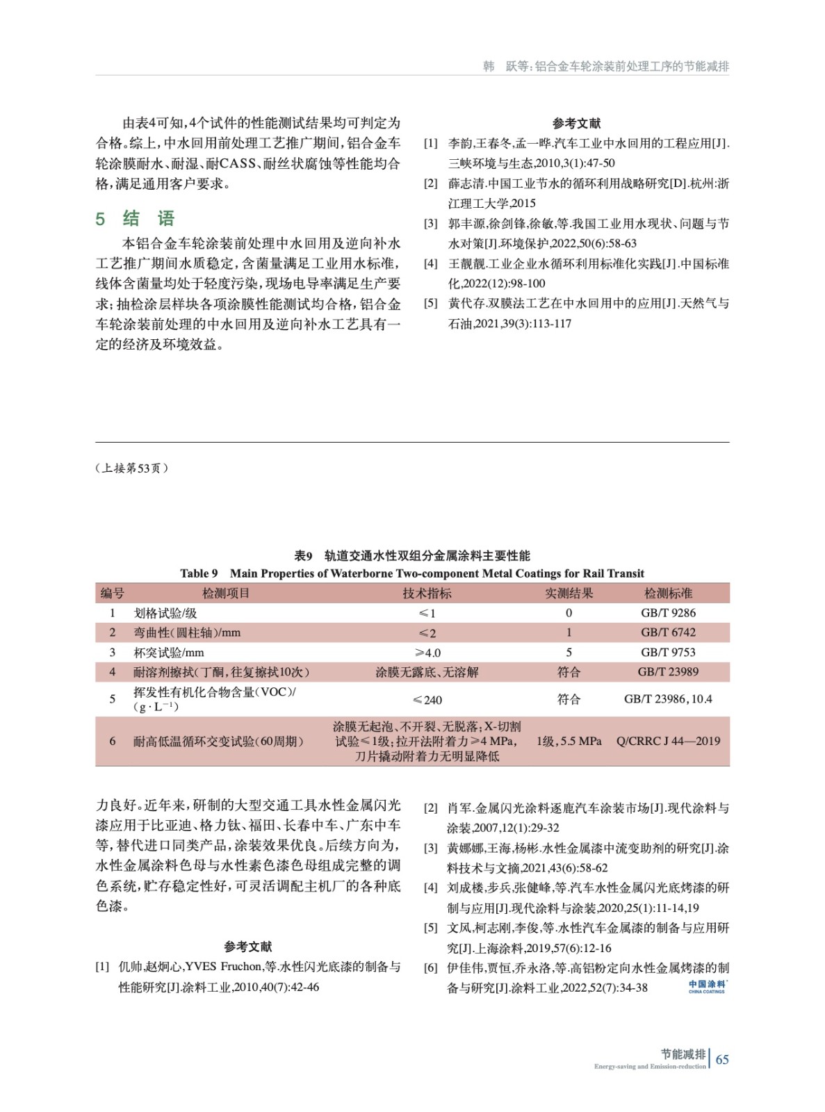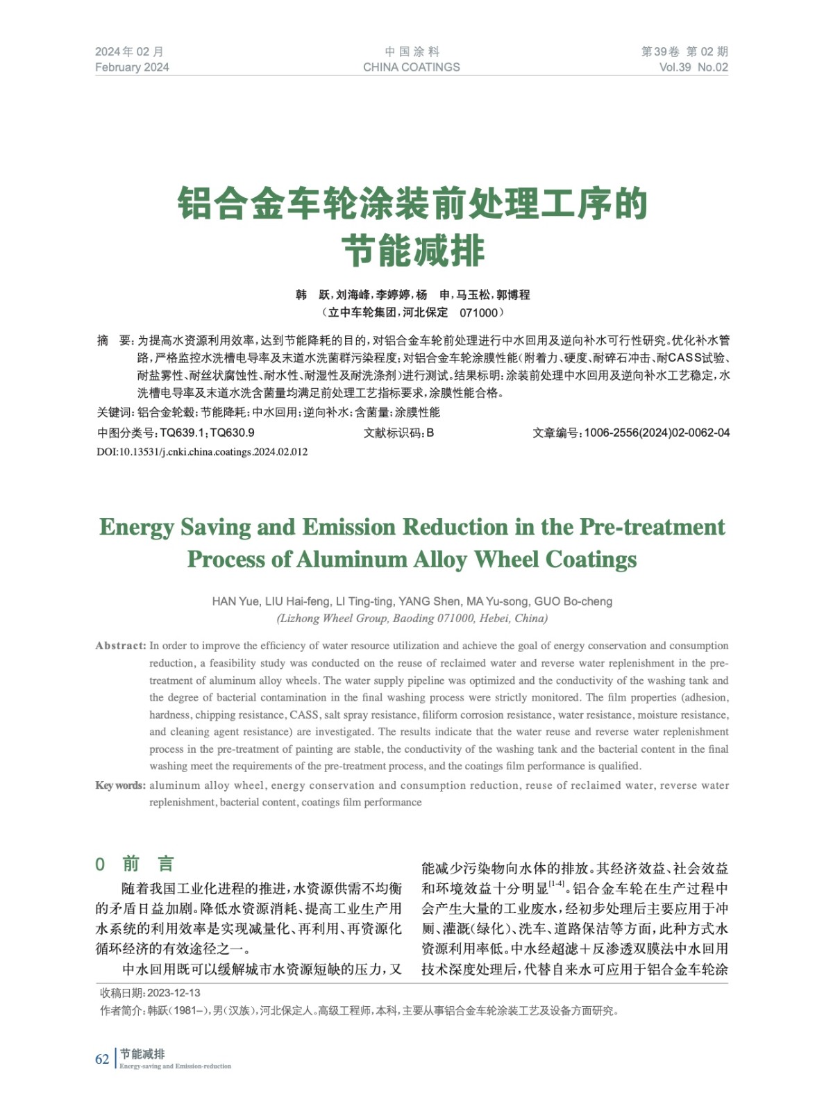 摘要:為提高水資源利用效率,達到節能降耗的目的,對鋁合金車輪前處理進行中水回用及逆向補水可行性研究。優化補水管路,嚴格監控水洗槽電導率及末道水洗菌群污染程度;對鋁合金車輪涂膜性能(附著力、硬度、耐碎石沖擊、耐CASS試驗、耐鹽霧性、耐絲狀腐蝕性、耐水性、耐濕性及耐洗滌劑)進行測試。結果標明:涂裝前處理中水回用及逆向補水工藝穩定,水洗槽電導率及末道水洗含菌量均滿足前處理工藝指標要求,涂膜性能合格。