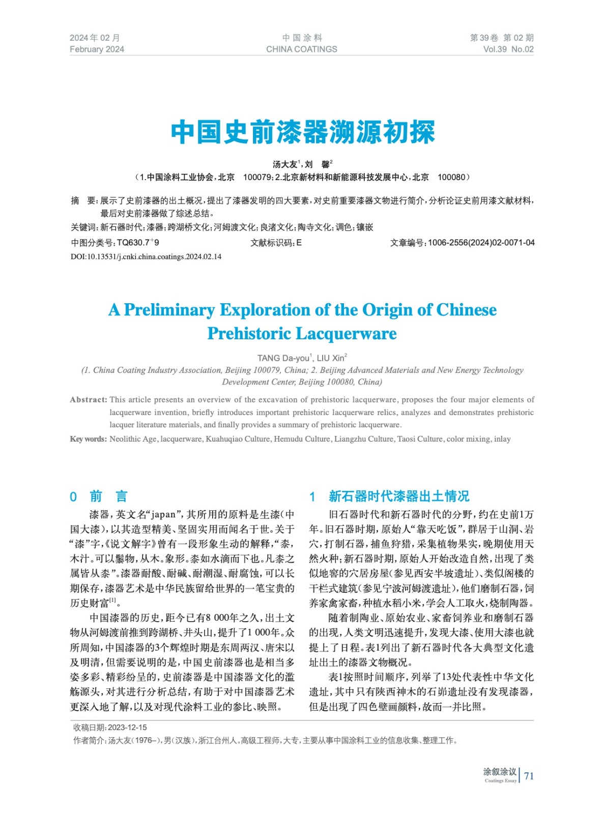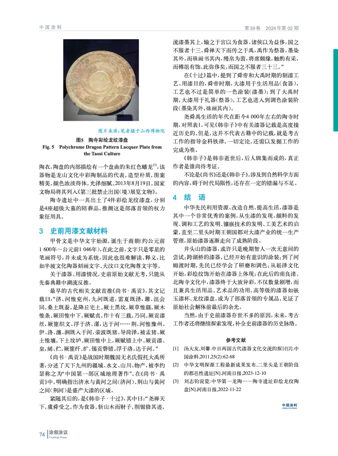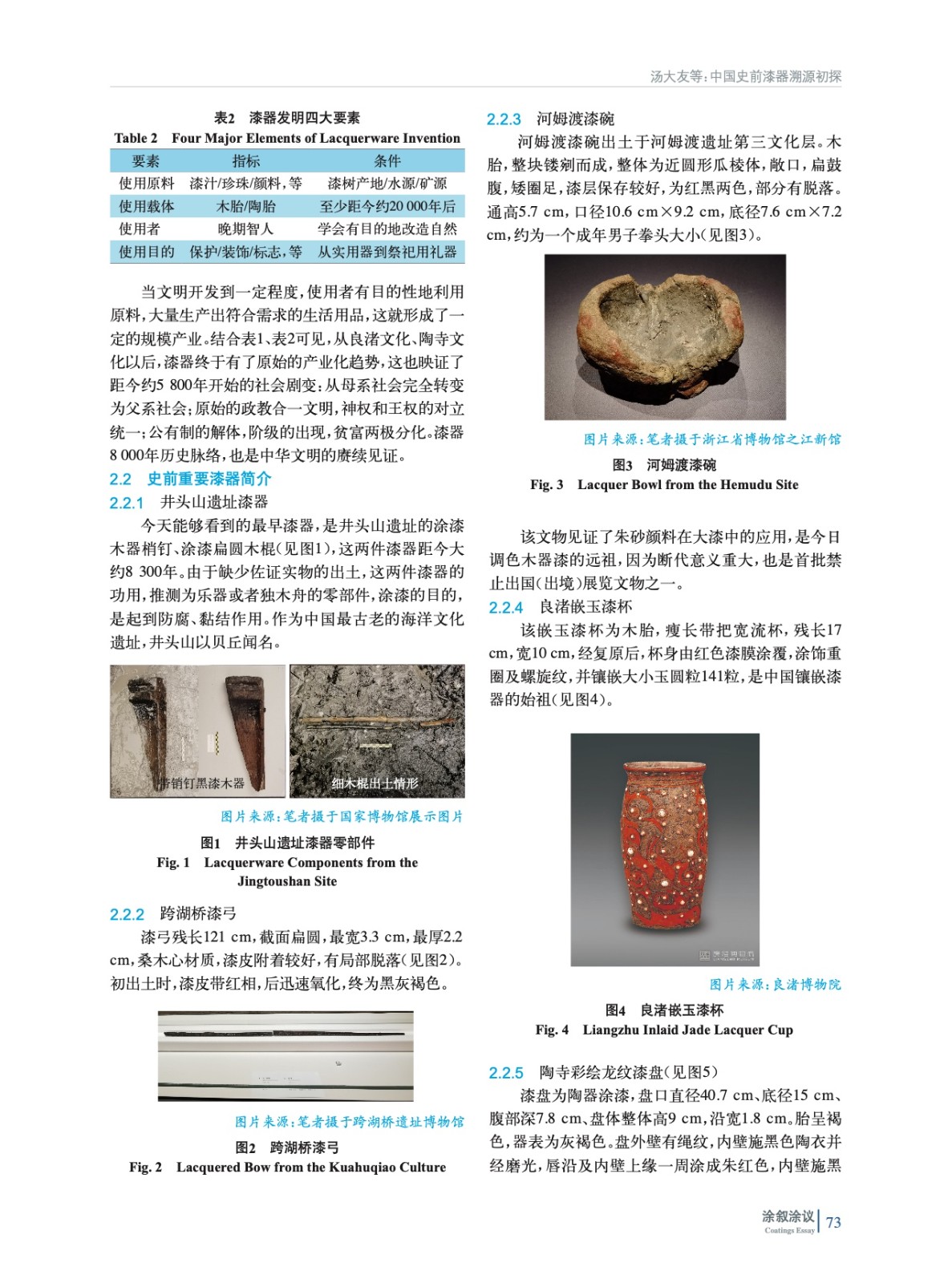 展示了史前漆器的出土概況,提出了漆器發(fā)明的四大要素,對史前重要漆器文物進行簡介,分析論證史前用漆文獻材料,最后對史前漆器做了綜述總結(jié)。
