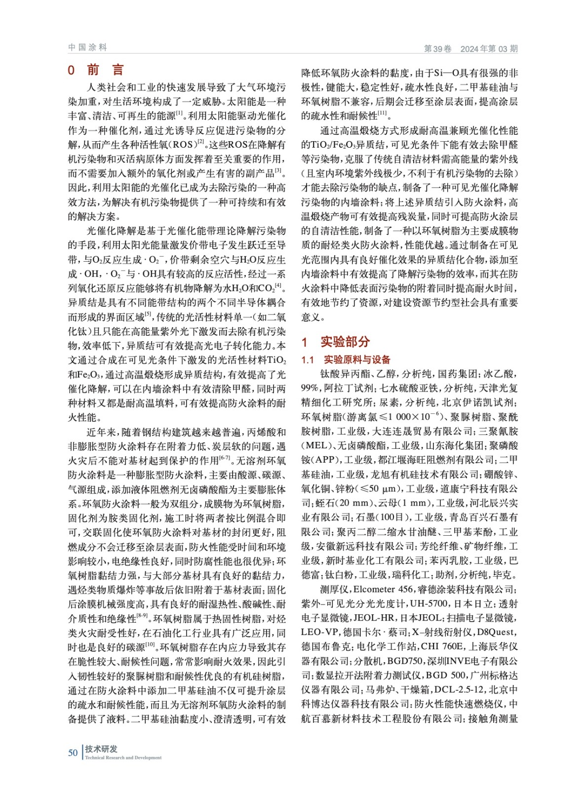 摘要:采用水熱法合成TiO2、Fe2O3的前聚體,并通過高溫煅燒制備了TiO2/Fe2O3異質結,通過XRD、SEM、TEM等一系列表征TiO2、Fe2O3的形成,紫外–漫反射光譜圖表明,TiO2/Fe2O3異質結在可見光范圍內吸光性能較TiO2和Fe2O3明顯紅移。通過Tauc曲線、Mott-Schottky曲線理論計算得出TiO2/Fe2O3異質結的形成,該異質結對甲基橙的180 min催化率為94%,可見光范圍內表現出卓越的光催化活性。在內墻涂料中添加質量比為1∶100時對甲醛24 h 光催化降解效率為89.6%,TiO2/Fe2O3異質結在高溫煅燒下形成一種優良的耐高溫填料,因此在防火涂料中的應用顯著增強了其阻燃抑煙性能。在防火涂料中的添加質量比為2.5∶100時,防火涂料的殘炭量從35%提升至39%,環氧防火涂料9.0 mm耐火230 min,呈現出良好的防火性能,環氧涂層黏結力強,耐久性、機械性好,膨脹炭層強度高、致密性好,TiO2/Fe2O3異質結存在還使該防火涂料具有良好的自清潔性能。