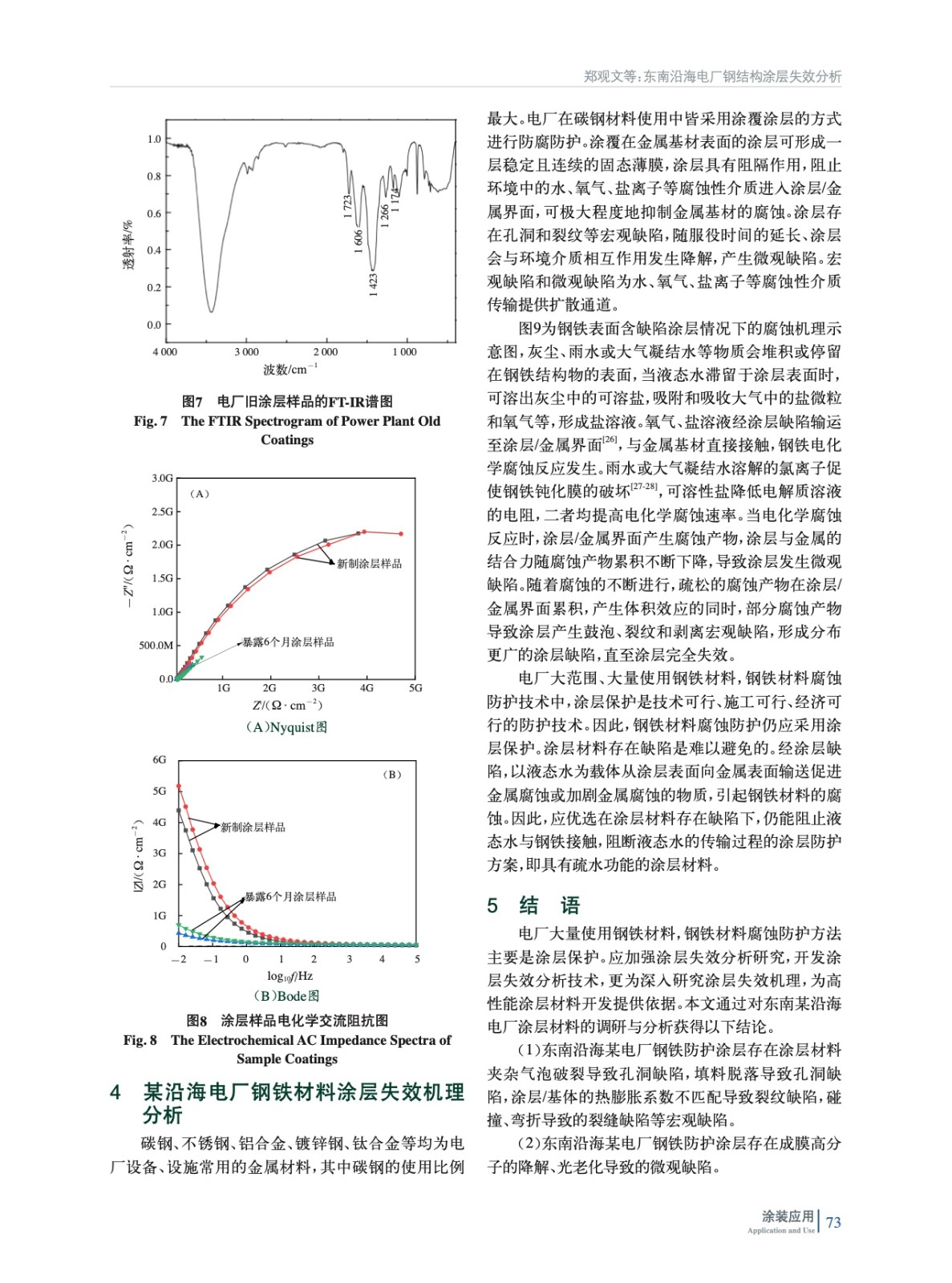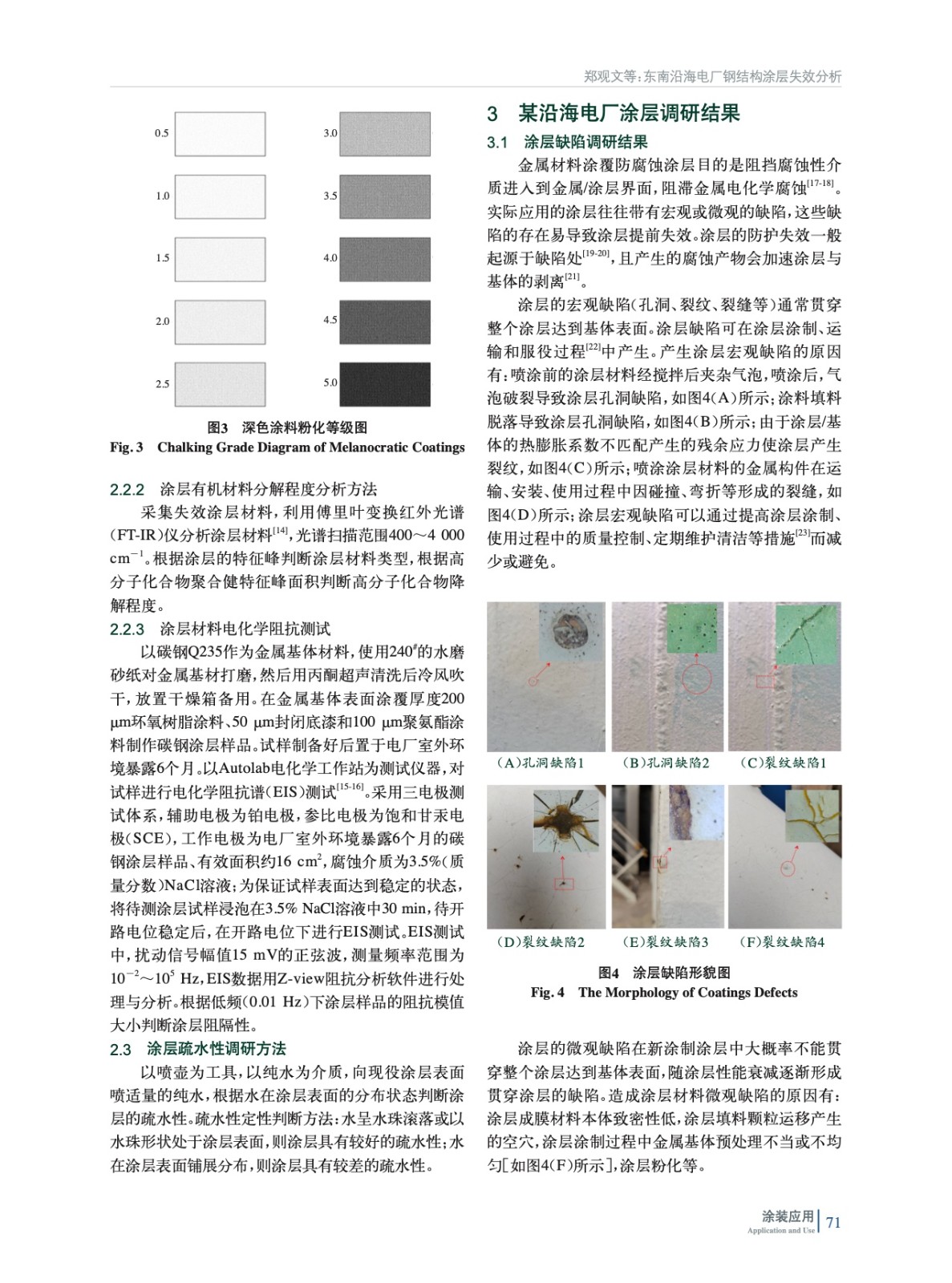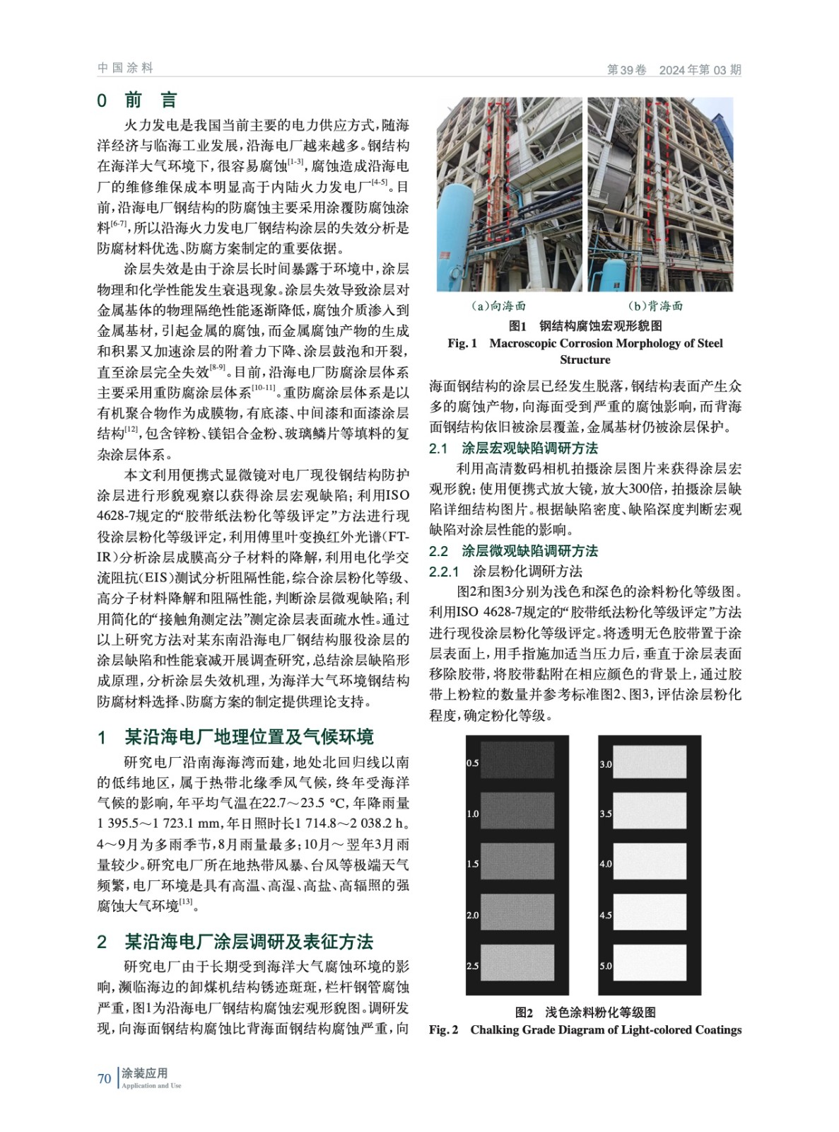 摘要:針對沿海電廠鋼結構涂層失效的分析,可為防腐材料選擇、防腐方案的制定提供重要依據。利用便攜式顯微鏡觀察現役涂層宏觀缺陷;利用膠帶紙法粉化等級評定、傅里葉變換紅外光譜(FT-IR)分析、電化學交流阻抗(EIS)測試判斷涂層微觀缺陷;利用簡化的“接觸角測定法”測定涂層表面疏水性。結果表明,涂層存在夾雜氣泡破裂和填料脫落導致的孔洞缺陷,涂層/基體的熱膨脹系數不匹配導致的裂紋缺陷,碰撞、彎折導致的裂縫缺陷等宏觀缺陷;經一定時間暴露后,涂層成膜高分子降解、光老化導致微觀缺陷;新涂制涂層材料具有一定的疏水性,經工業海洋大氣環境暴露,疏水性迅速下降。由此可得,涂層表面滯留的液態水溶出灰塵中的可溶鹽、吸附和吸收大氣中的鹽微粒和氧氣,經涂層缺陷輸運至涂層/金屬界面,促成鋼鐵電化學腐蝕發生。涂層/金屬界面的腐蝕產物累積,腐蝕產物體積效應導致涂層鼓泡、開裂、剝離,直至涂層完全失效。