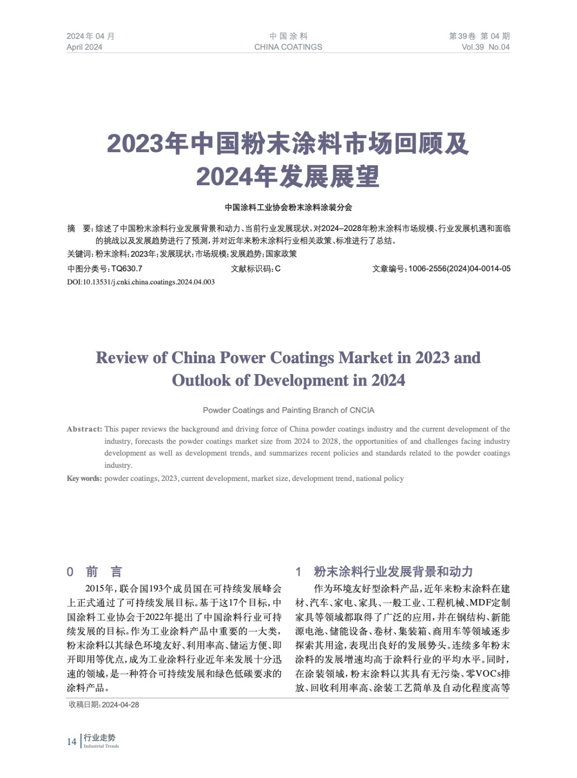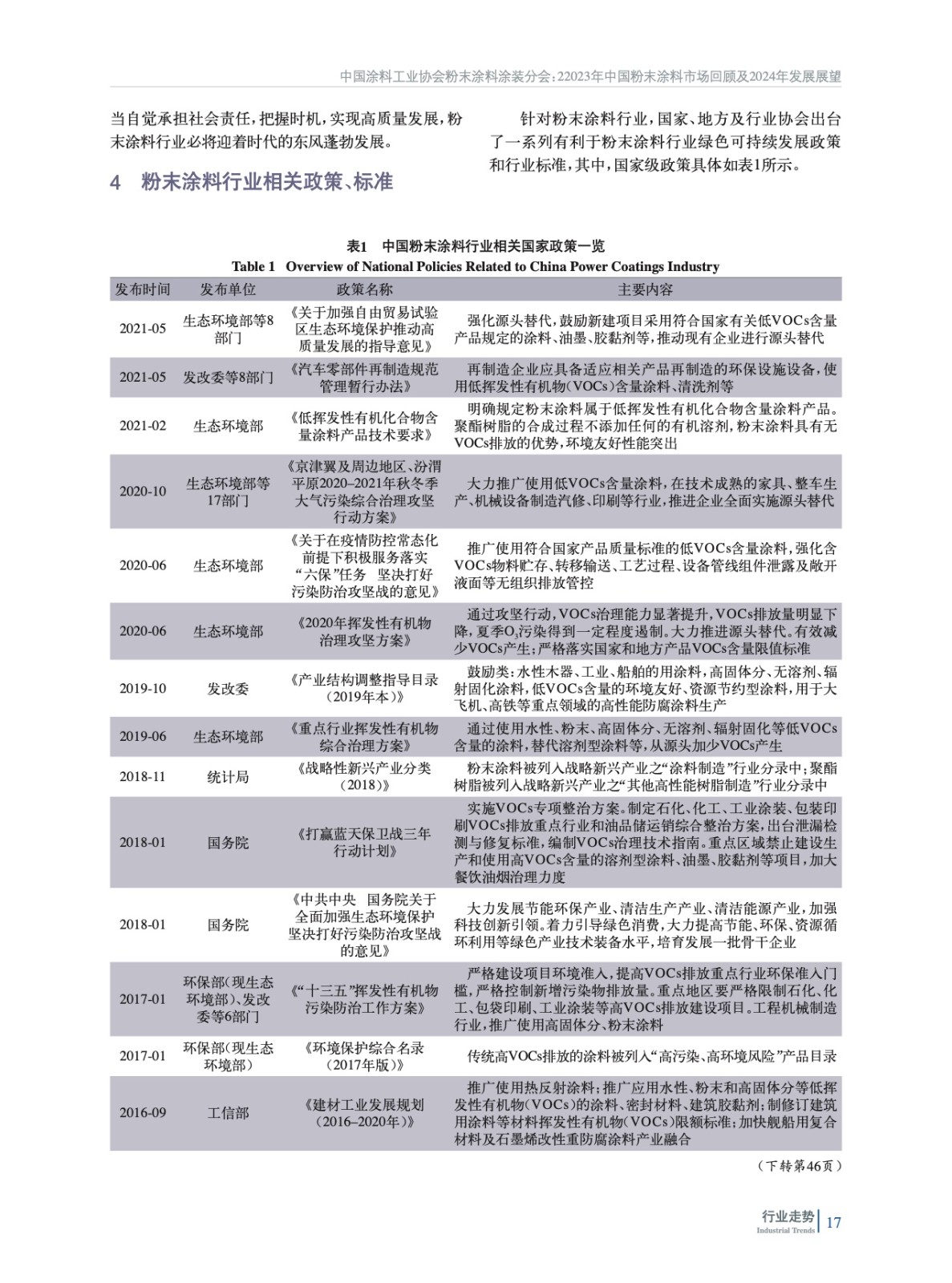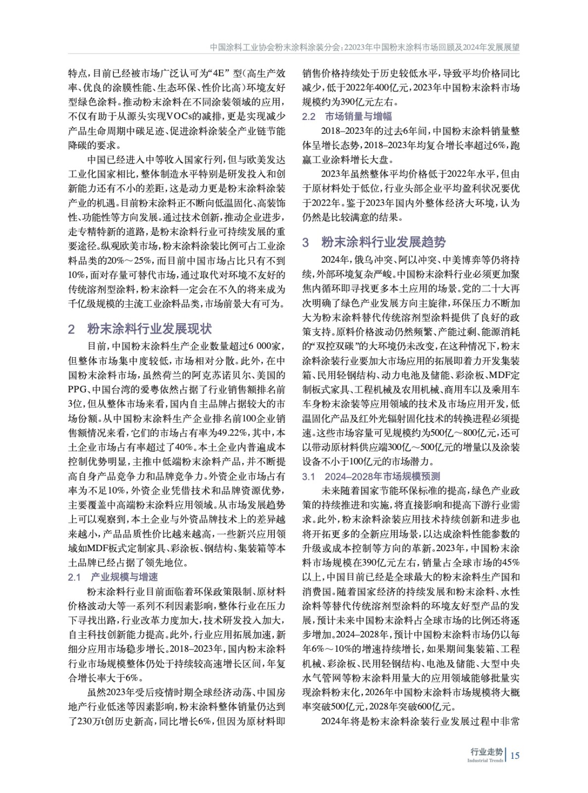 綜述了中國粉末涂料行業發展背景和動力、當前行業發展現狀,對2024–2028年粉末涂料市場規模、行業發展機遇和面臨的挑戰以及發展趨勢進行了預測,并對近年來粉末涂料行業相關政策、標準進行了總結。