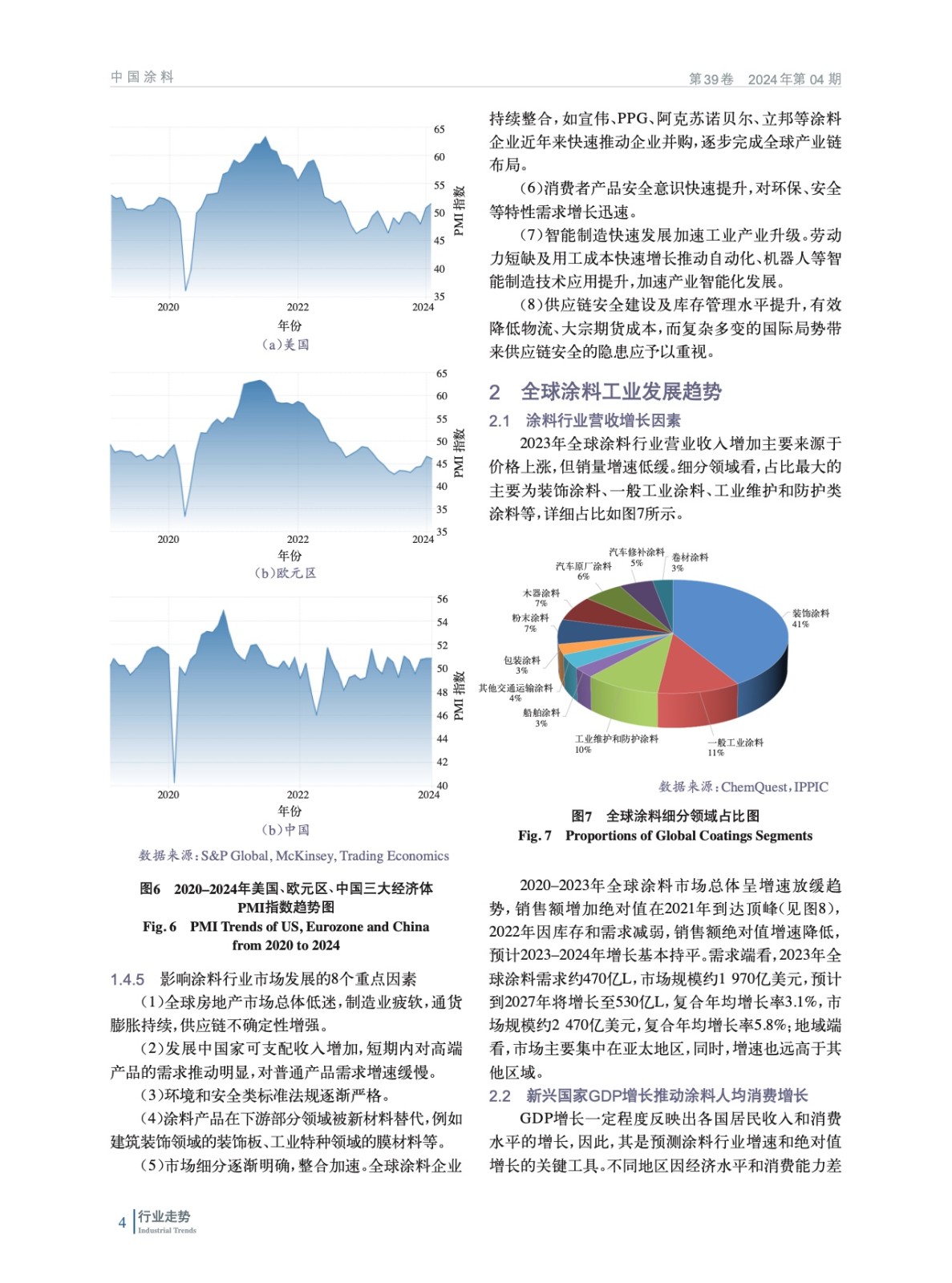 摘要:綜述了全球經濟概況、全球通脹和貿易對于涂料行業的影響,國際涂料行業整體動態。闡述了涂料行業營收增長因素、新興國家GDP增長推動涂料人均消費增長概況,著重分析了建筑裝飾涂料、原廠涂料、特種與防護涂料等重點涂料細分領域發展趨勢。并從全球經濟發展重要驅動方向對全球涂料工業未來發展進行了展望。