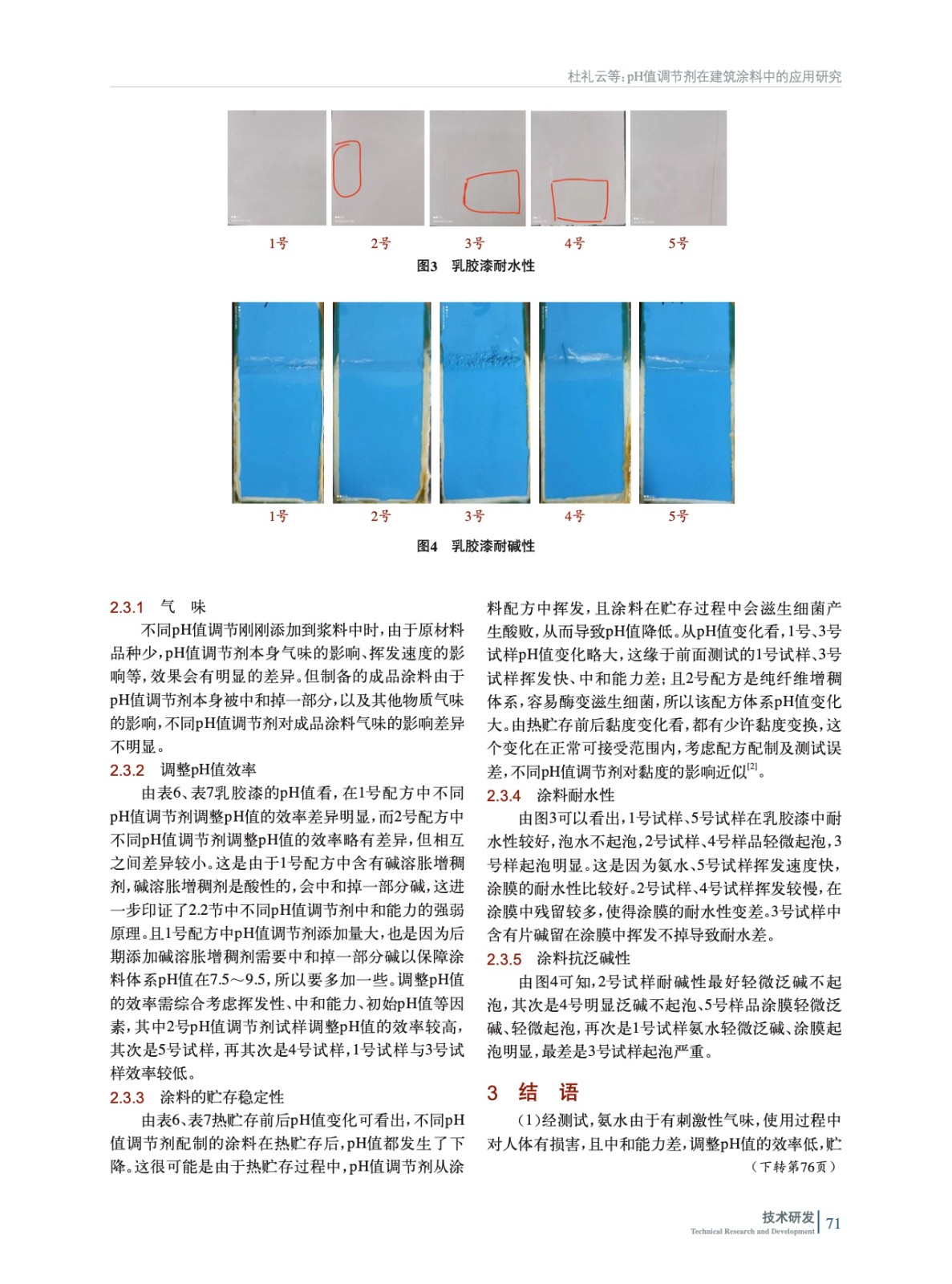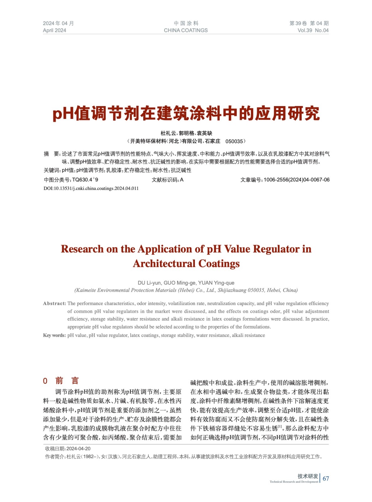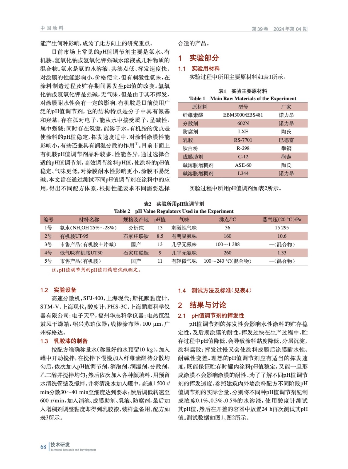 論述了市面常見pH值調節劑的性能特點、氣味大小、揮發速度、中和能力、pH值調節效率,以及在乳膠漆配方中其對涂料氣味、調整pH值效率、貯存穩定性、耐水性、抗泛堿性的影響,在實際中需要根據配方的性能需要選擇合適的pH值調節劑。