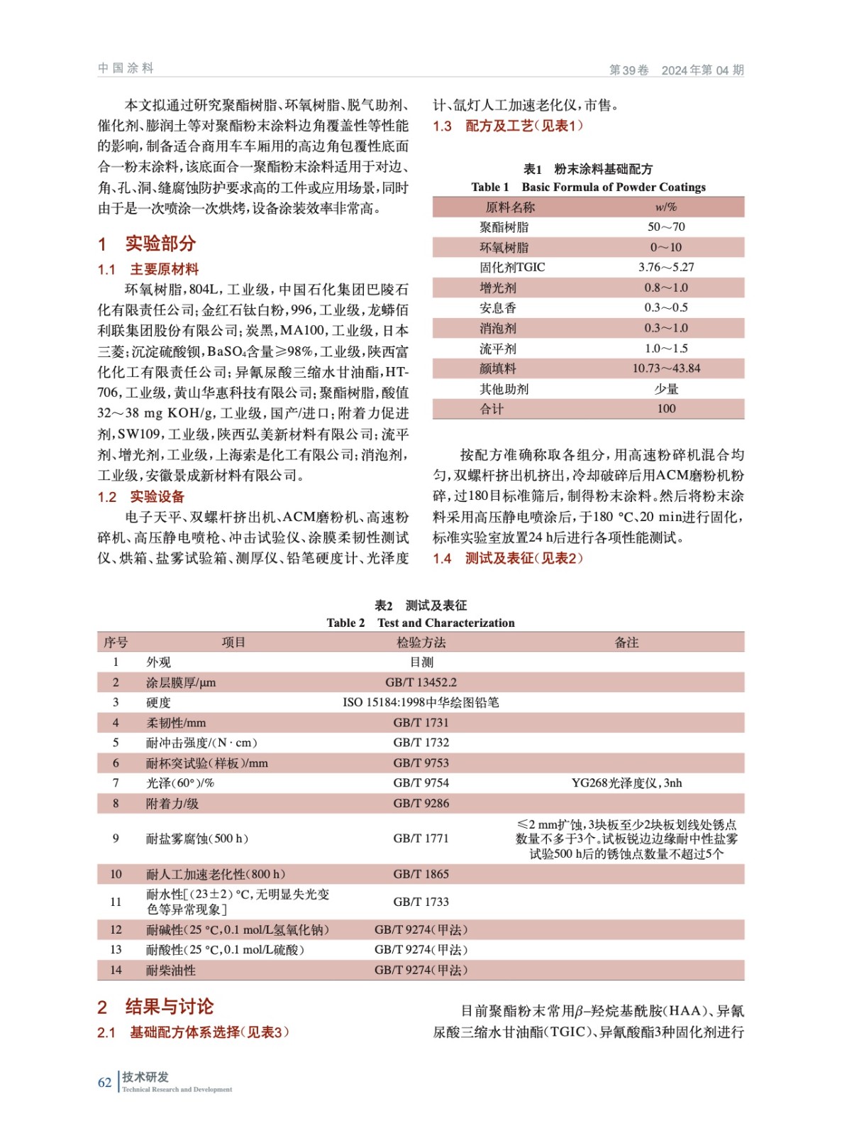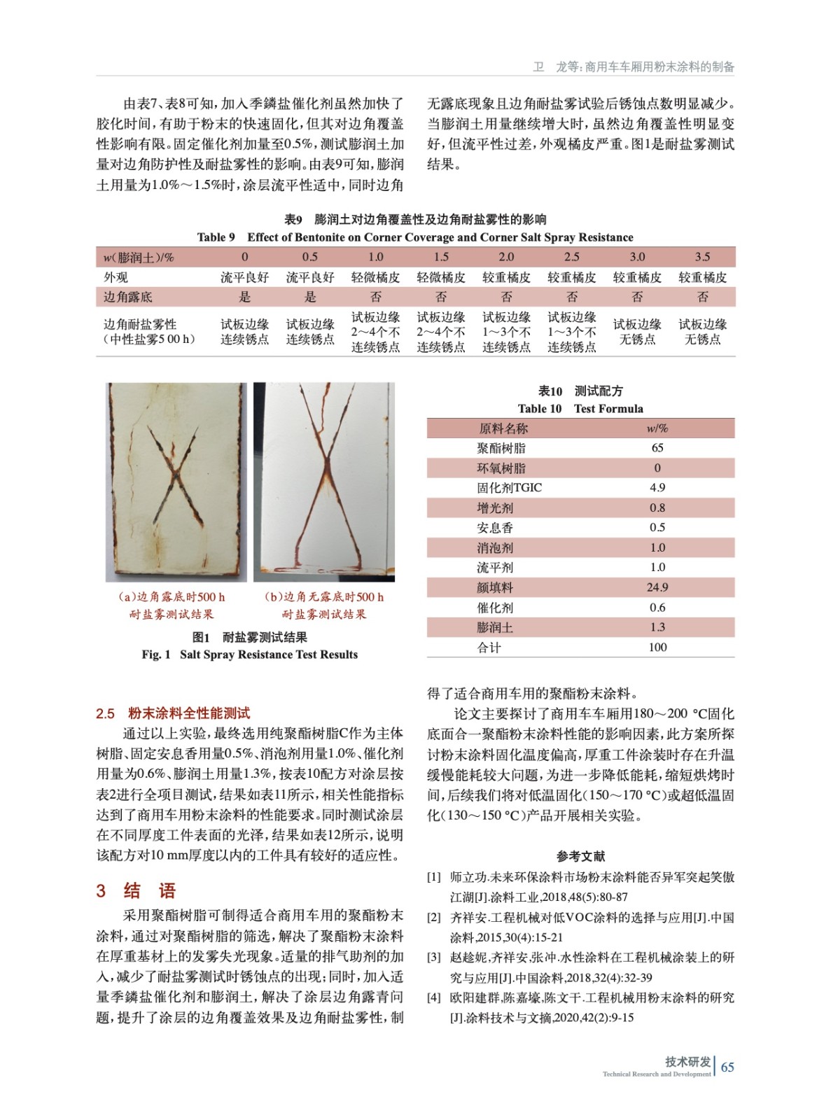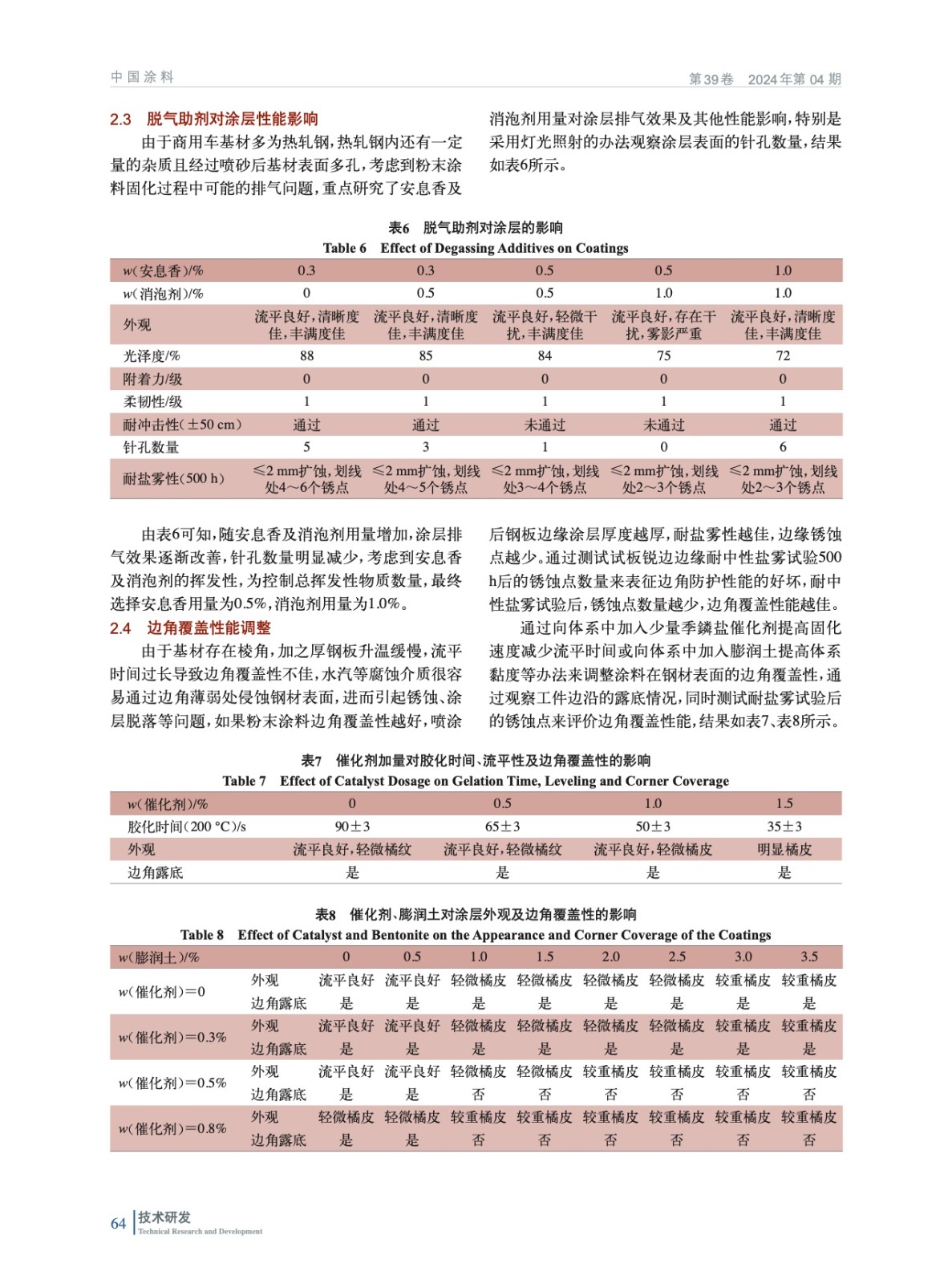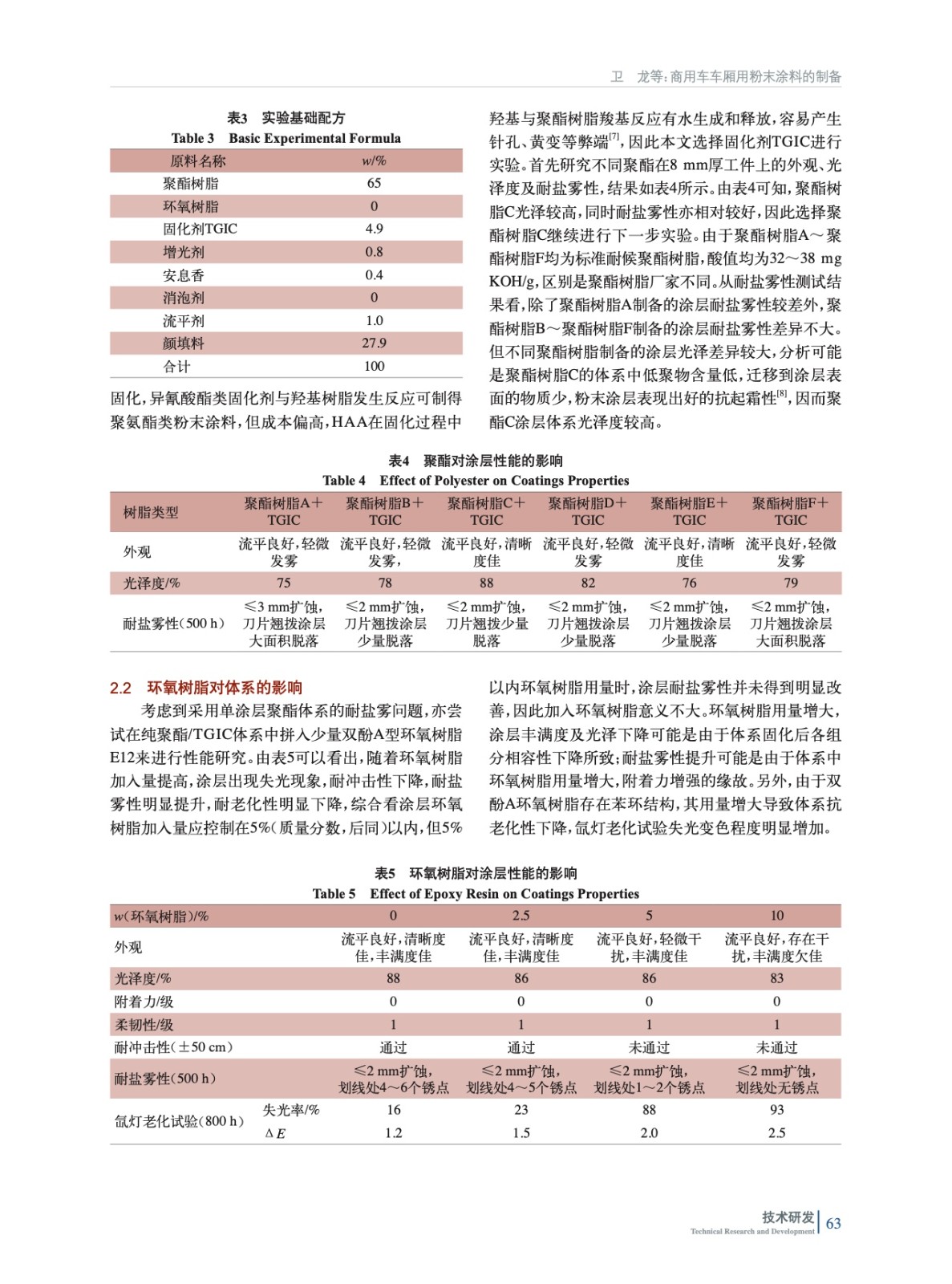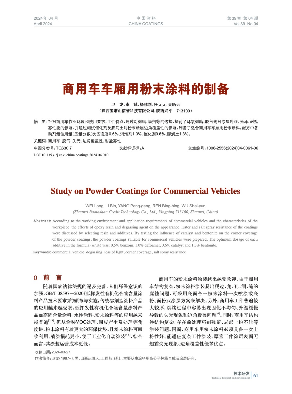 摘要:針對商用車作業(yè)環(huán)境和使用要求、工件特點,通過對樹脂、助劑等的選擇,探討了環(huán)氧樹脂、脫氣劑對涂層外觀、光澤、耐鹽霧性能的影響,并通過測試催化劑及膨潤土對粉末涂層邊角覆蓋性的影響,制備了適合商用車車廂用粉末涂料,配方中各助劑最佳用量(質(zhì)量分數(shù))為安息香0.5%、消泡劑1.0%、催化劑0.6%、膨潤土1.3%。
