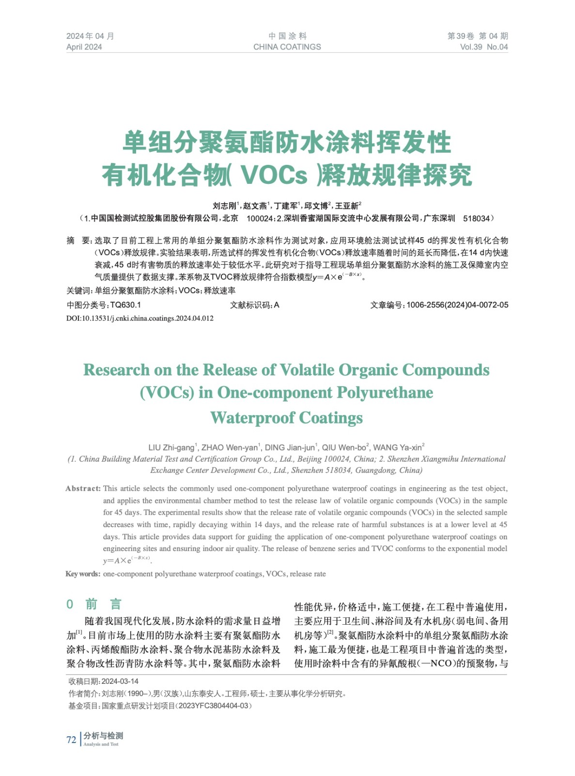 單組分聚氨酯防水涂料揮發性有機化合物(VOCs)釋放規律探究