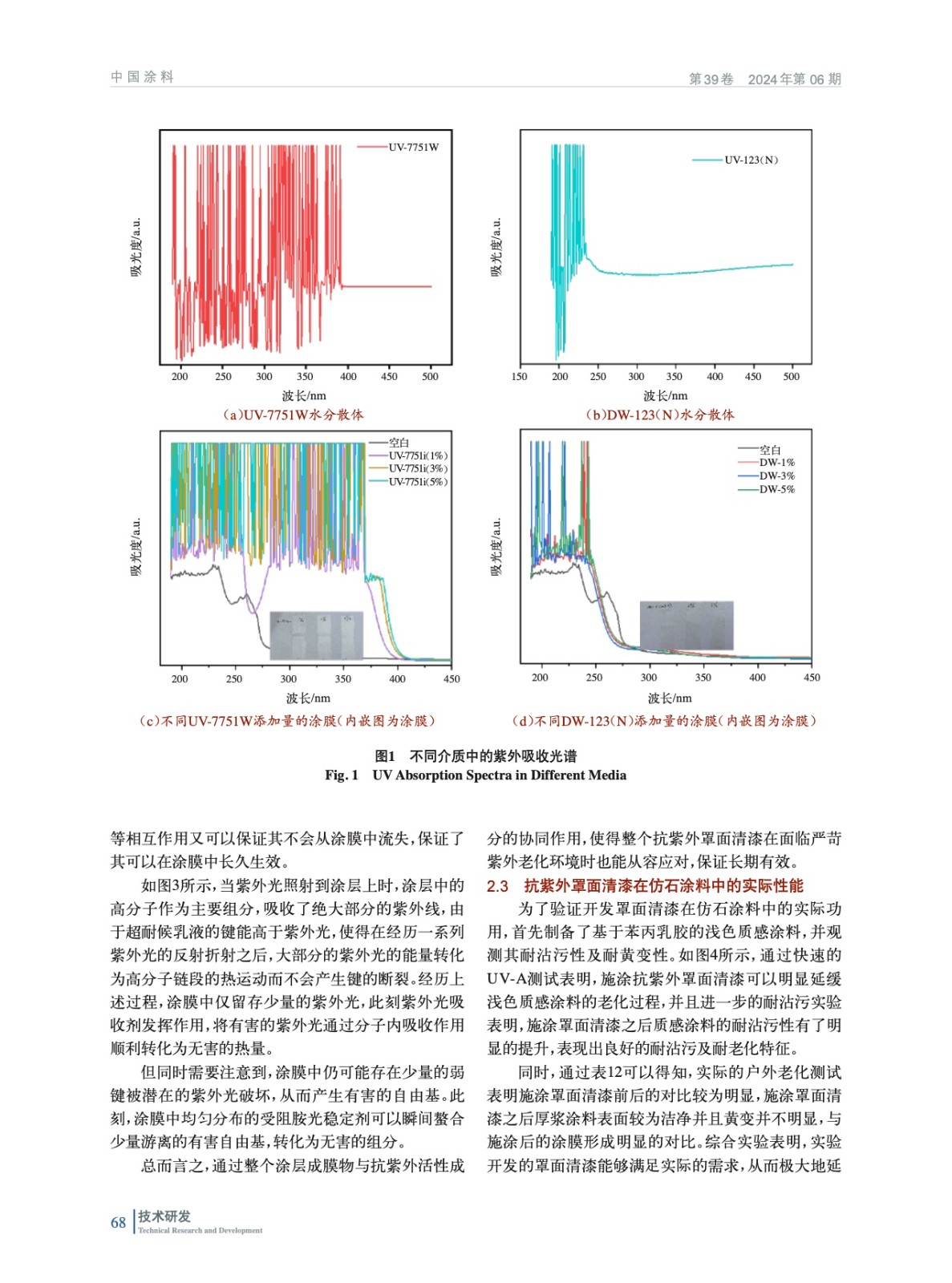 摘要:開發(fā)一款具有耐老化性能的罩面清漆,不僅可以起到屏蔽紫外線的功效,而且方便施工,具有極佳的便捷性與適用性。實(shí)驗(yàn)結(jié)果表明,實(shí)驗(yàn)開發(fā)的罩面清漆具有優(yōu)異的耐老化性能,涂層整體抗老化性能的明顯提升,紫外吸收光譜表明,UV-7751W相較于DW-123(N)在紫外波段有更寬泛的響應(yīng)區(qū)間,表現(xiàn)出更良好的抗紫外老化性能,且復(fù)配紫外光吸收劑性能更優(yōu),其他基礎(chǔ)涂膜性能如耐沾污性(<10%)和耐洗刷性(>10 000次)遠(yuǎn)超標(biāo)準(zhǔn),這對(duì)于長(zhǎng)久地保持建筑物清潔自然,延長(zhǎng)建筑物的翻新周期,節(jié)約自然資源至關(guān)重要,符合新時(shí)代的發(fā)展要求。