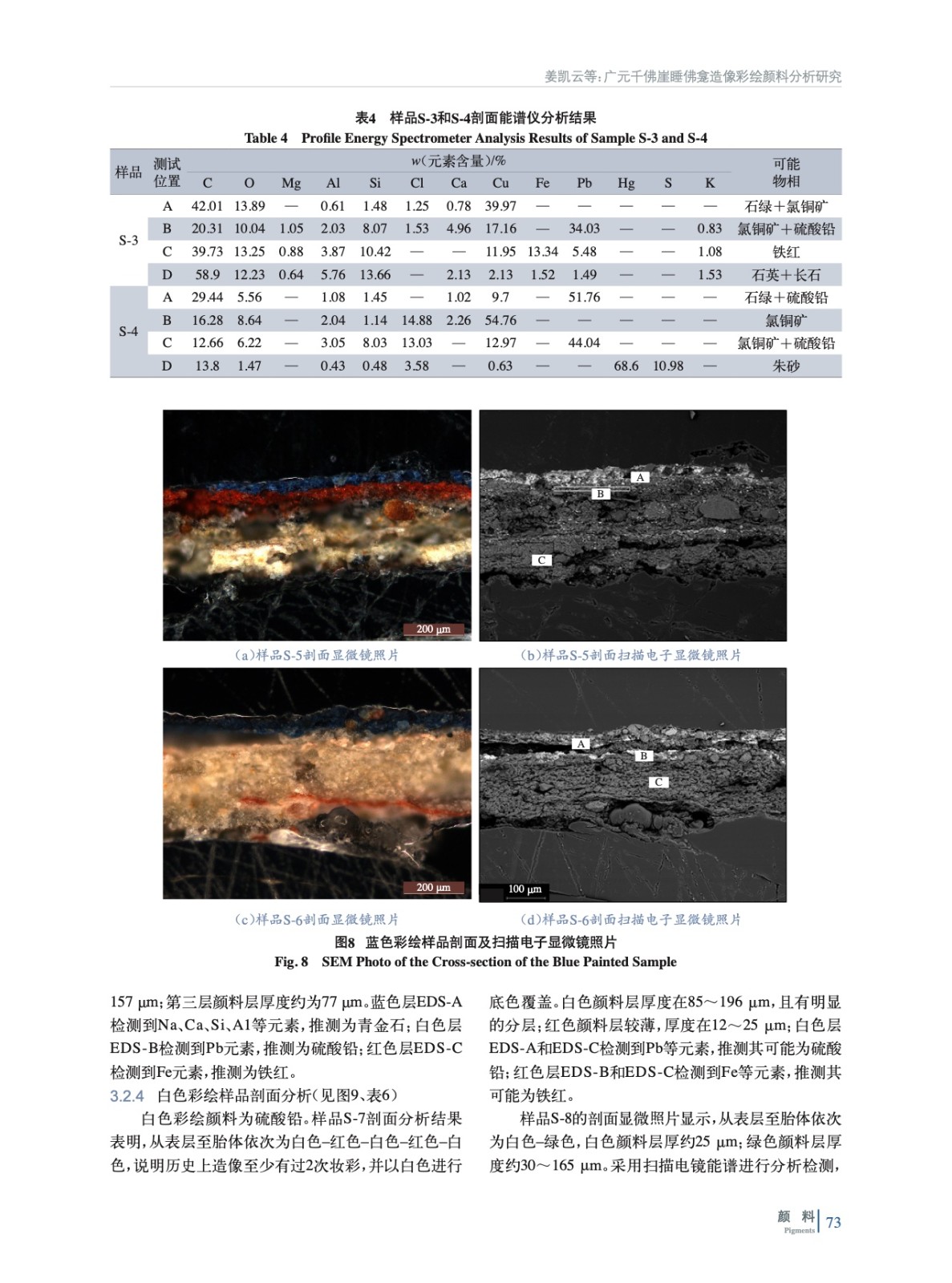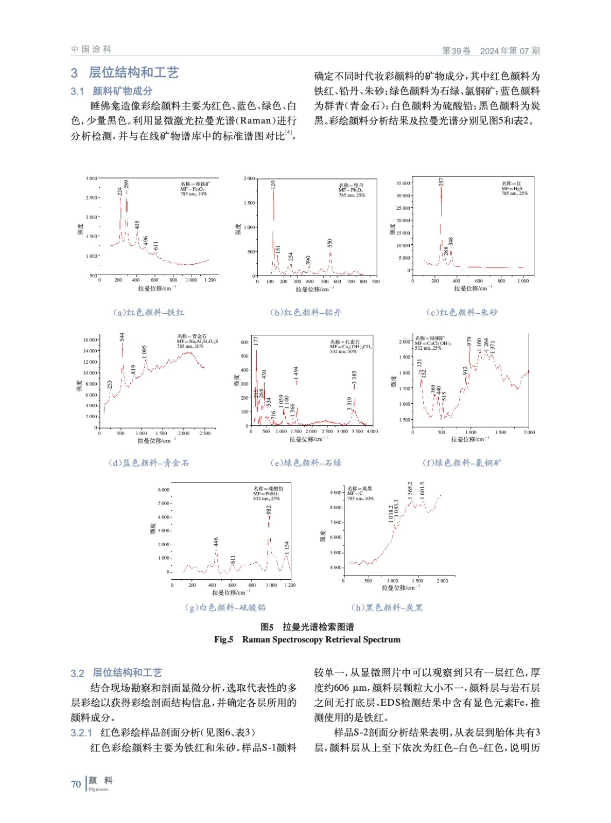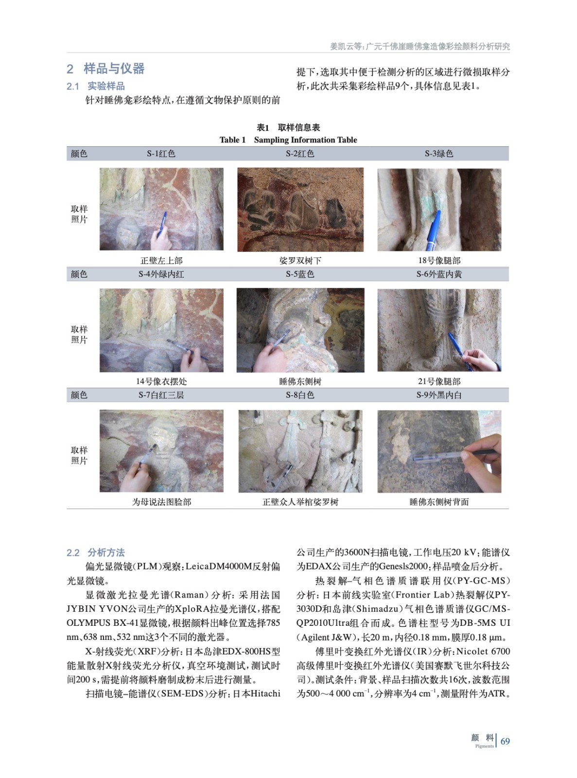 摘要:睡佛龕開鑿于唐高宗末至武周時期,造像多次妝彩。以睡佛龕造像彩繪為研究對象,應(yīng)用Raman、XRF、XRD、SEM-EDS、PY-GC-MS等多種檢測方法對彩繪顏料層進(jìn)行分析研究,結(jié)果表明:歷史上造像妝彩多達(dá)3次,彩繪紅色顏料為鐵紅、鉛丹、朱砂,藍(lán)色顏料為青金石,綠色顏料為堿式氯化銅、石綠,白色顏料為硫酸鉛,黑色顏料為炭黑,膠結(jié)材料為動物膠。該研究成果為后續(xù)保護(hù)修復(fù)工作提供了科學(xué)依據(jù)。