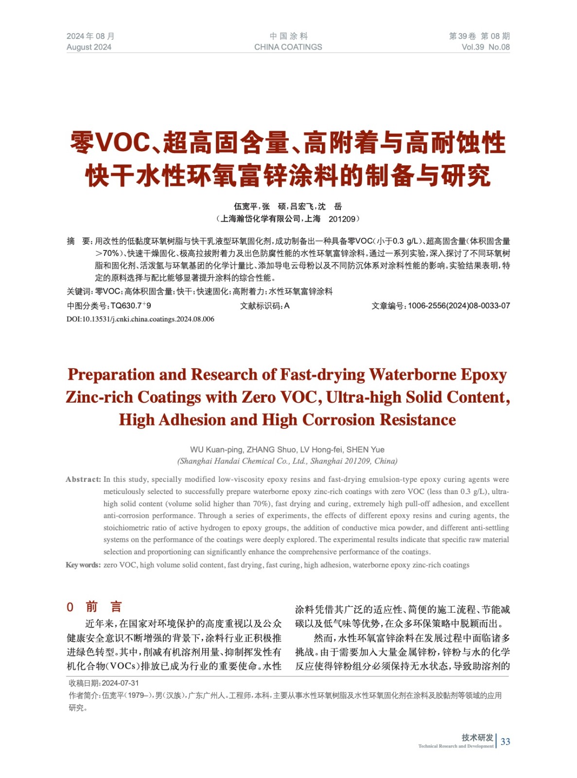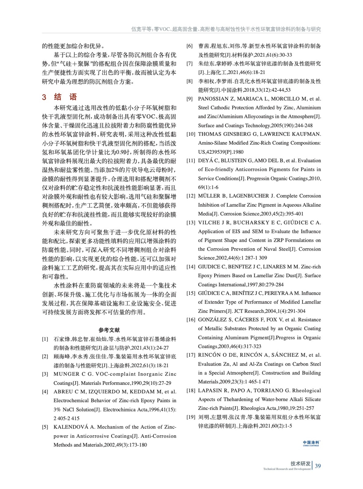 零VOC、超高固含量、高附著與高耐蝕性快干水性環(huán)氧富鋅涂料的制備與研究