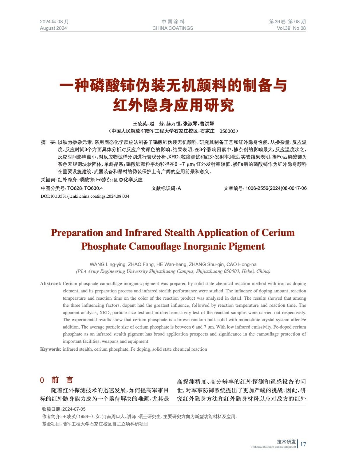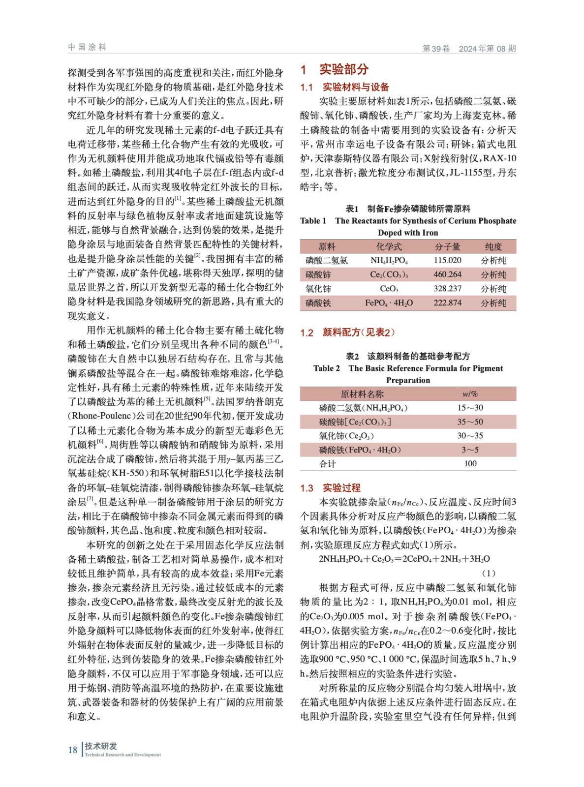 一種磷酸鈰偽裝無機顏料的制備與紅外隱身應(yīng)用研究