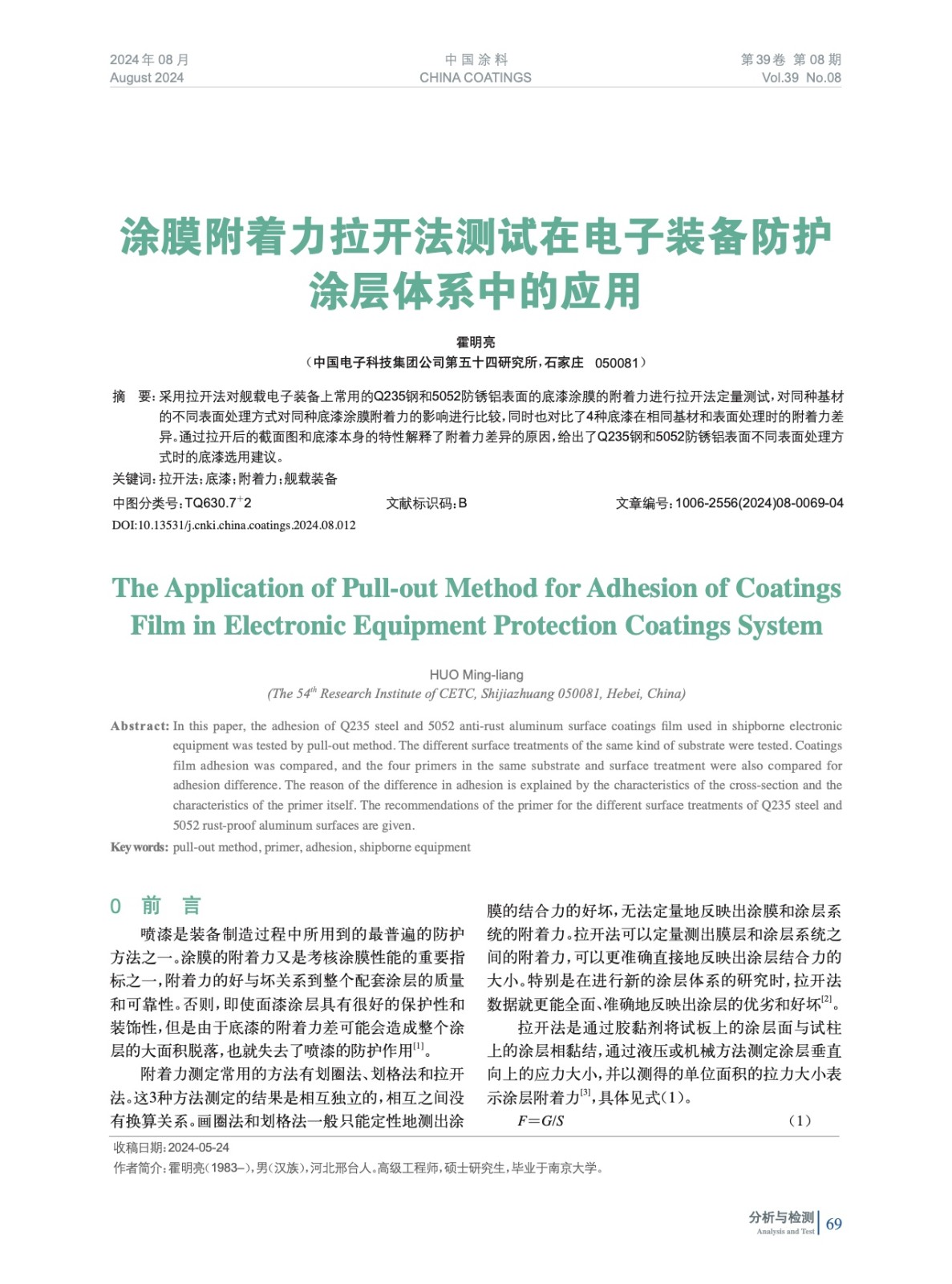 涂膜附著力拉開(kāi)法測(cè)試在電子裝備防護(hù)涂層體系中的應(yīng)用