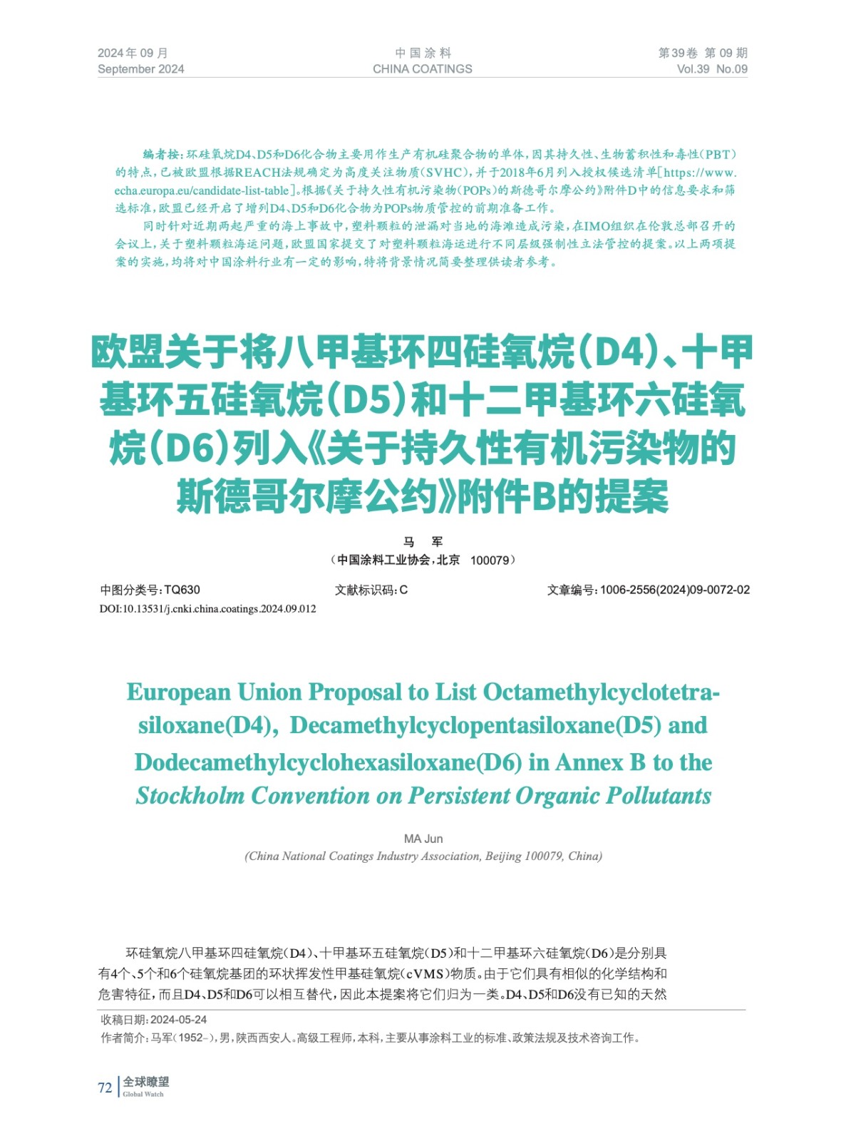 歐盟關于將八甲基環(huán)四硅氧烷(D4)、十甲基環(huán)五硅氧烷(D5)和十二甲基環(huán)六硅氧烷(D6)列入《關于持久性有機污染物的斯德哥爾摩公約》附件B的提案