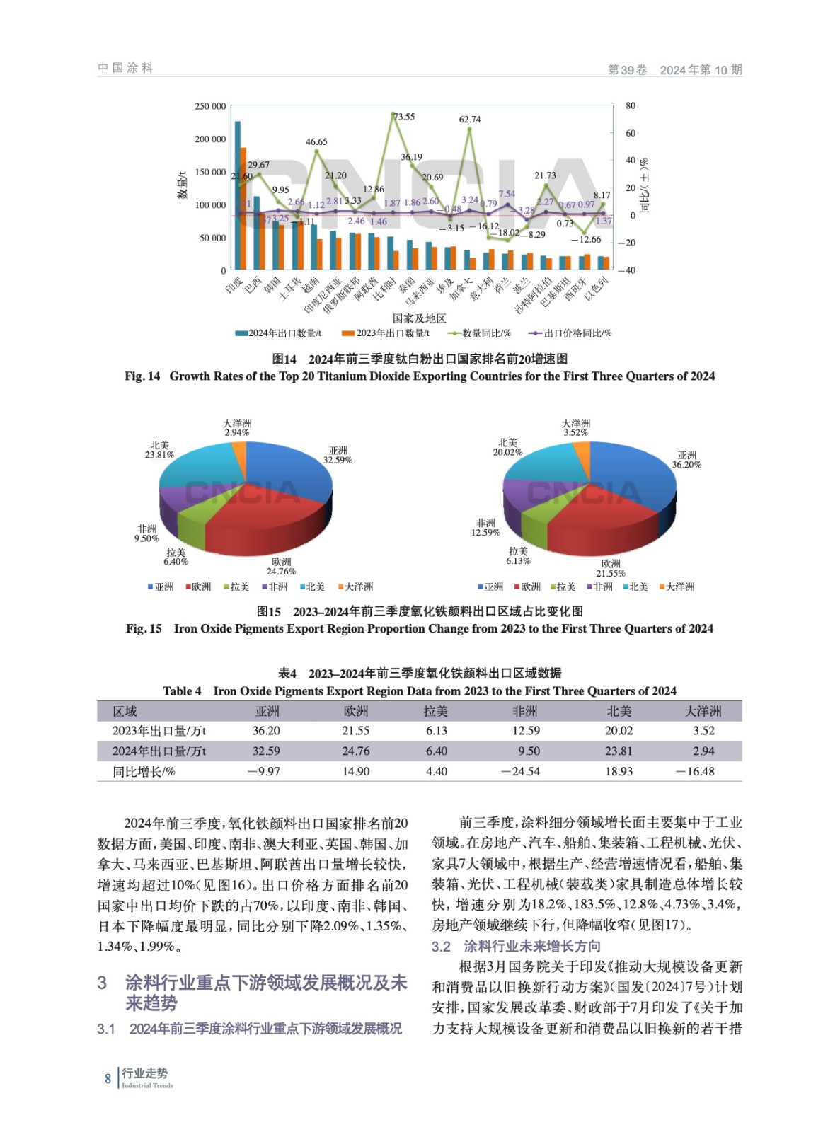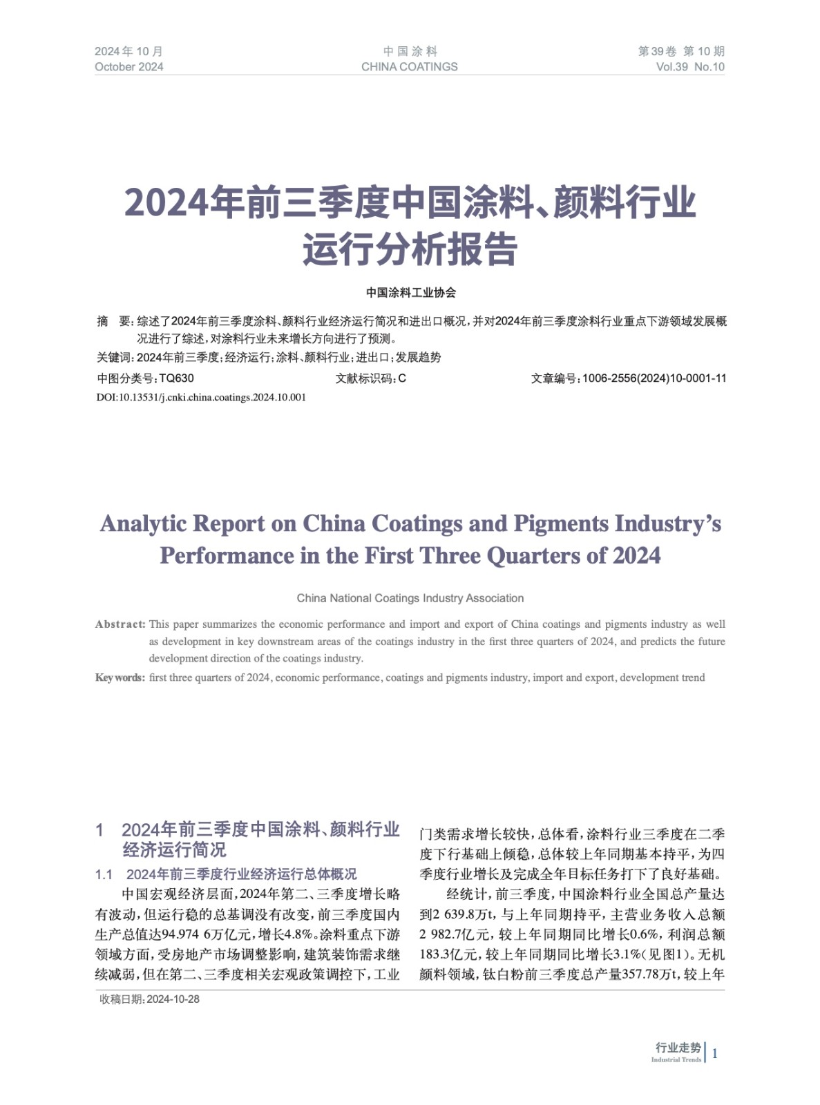 綜述了2024年前三季度涂料、顏料行業經濟運行簡況和進出口概況,并對2024年前三季度涂料行業重點下游領域發展概況進行了綜述,對涂料行業未來增長方向進行了預測。
