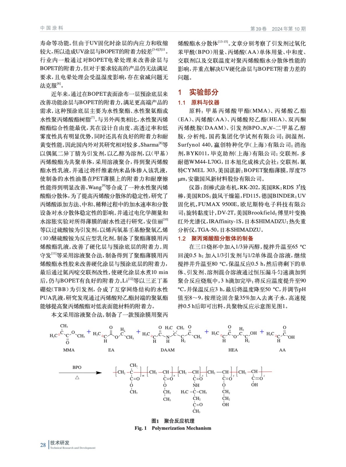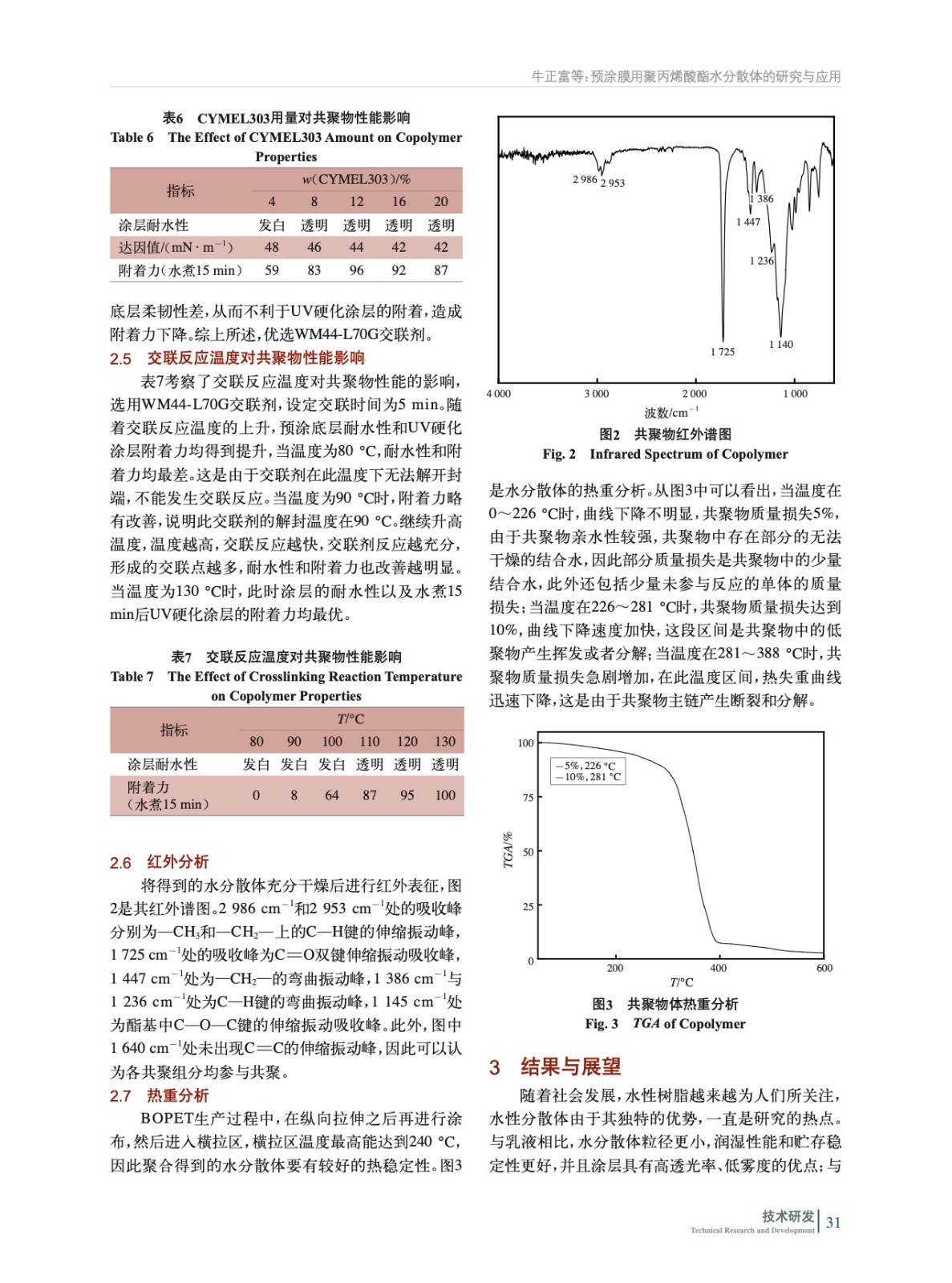 摘要:采用溶液聚合制備了一款預涂膜用聚丙烯酸酯水分散體,將其涂覆在聚酯薄膜表面得到預涂膜。研究了引發劑過氧化苯甲酰(BPO)用量、丙烯酸(AA)用量、中和度、不同交聯劑改性以及交聯溫度對聚丙烯酸酯水分散體性能的影響。結果表明:BPO用量為1.4%(質量分數,后同),AA用量8%,中和度80%,交聯劑WM44-L70G用量16%,交聯反應條件為130 ℃、5 min時,UV硬化涂層在預涂膜上的附著力最佳。