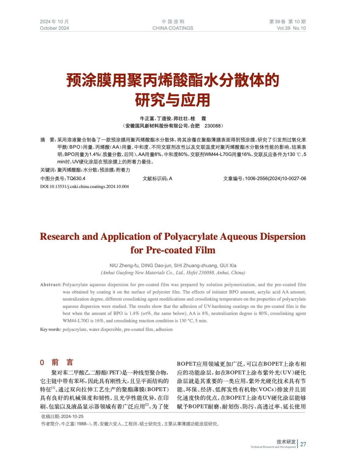 本文系作者@牛正富,丁道俊,師壯壯,桂 霞 授權中國涂料網發表,并經中國涂料網編輯,未經允許不得轉載,如需轉載請聯系chinacoatingnet@vip.163.com