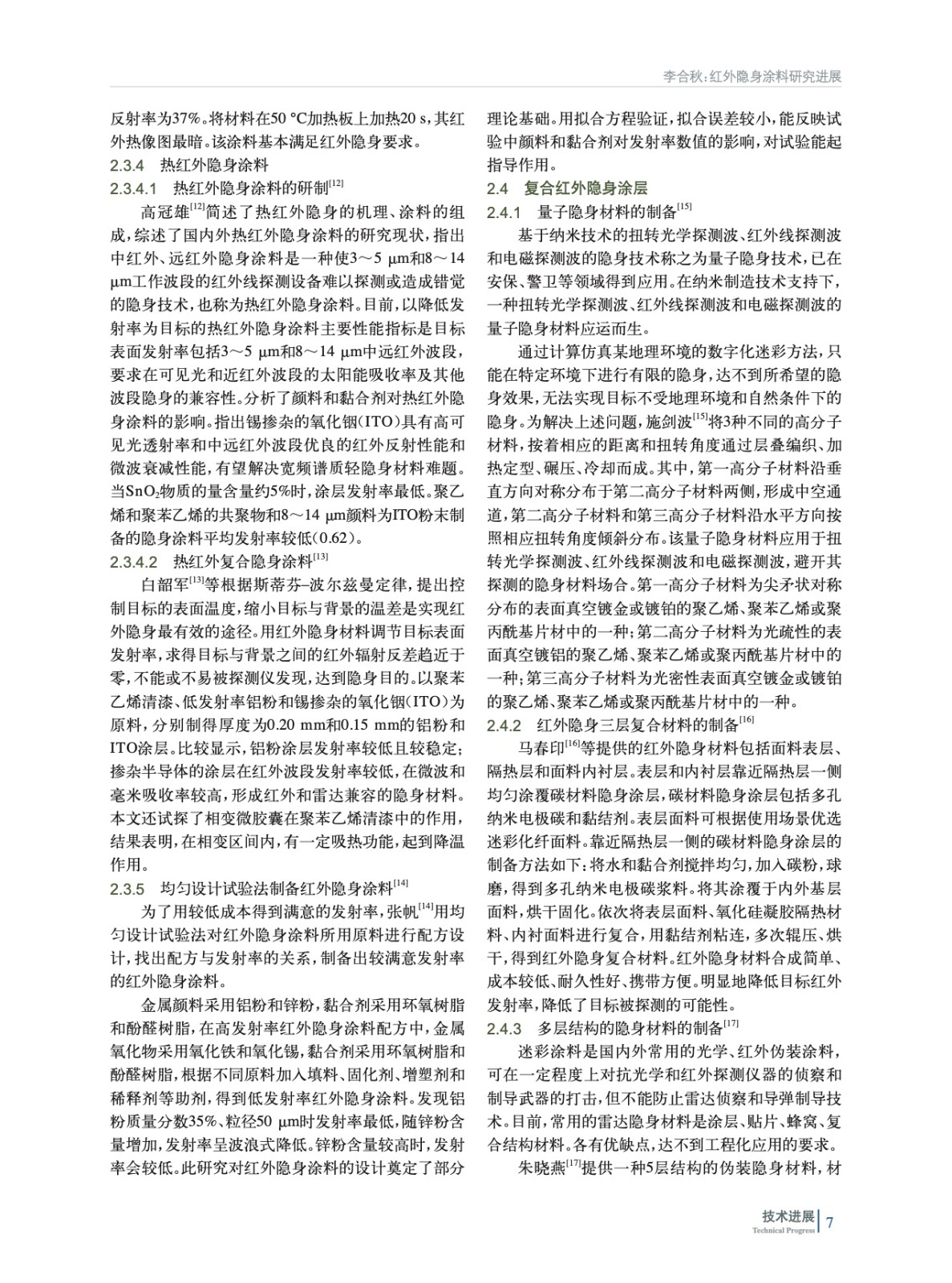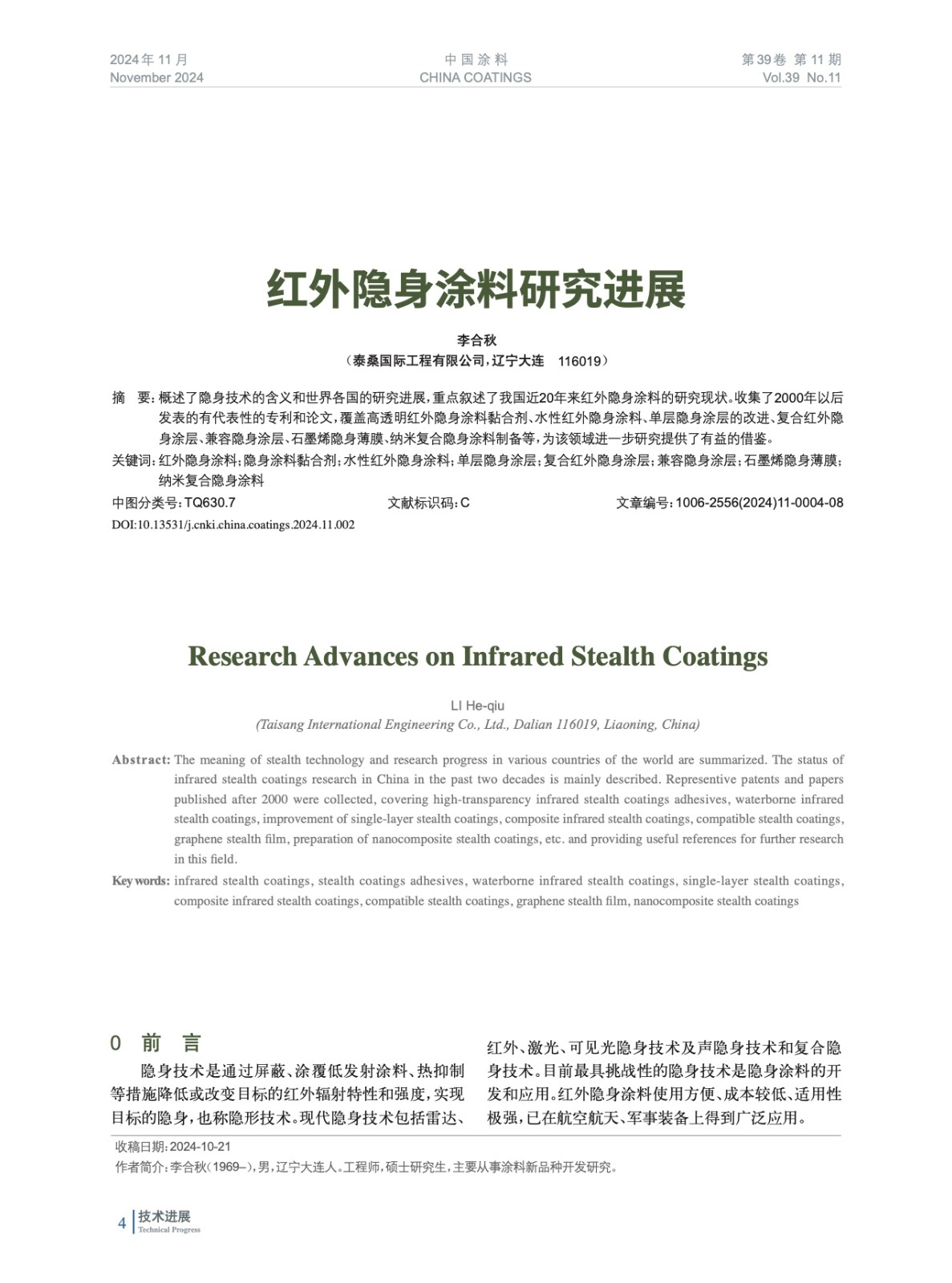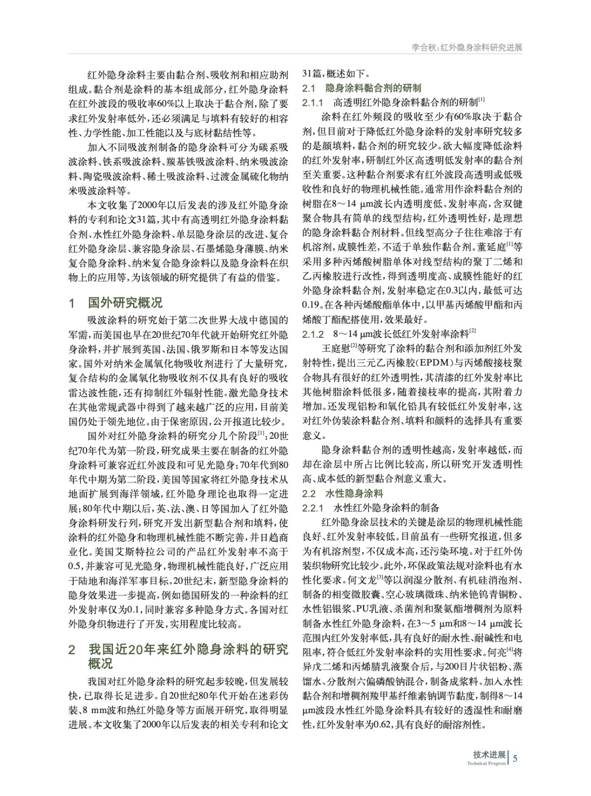 摘要:概述了隱身技術(shù)的含義和世界各國(guó)的研究進(jìn)展,重點(diǎn)敘述了我國(guó)近20年來(lái)紅外隱身涂料的研究現(xiàn)狀。收集了2000年以后發(fā)表的有代表性的專利和論文,覆蓋高透明紅外隱身涂料黏合劑、水性紅外隱身涂料、單層隱身涂層的改進(jìn)、復(fù)合紅外隱身涂層、兼容隱身涂層、石墨烯隱身薄膜、納米復(fù)合隱身涂料制備等,為該領(lǐng)域進(jìn)一步研究提供了有益的借鑒。