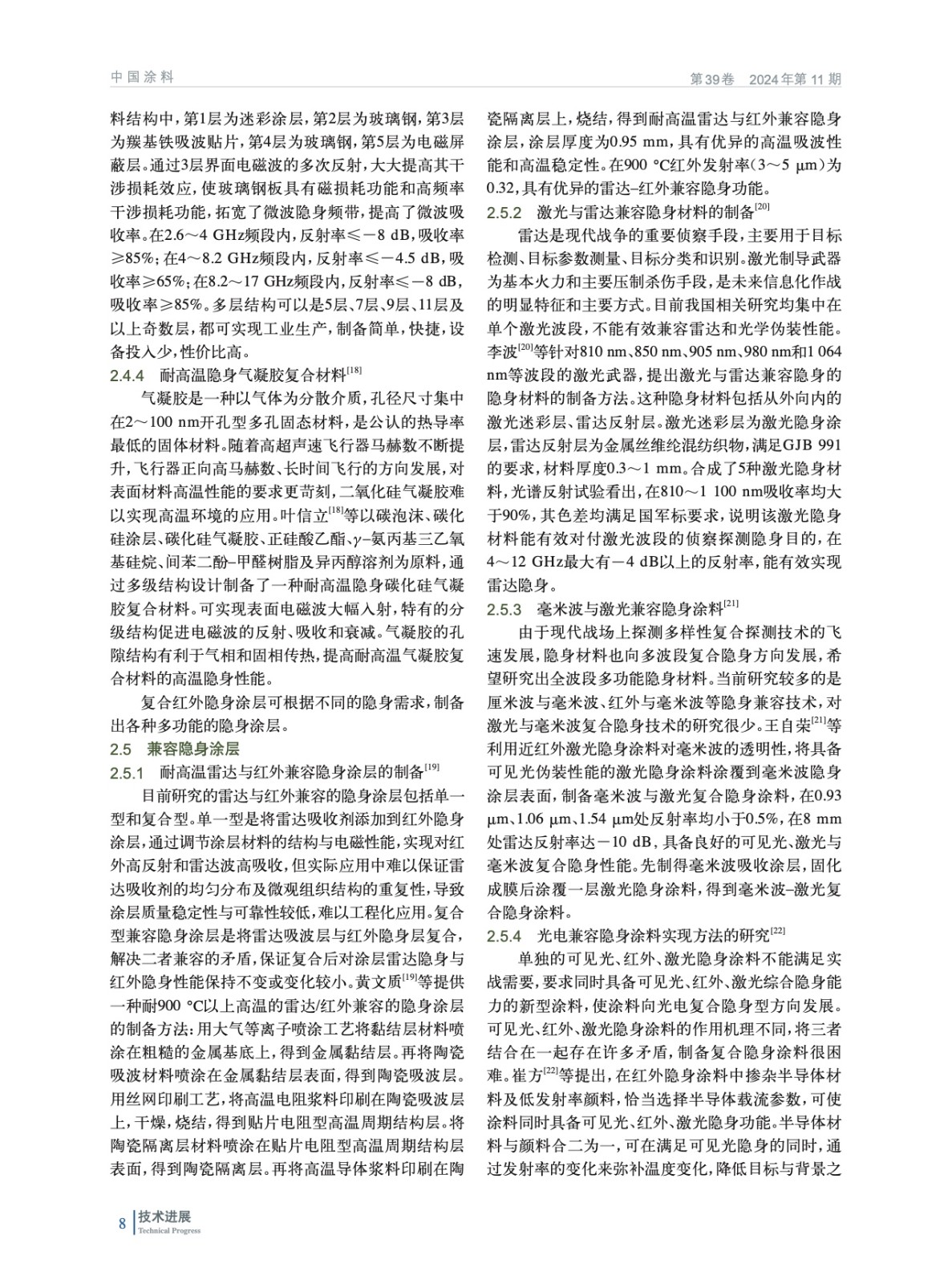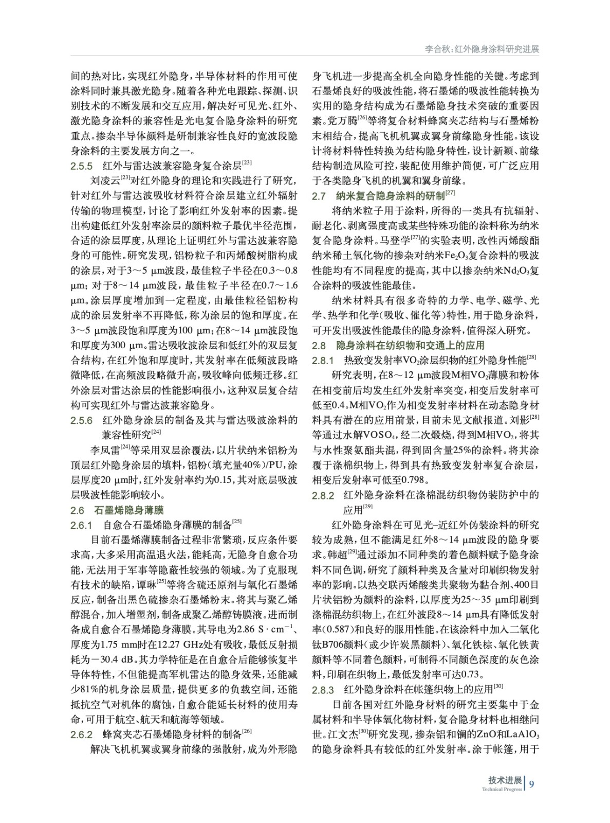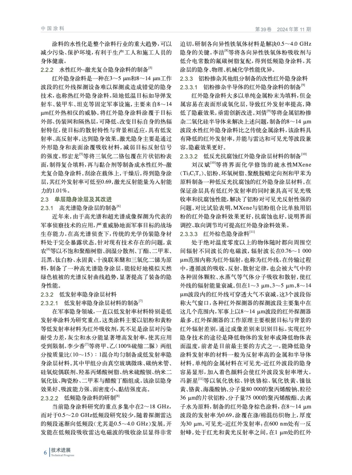 摘要:概述了隱身技術(shù)的含義和世界各國(guó)的研究進(jìn)展,重點(diǎn)敘述了我國(guó)近20年來(lái)紅外隱身涂料的研究現(xiàn)狀。收集了2000年以后發(fā)表的有代表性的專利和論文,覆蓋高透明紅外隱身涂料黏合劑、水性紅外隱身涂料、單層隱身涂層的改進(jìn)、復(fù)合紅外隱身涂層、兼容隱身涂層、石墨烯隱身薄膜、納米復(fù)合隱身涂料制備等,為該領(lǐng)域進(jìn)一步研究提供了有益的借鑒。