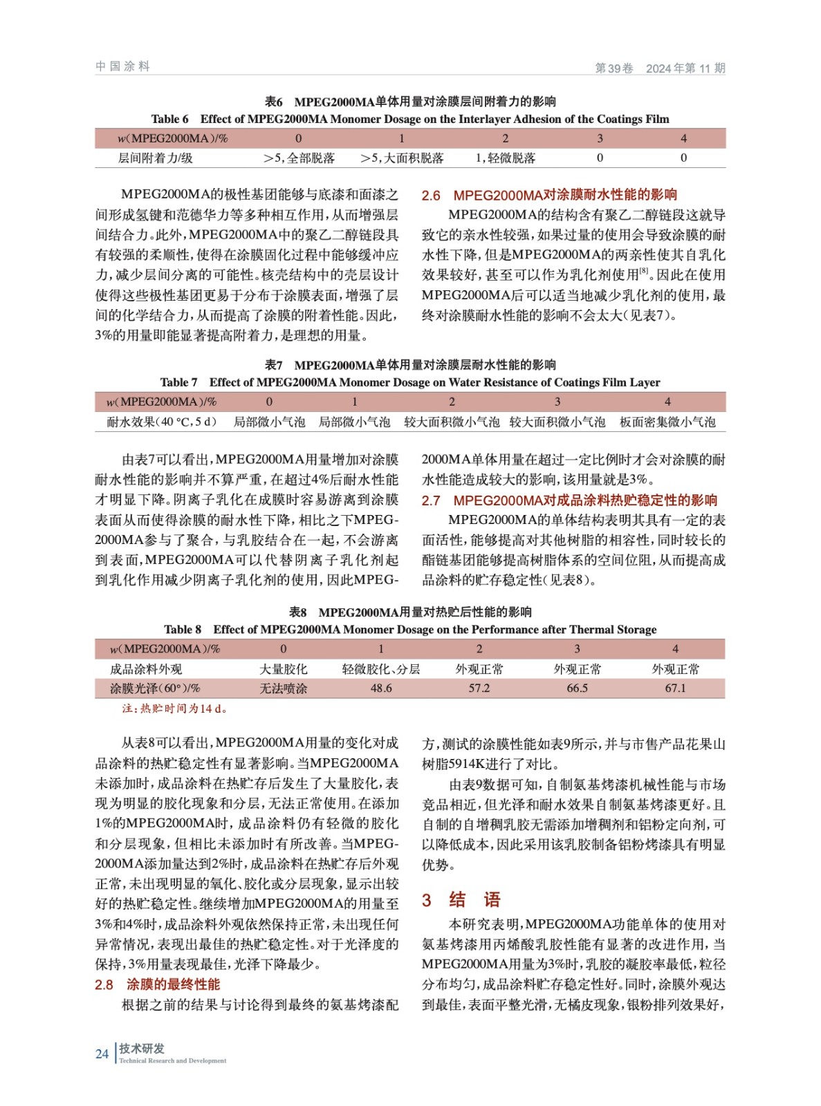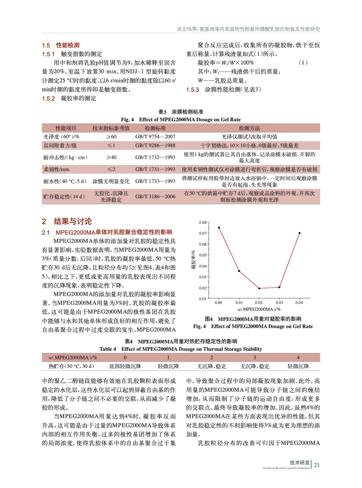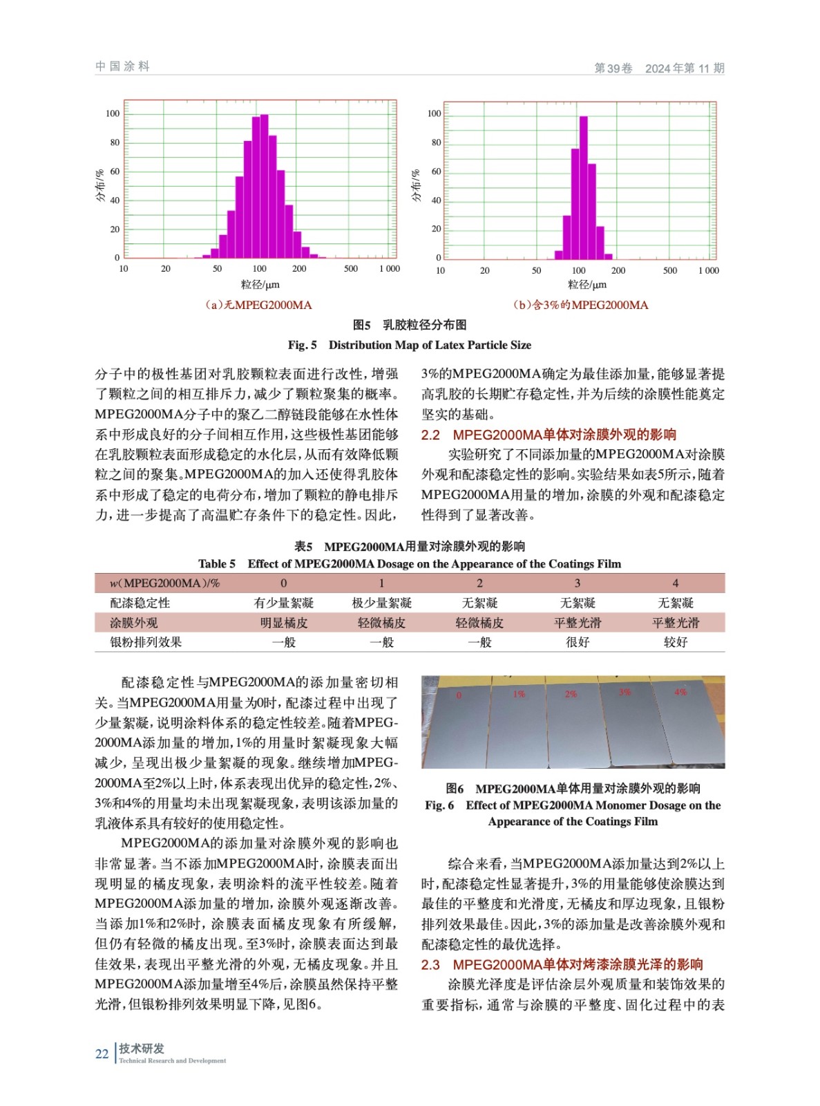 摘要:以甲基丙烯酸甲酯(MMA)、丙烯酸丁酯(BA)、甲基丙烯酸(MAA)、甲基丙烯酸羥乙酯(HEMA)為單體,甲氧基聚乙二醇甲基丙烯酸酯(MPEG2000MA)為功能單體,制備出了氨基烤漆用高裝飾性的核殼型羥基丙烯酸乳膠。實(shí)驗(yàn)結(jié)果表明,MPEG2000MA功能單體能夠很好地提高氨基烤漆涂膜的銀粉排列效果、光澤以及具有良好的層間附著力,且當(dāng)功能單體MPEG2000MA質(zhì)量分?jǐn)?shù)在3%,并分布在乳膠殼外層時(shí),所制備的氨基烤漆流平性好,觸變指數(shù)高,銀排效果好,重涂層間附著力強(qiáng)。