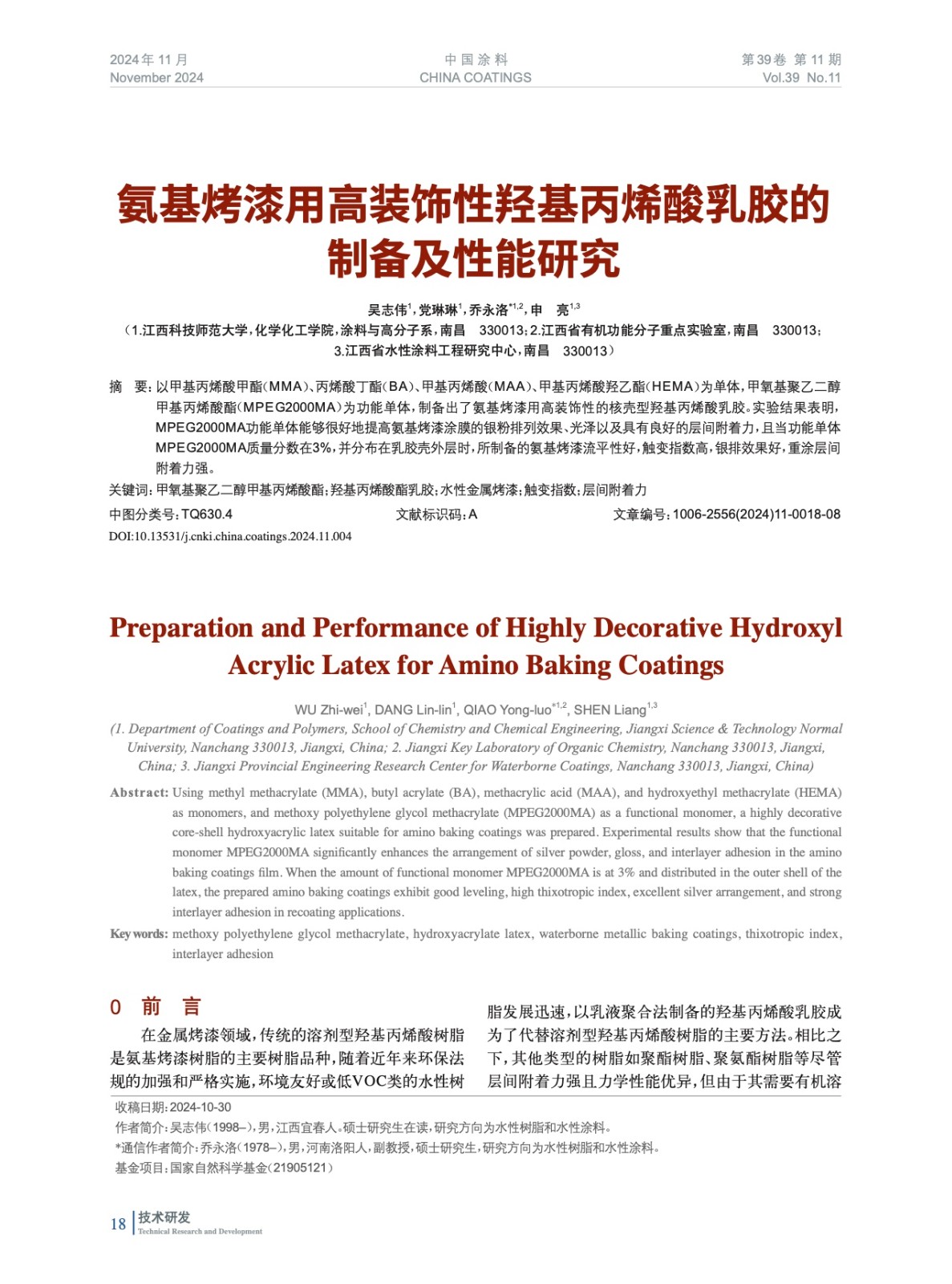 氨基烤漆用高裝飾性羥基丙烯酸乳膠的制備及性能研究