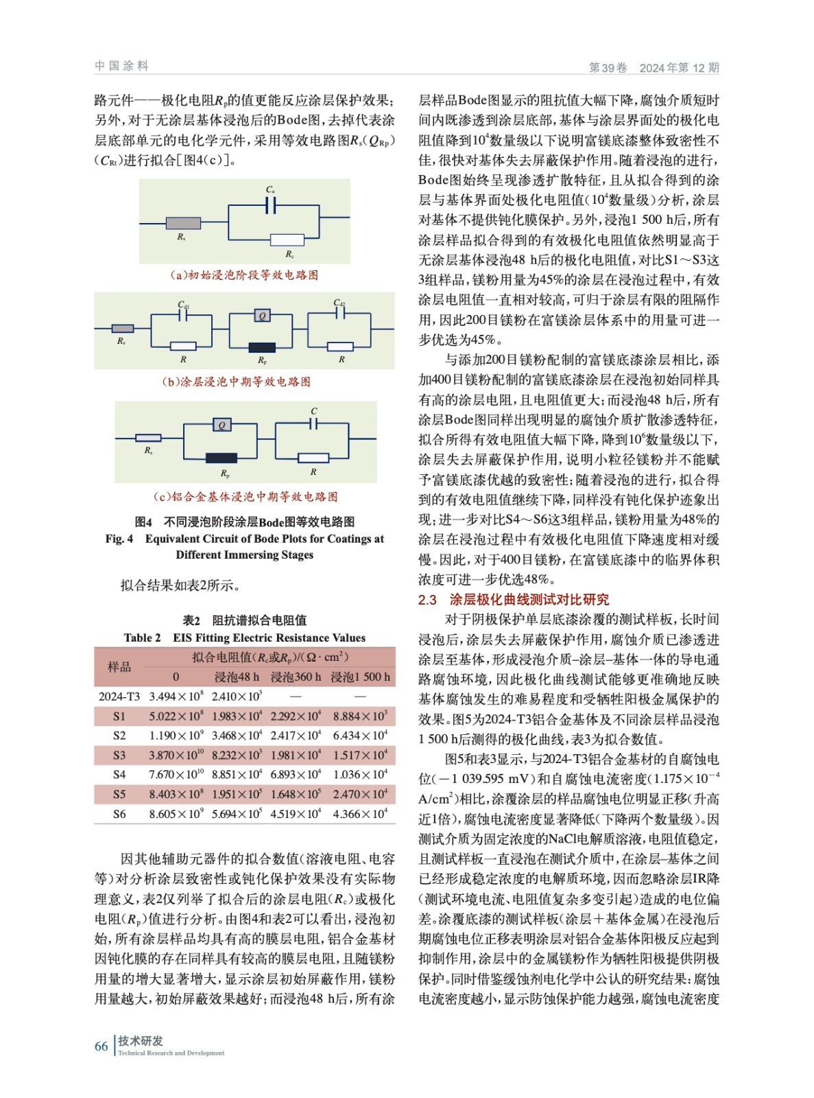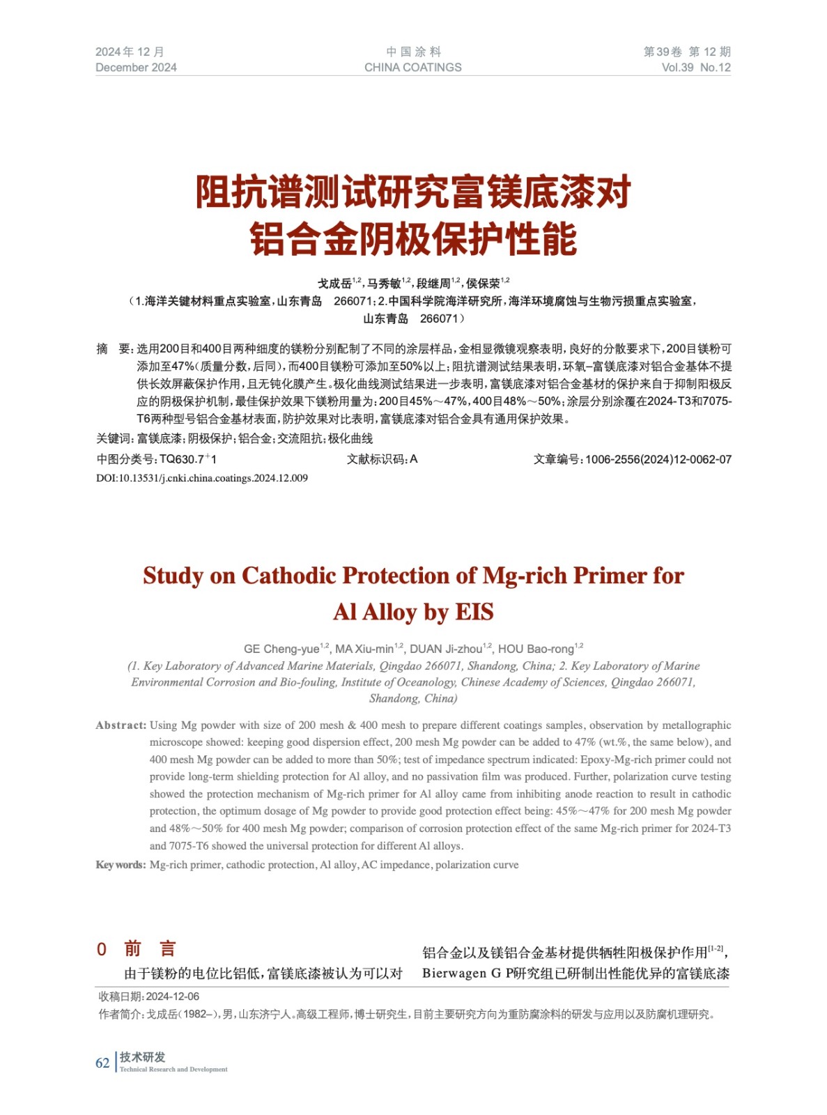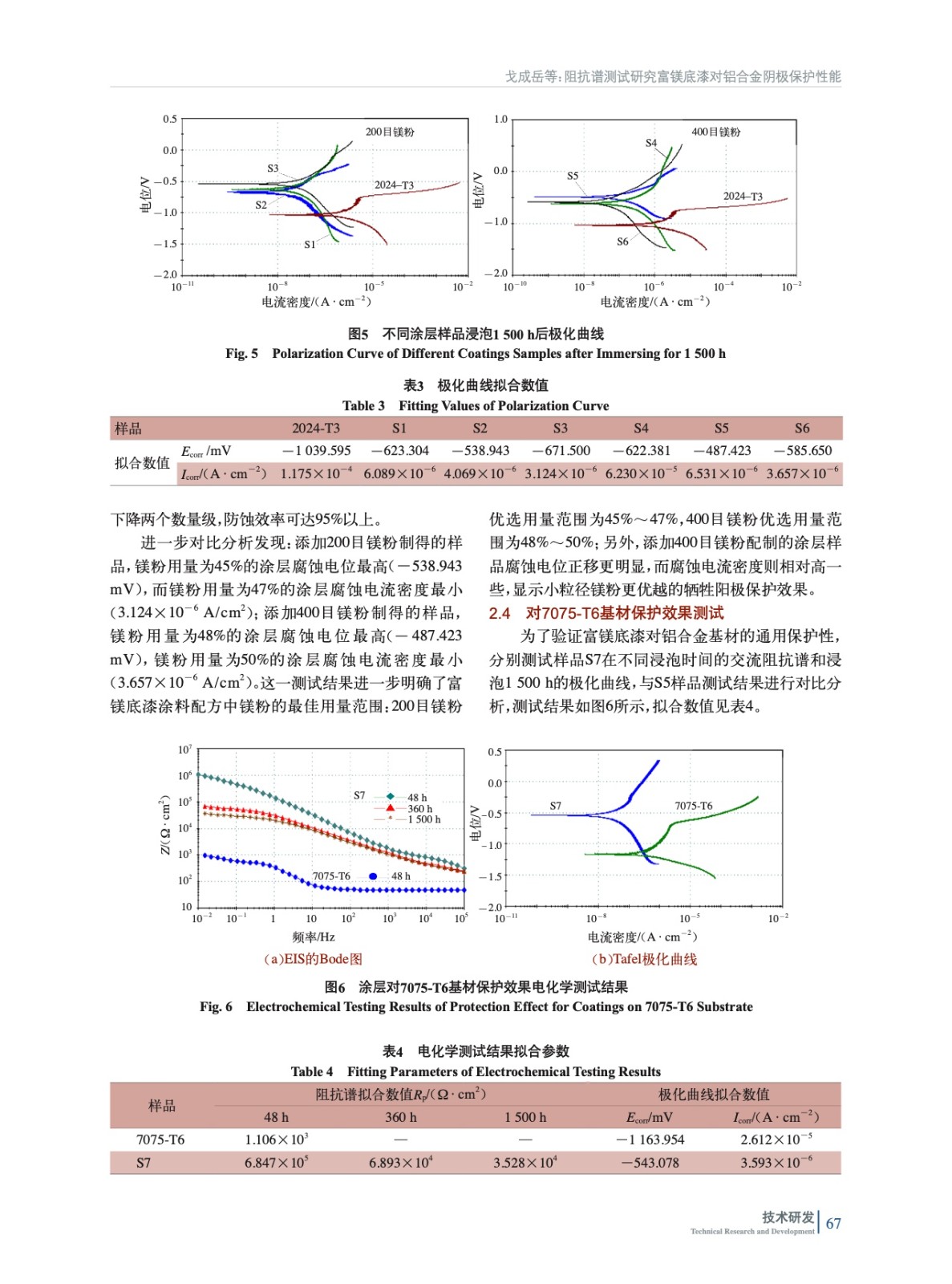 摘要:選用200目和400目兩種細(xì)度的鎂粉分別配制了不同的涂層樣品,金相顯微鏡觀察表明,良好的分散要求下,200目鎂粉可添加至47%(質(zhì)量分?jǐn)?shù),后同),而400目鎂粉可添加至50%以上;阻抗譜測試結(jié)果表明,環(huán)氧–富鎂底漆對(duì)鋁合金基體不提供長效屏蔽保護(hù)作用,且無鈍化膜產(chǎn)生。極化曲線測試結(jié)果進(jìn)一步表明,富鎂底漆對(duì)鋁合金基材的保護(hù)來自于抑制陽極反應(yīng)的陰極保護(hù)機(jī)制,最佳保護(hù)效果下鎂粉用量為:200目45%~47%,400目48%~50%;涂層分別涂覆在2024-T3和7075-T6兩種型號(hào)鋁合金基材表面,防護(hù)效果對(duì)比表明,富鎂底漆對(duì)鋁合金具有通用保護(hù)效果。