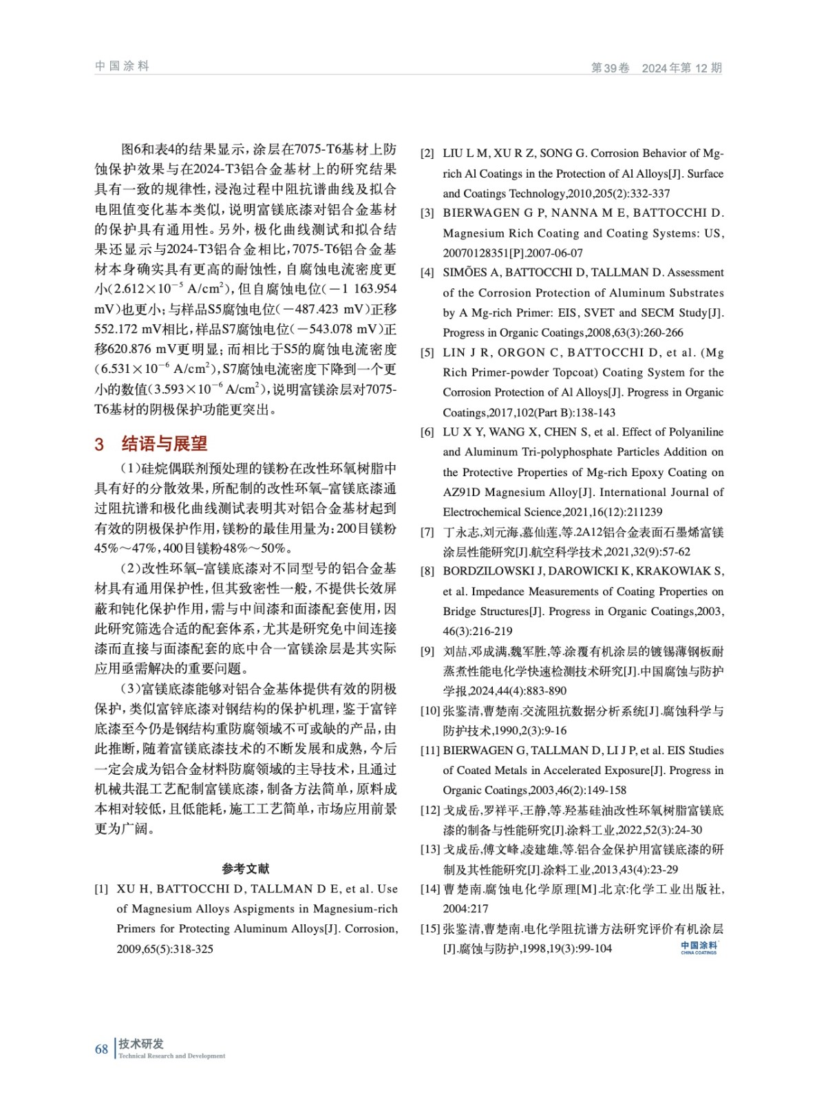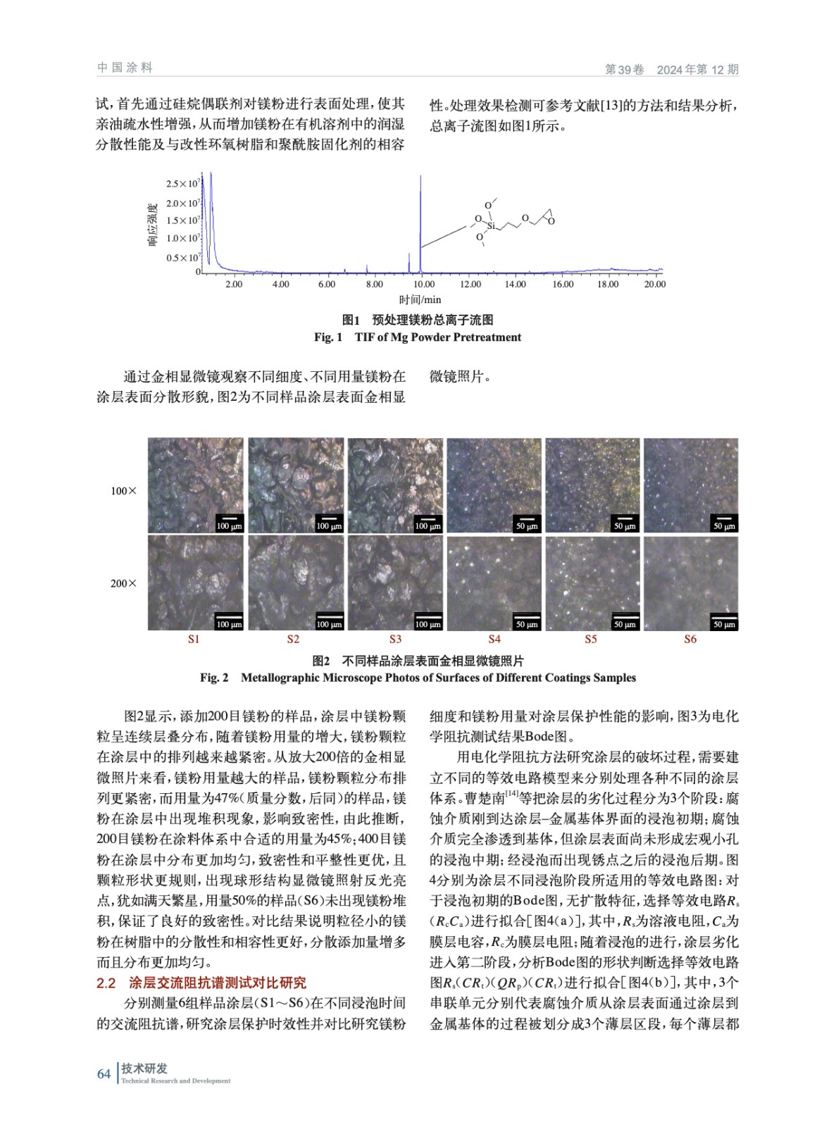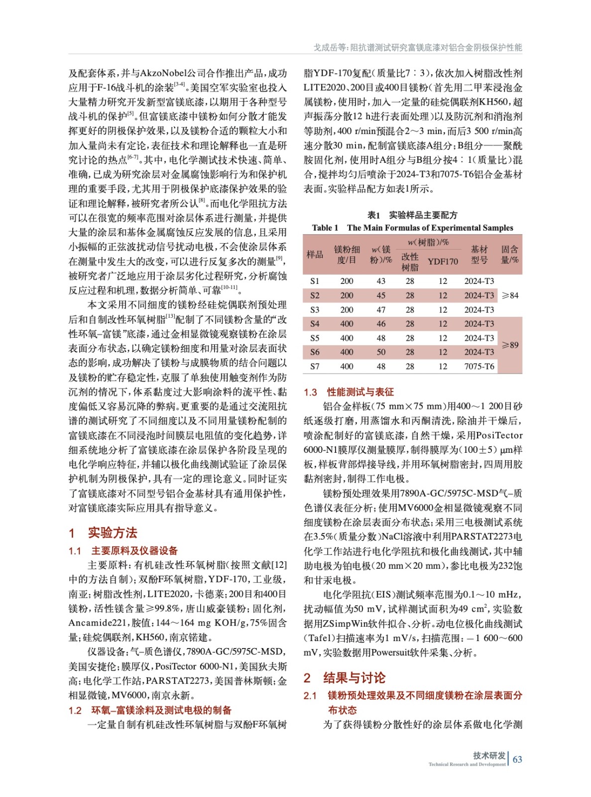 摘要:選用200目和400目兩種細(xì)度的鎂粉分別配制了不同的涂層樣品,金相顯微鏡觀察表明,良好的分散要求下,200目鎂粉可添加至47%(質(zhì)量分?jǐn)?shù),后同),而400目鎂粉可添加至50%以上;阻抗譜測試結(jié)果表明,環(huán)氧–富鎂底漆對(duì)鋁合金基體不提供長效屏蔽保護(hù)作用,且無鈍化膜產(chǎn)生。極化曲線測試結(jié)果進(jìn)一步表明,富鎂底漆對(duì)鋁合金基材的保護(hù)來自于抑制陽極反應(yīng)的陰極保護(hù)機(jī)制,最佳保護(hù)效果下鎂粉用量為:200目45%~47%,400目48%~50%;涂層分別涂覆在2024-T3和7075-T6兩種型號(hào)鋁合金基材表面,防護(hù)效果對(duì)比表明,富鎂底漆對(duì)鋁合金具有通用保護(hù)效果。