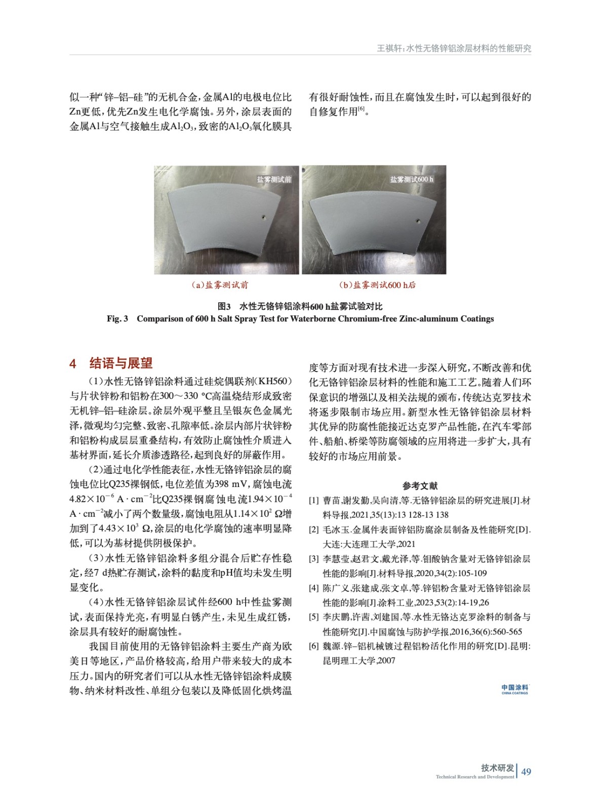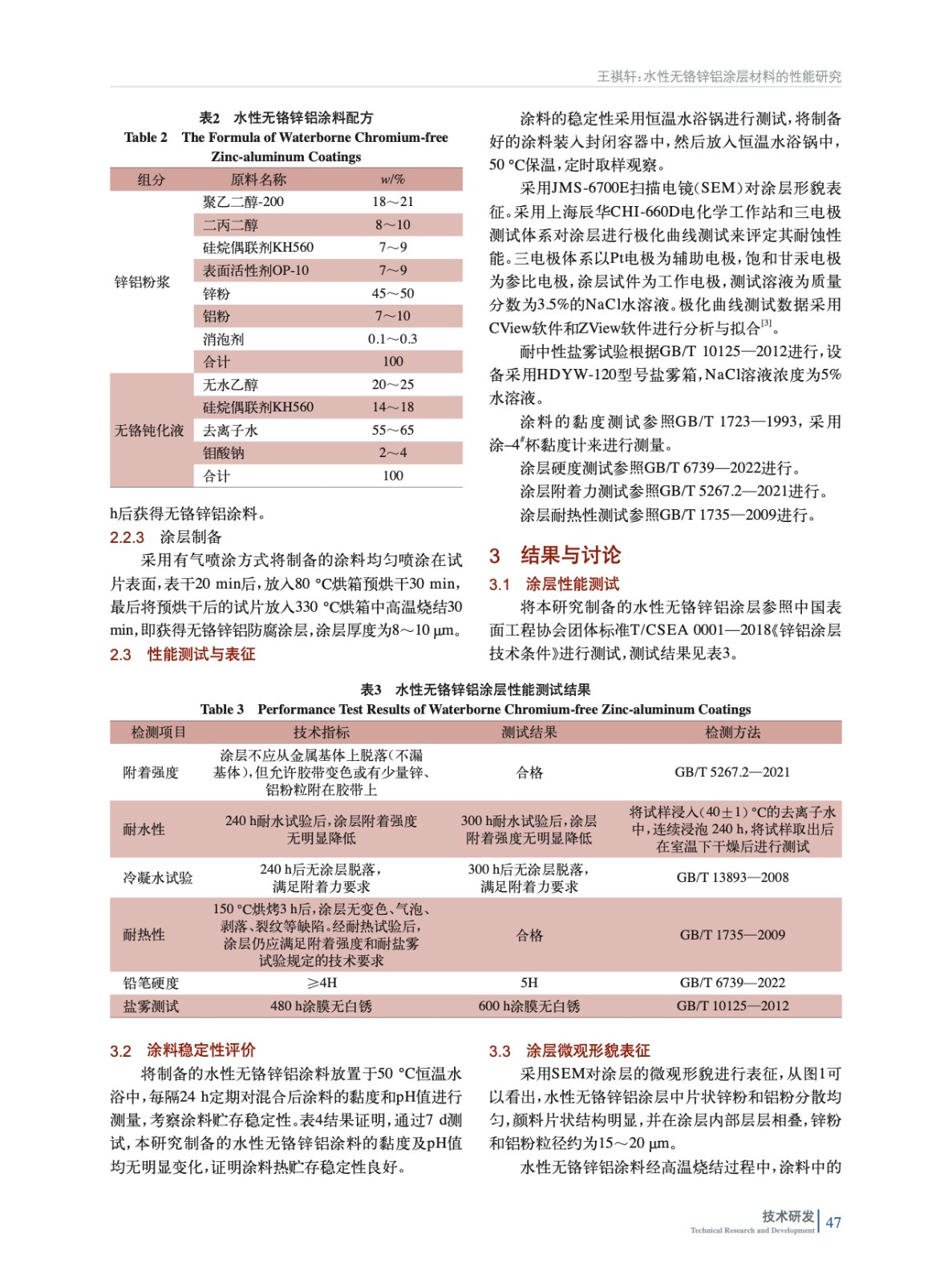摘要:研究制備了一種水性無鉻鋅鋁涂料,并對涂料熱穩(wěn)定性、微觀形貌、電化學(xué)性能及耐鹽霧性進(jìn)行測試與表征。研究表明,該涂料經(jīng)過高溫?zé)Y(jié)后,涂層內(nèi)部結(jié)構(gòu)致密,片狀結(jié)構(gòu)鋅粉和鋁粉在涂層內(nèi)部層層相疊,形成多道屏障,延長腐蝕介質(zhì)在涂層內(nèi)部的滲透路徑。該涂料具有較好的熱穩(wěn)定性,經(jīng)過7 d熱穩(wěn)定性測試,涂料的黏度和pH值均未發(fā)生明顯變化。涂層自腐蝕電位(-1.043 V)低于Q235祼鋼(-0.645 V),而且涂層自腐蝕電流(Icorr)4.82×10-6 A·cm-2比Q235祼鋼自腐蝕電流1.94×10-4 A·cm-2降低兩個(gè)數(shù)量級,腐蝕電阻從1.14×102 Ω增加到4.43×103 Ω,表明涂層的電化學(xué)腐蝕速率明顯降低,可以為基材提供陰極保護(hù)。涂層經(jīng)過600 h中性鹽霧測試后,涂膜仍然保持較好的金屬光澤,表面有很輕微白銹產(chǎn)生。