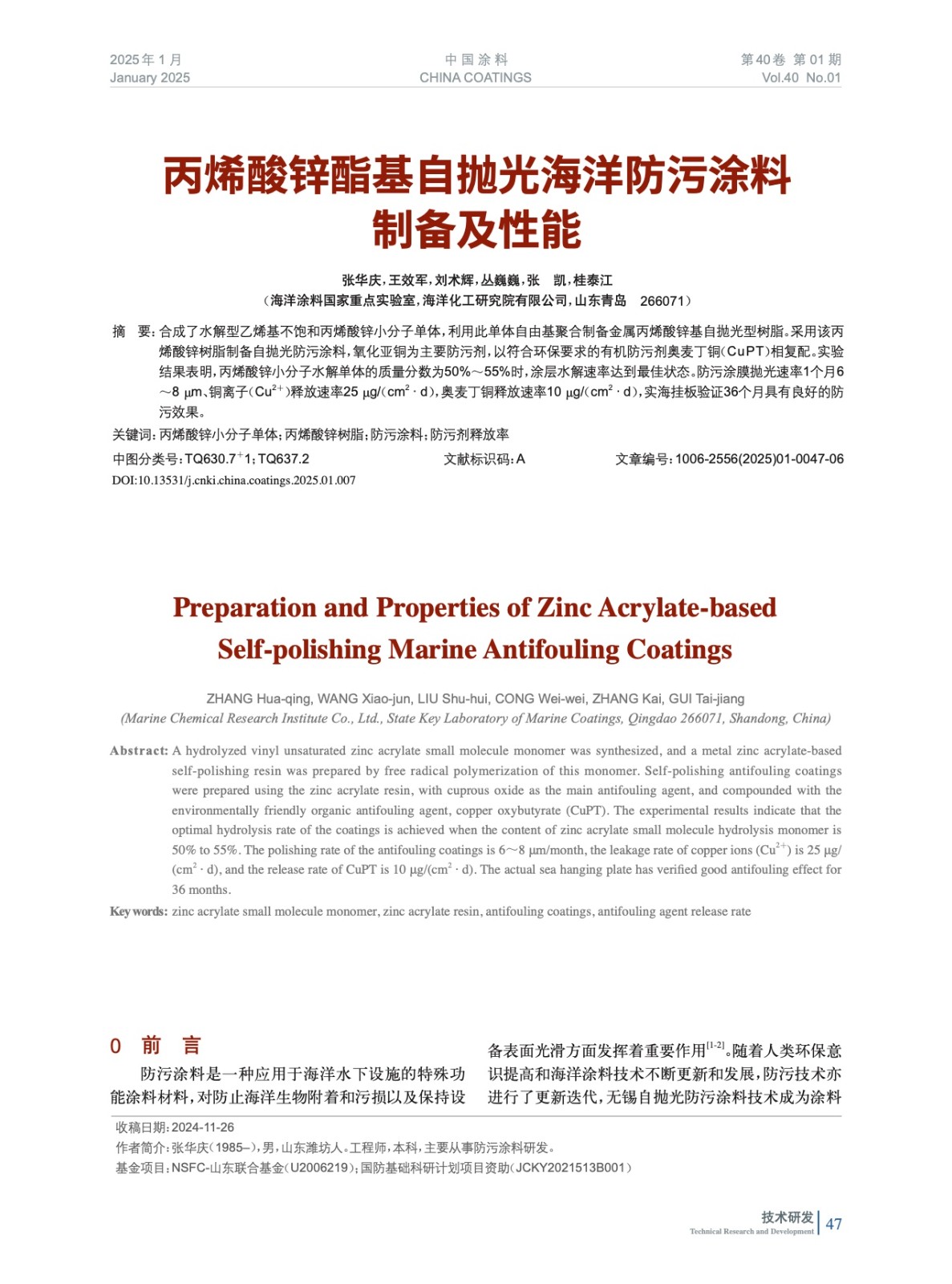丙烯酸鋅酯基自拋光海洋防污涂料制備及性能