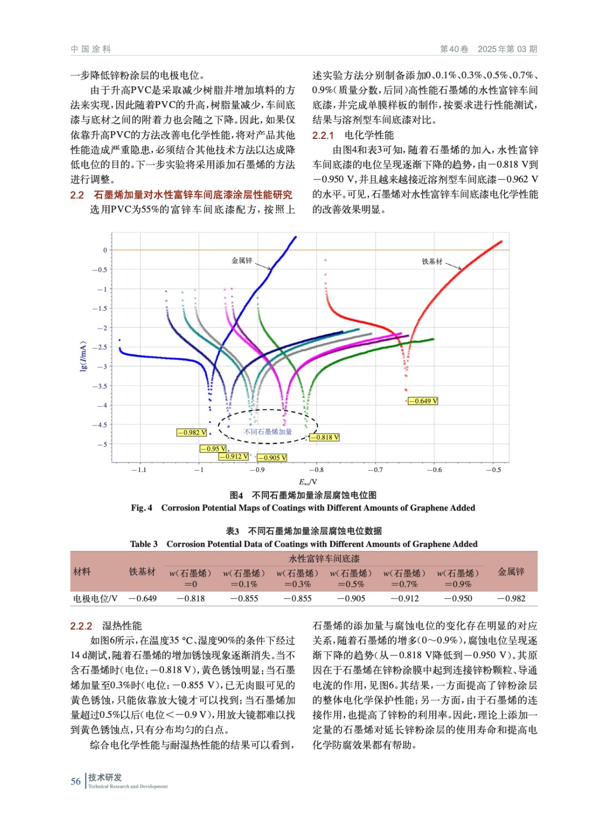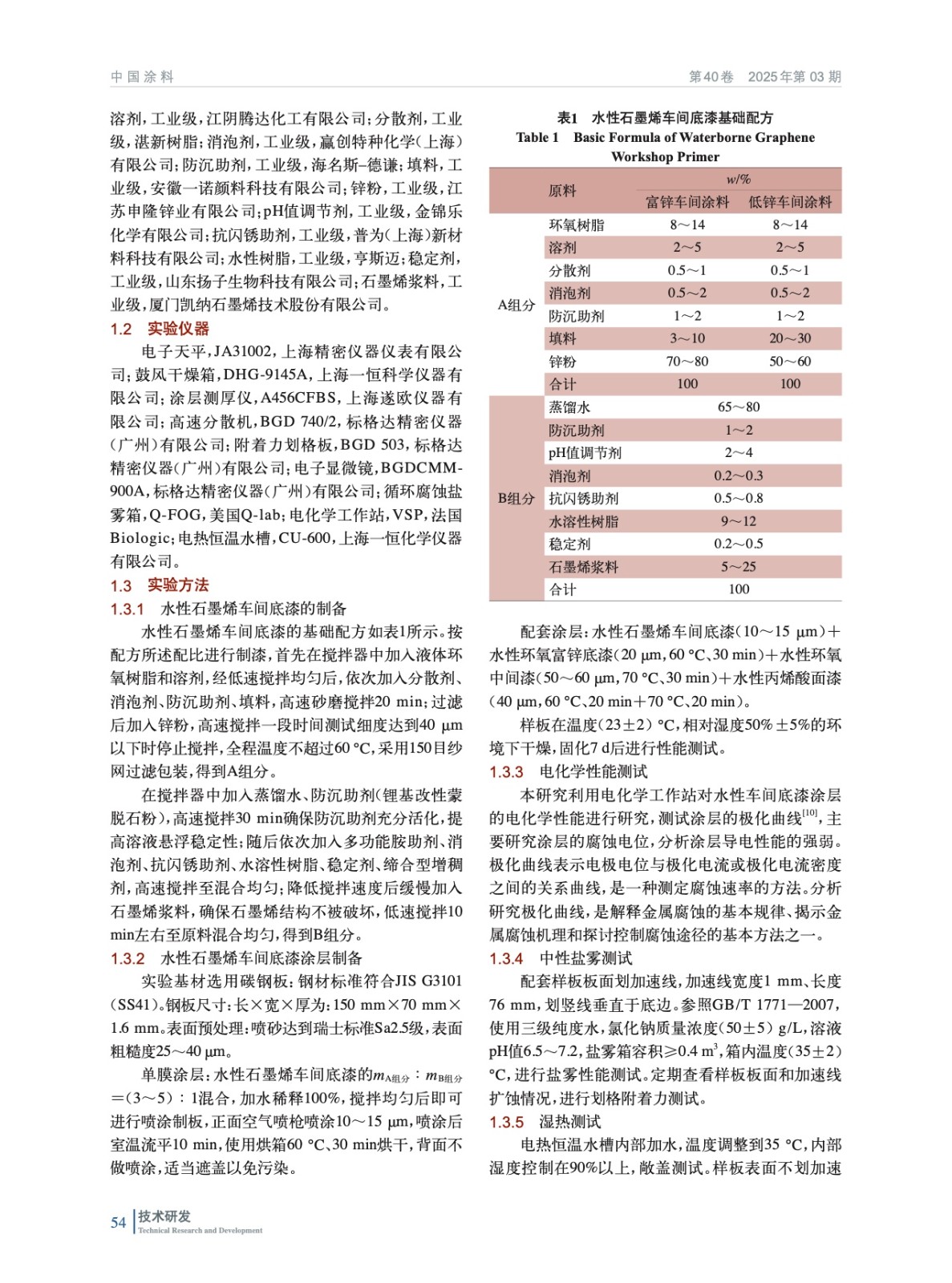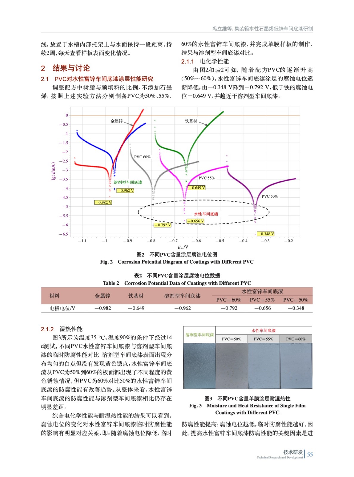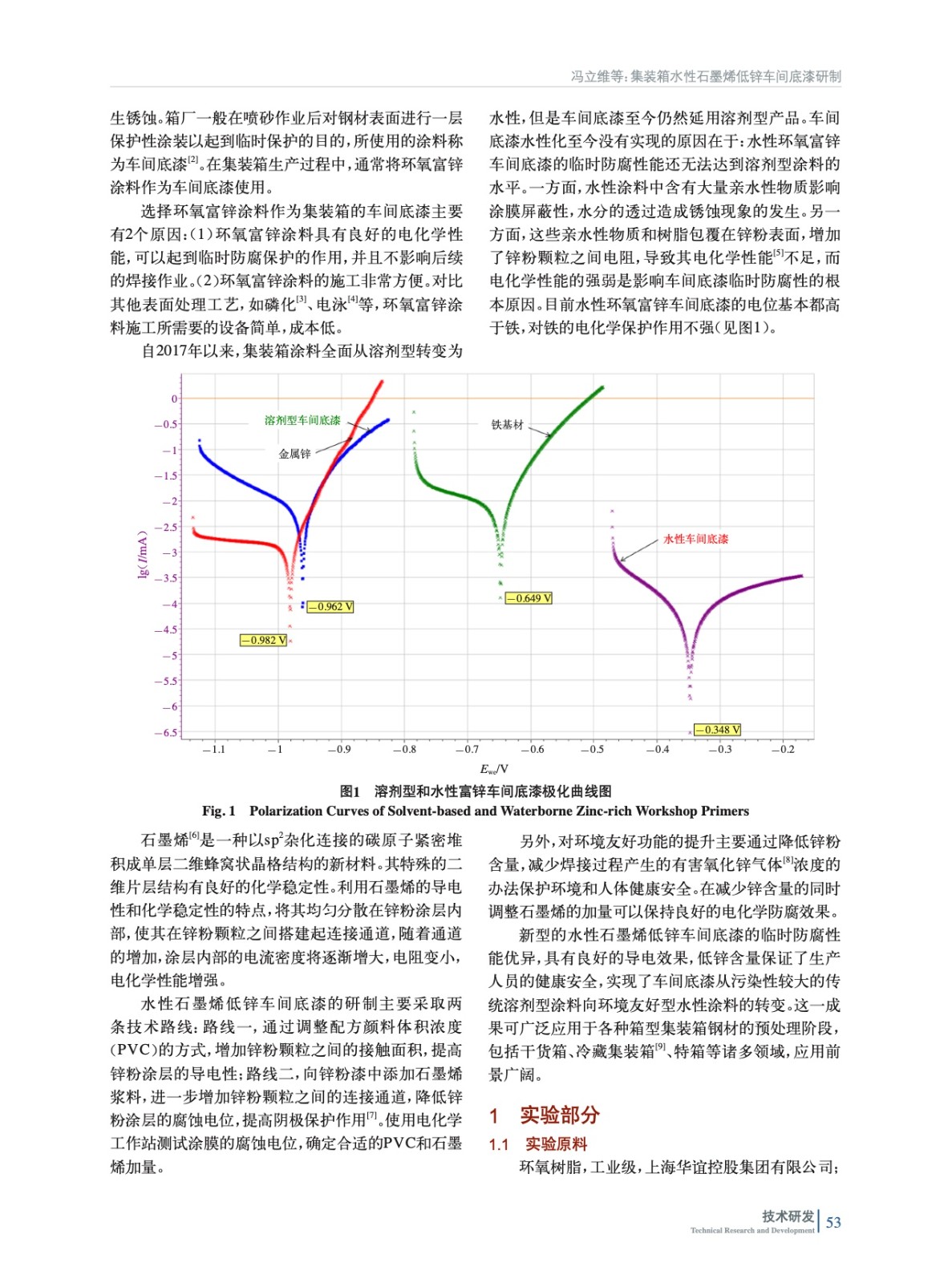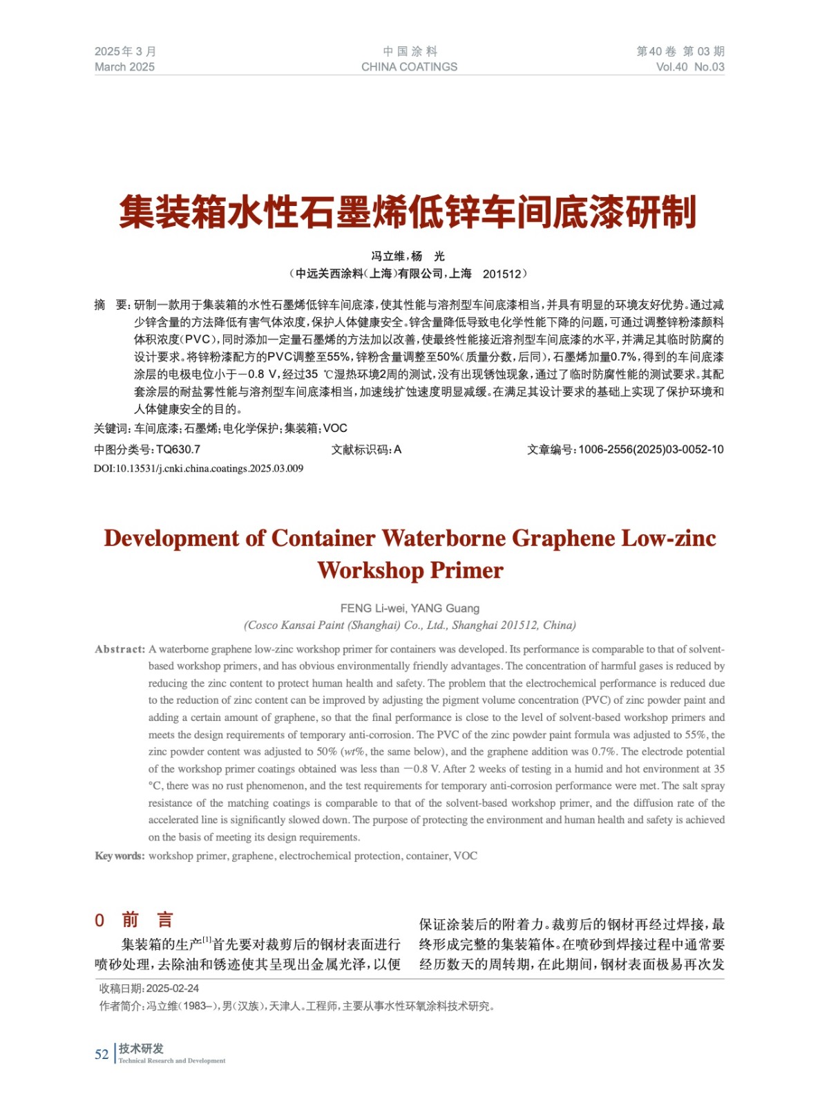 摘要:研制一款用于集裝箱的水性石墨烯低鋅車間底漆,使其性能與溶劑型車間底漆相當(dāng),并具有明顯的環(huán)境友好優(yōu)勢(shì)。通過減少鋅含量的方法降低有害氣體濃度,保護(hù)人體健康安全。鋅含量降低導(dǎo)致電化學(xué)性能下降的問題,可通過調(diào)整鋅粉漆顏料體積濃度(PVC),同時(shí)添加一定量石墨烯的方法加以改善,使最終性能接近溶劑型車間底漆的水平,并滿足其臨時(shí)防腐的設(shè)計(jì)要求。將鋅粉漆配方的PVC調(diào)整至55%,鋅粉含量調(diào)整至50%(質(zhì)量分?jǐn)?shù),后同),石墨烯加量0.7%,得到的車間底漆涂層的電極電位小于-0.8 V,經(jīng)過35 ℃濕熱環(huán)境2周的測(cè)試,沒有出現(xiàn)銹蝕現(xiàn)象,通過了臨時(shí)防腐性能的測(cè)試要求。其配套涂層的耐鹽霧性能與溶劑型車間底漆相當(dāng),加速線擴(kuò)蝕速度明顯減緩。在滿足其設(shè)計(jì)要求的基礎(chǔ)上實(shí)現(xiàn)了保護(hù)環(huán)境和人體健康安全的目的。
