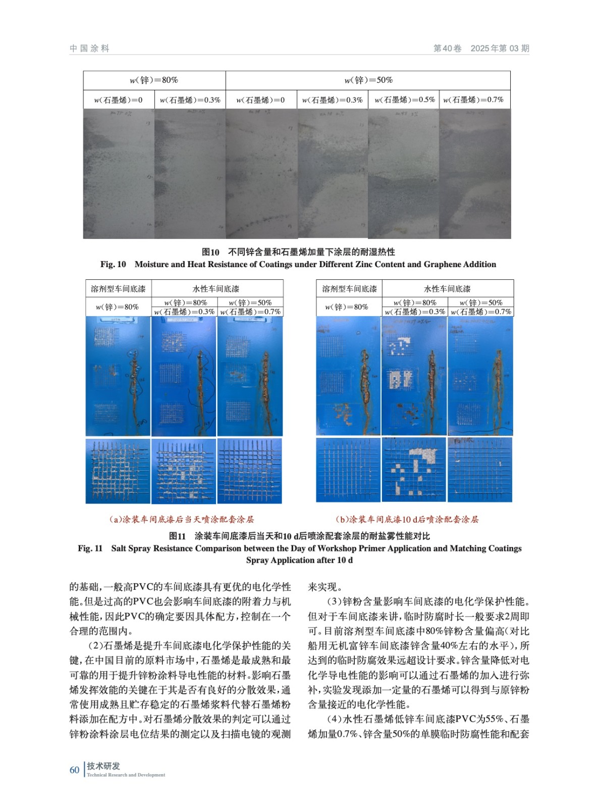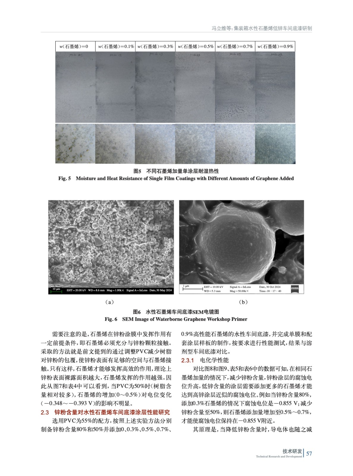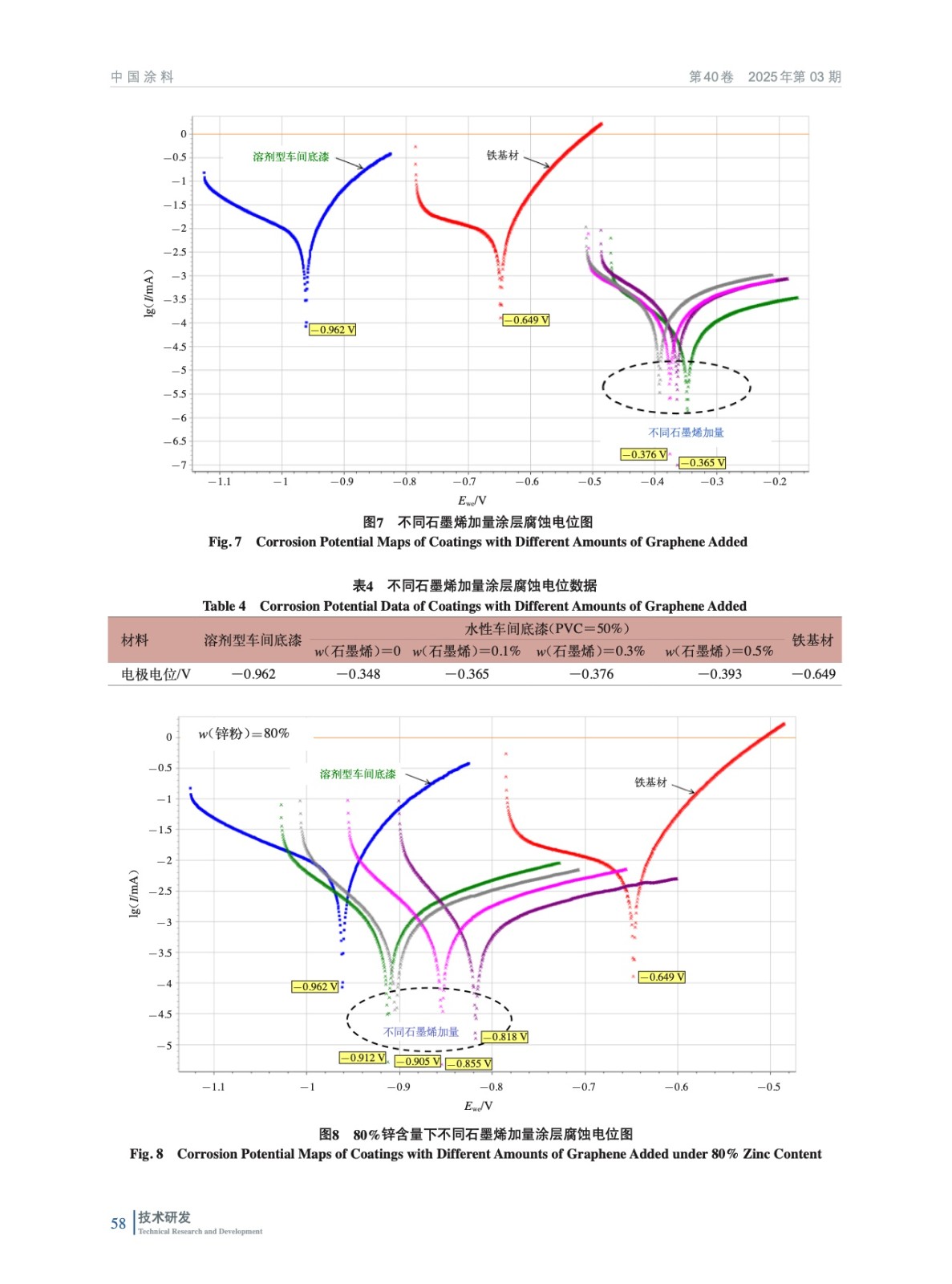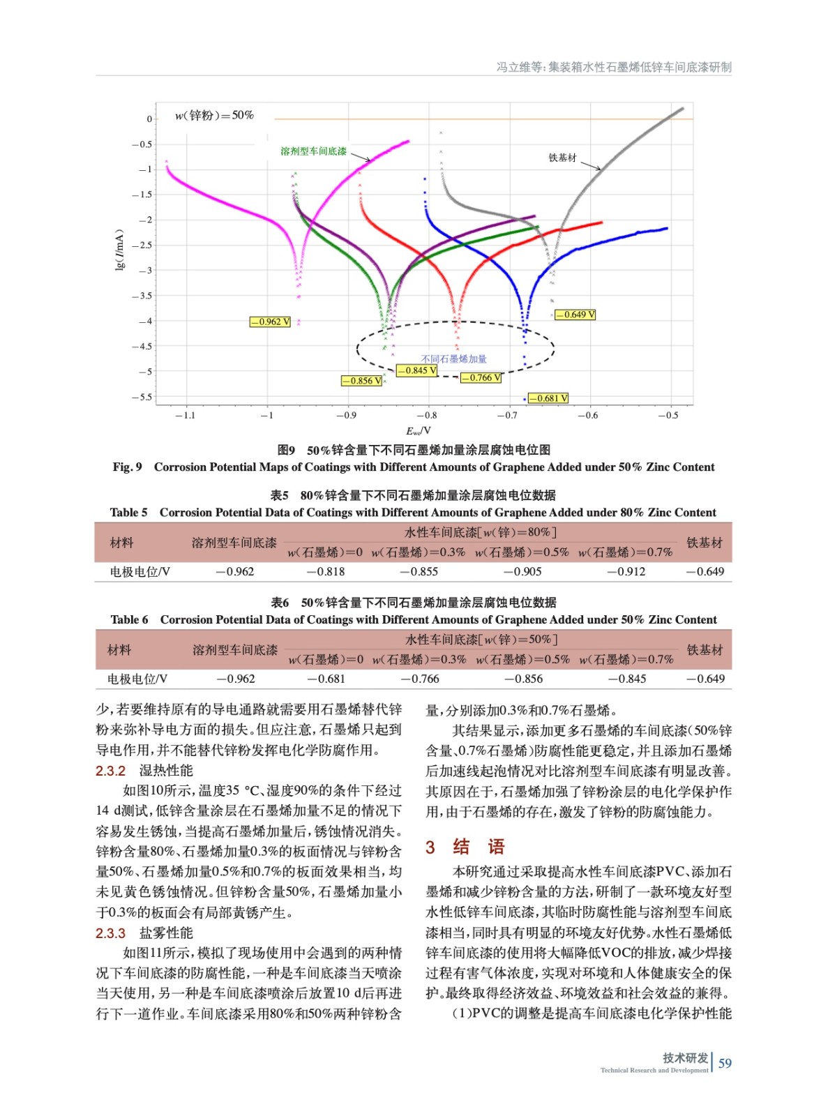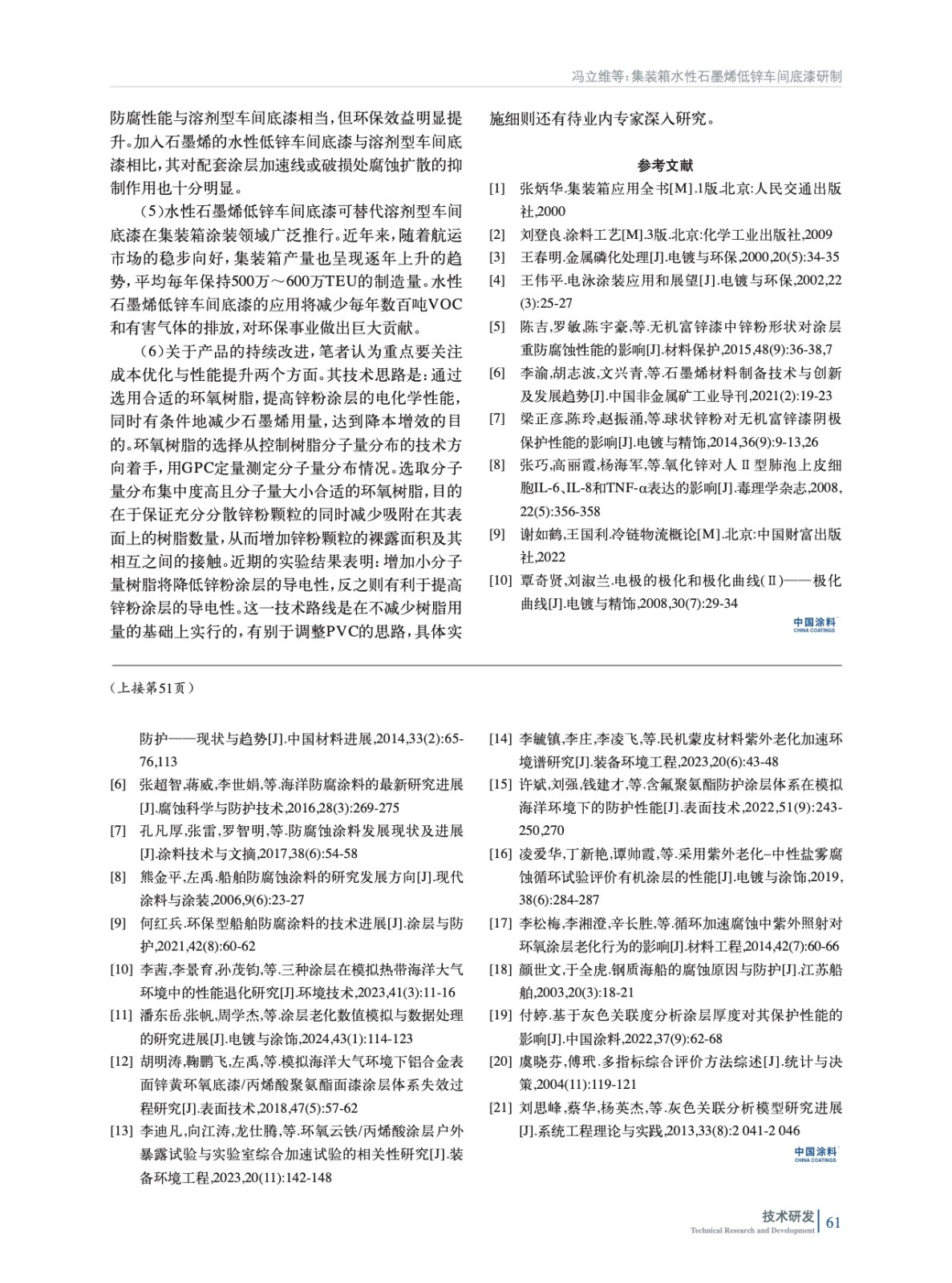 摘要:研制一款用于集裝箱的水性石墨烯低鋅車間底漆,使其性能與溶劑型車間底漆相當(dāng),并具有明顯的環(huán)境友好優(yōu)勢(shì)。通過減少鋅含量的方法降低有害氣體濃度,保護(hù)人體健康安全。鋅含量降低導(dǎo)致電化學(xué)性能下降的問題,可通過調(diào)整鋅粉漆顏料體積濃度(PVC),同時(shí)添加一定量石墨烯的方法加以改善,使最終性能接近溶劑型車間底漆的水平,并滿足其臨時(shí)防腐的設(shè)計(jì)要求。將鋅粉漆配方的PVC調(diào)整至55%,鋅粉含量調(diào)整至50%(質(zhì)量分?jǐn)?shù),后同),石墨烯加量0.7%,得到的車間底漆涂層的電極電位小于-0.8 V,經(jīng)過35 ℃濕熱環(huán)境2周的測(cè)試,沒有出現(xiàn)銹蝕現(xiàn)象,通過了臨時(shí)防腐性能的測(cè)試要求。其配套涂層的耐鹽霧性能與溶劑型車間底漆相當(dāng),加速線擴(kuò)蝕速度明顯減緩。在滿足其設(shè)計(jì)要求的基礎(chǔ)上實(shí)現(xiàn)了保護(hù)環(huán)境和人體健康安全的目的。